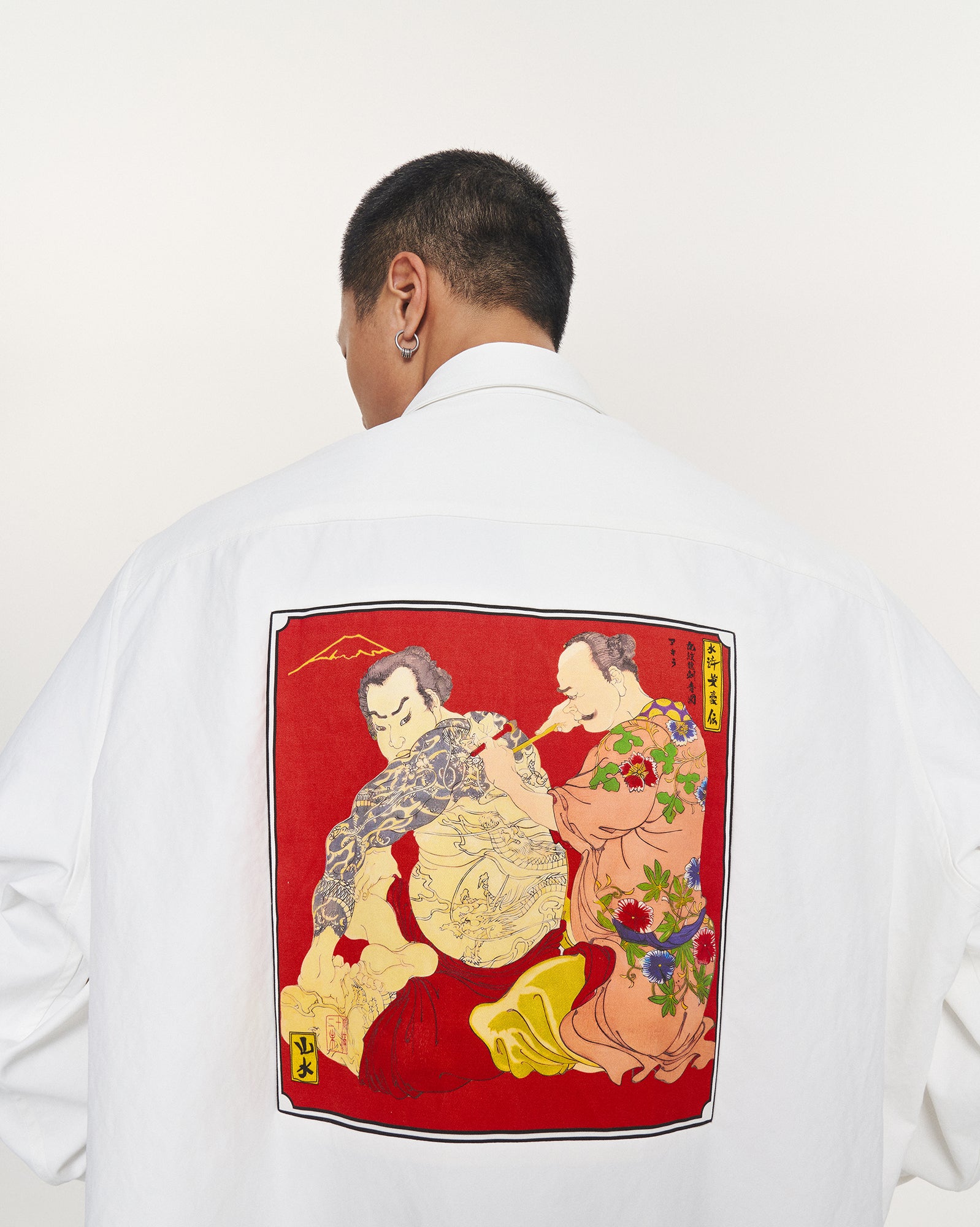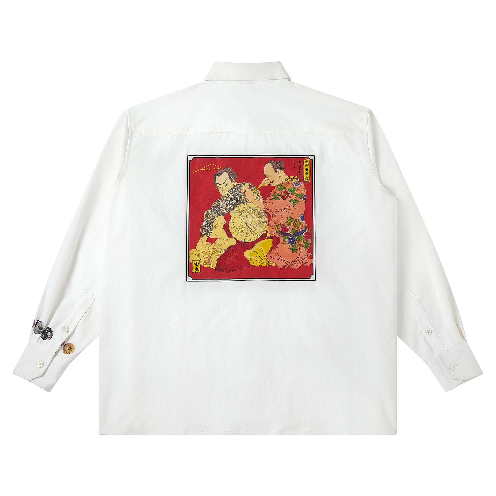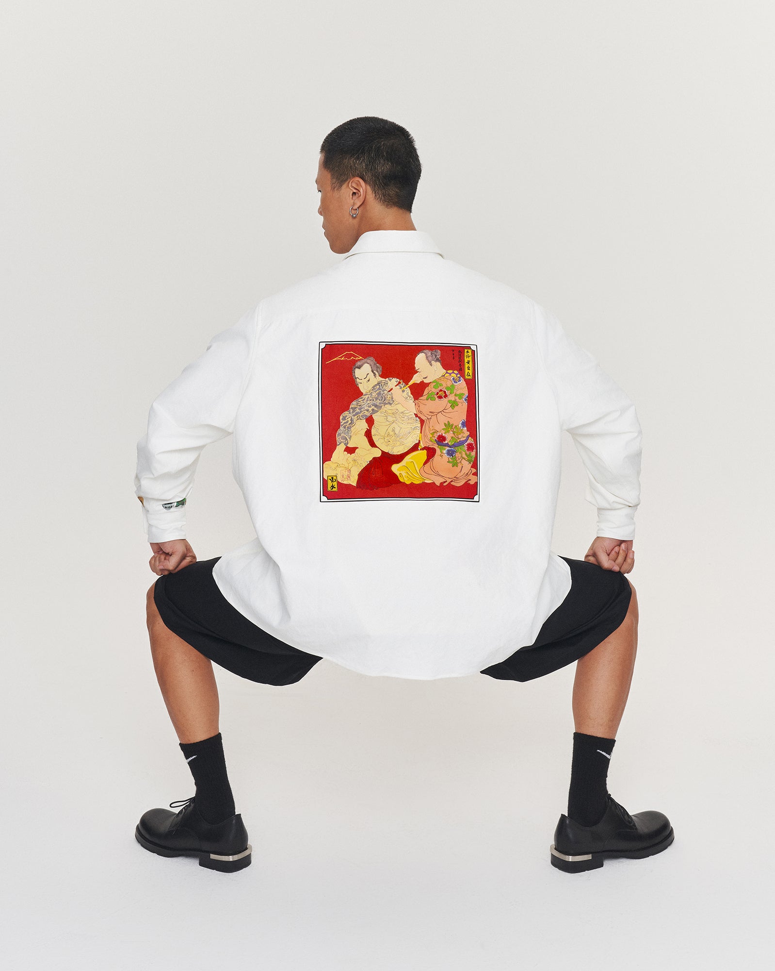 The graphic design comes from the famous ukiyo-e masterpiece Portrait of Shi Jin, featuring the first Liangshan hero character to appear in The Water Margin. We meticulously crafted this work using specialized pure cotton fabric, then hollowed out the back of the shirt and "embedded" the print into it, creating a three-dimensional visual effect that is vivid and layered. The left sleeve cuff of the shirt is adorned with a colorful TenGu Daruma figure designed by the founder, resembling a bracelet encircling the cuff, adding unique cultural symbols and personal style.
