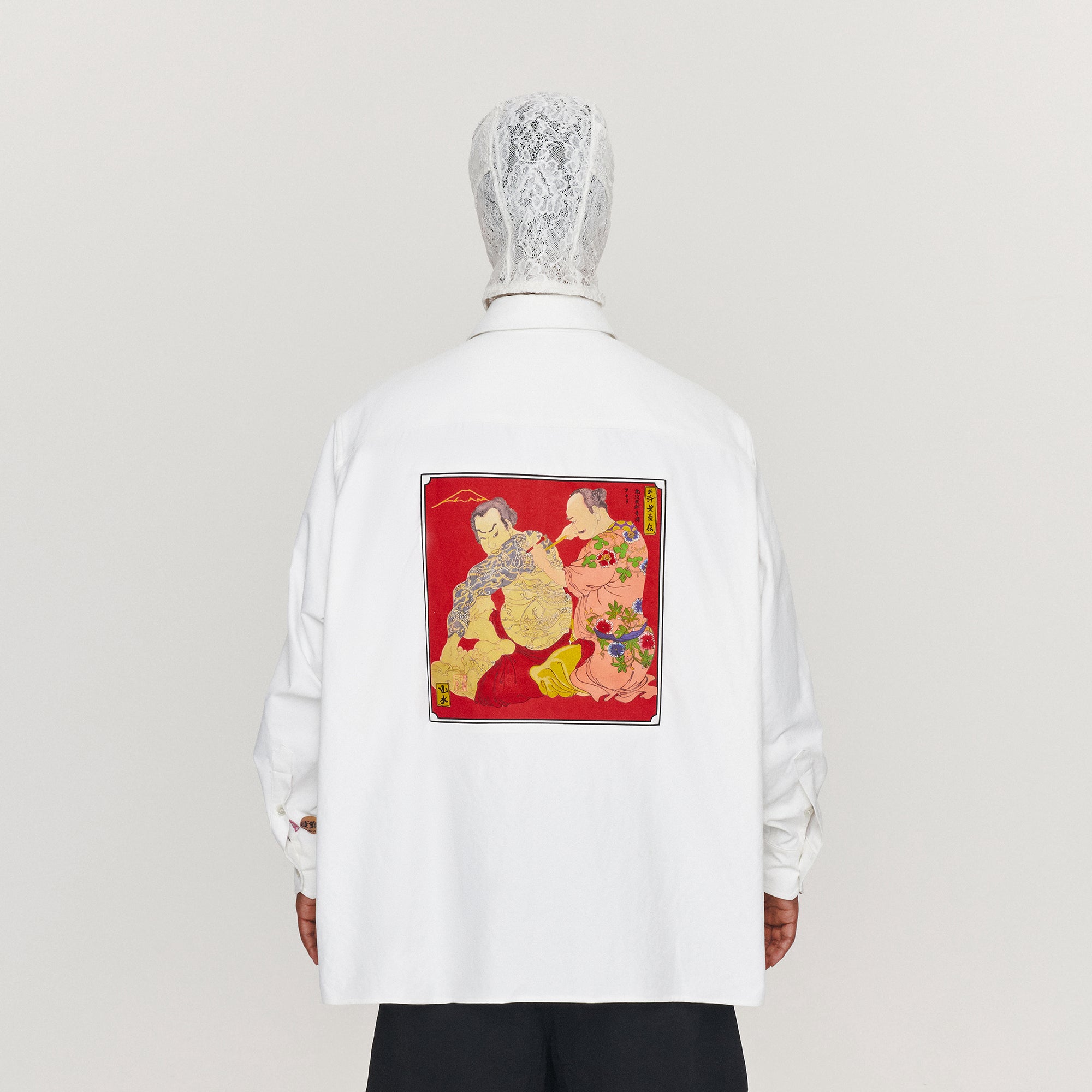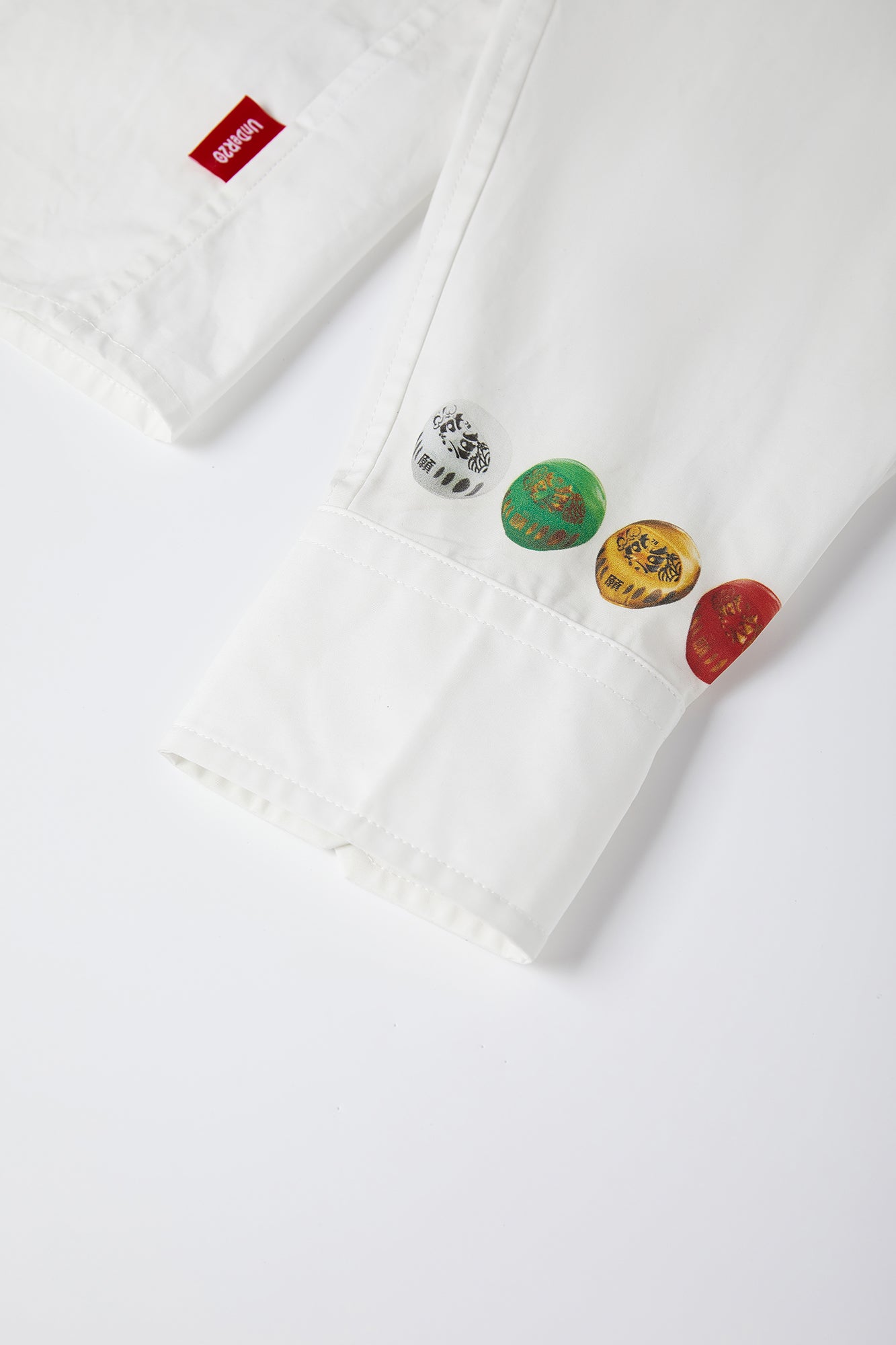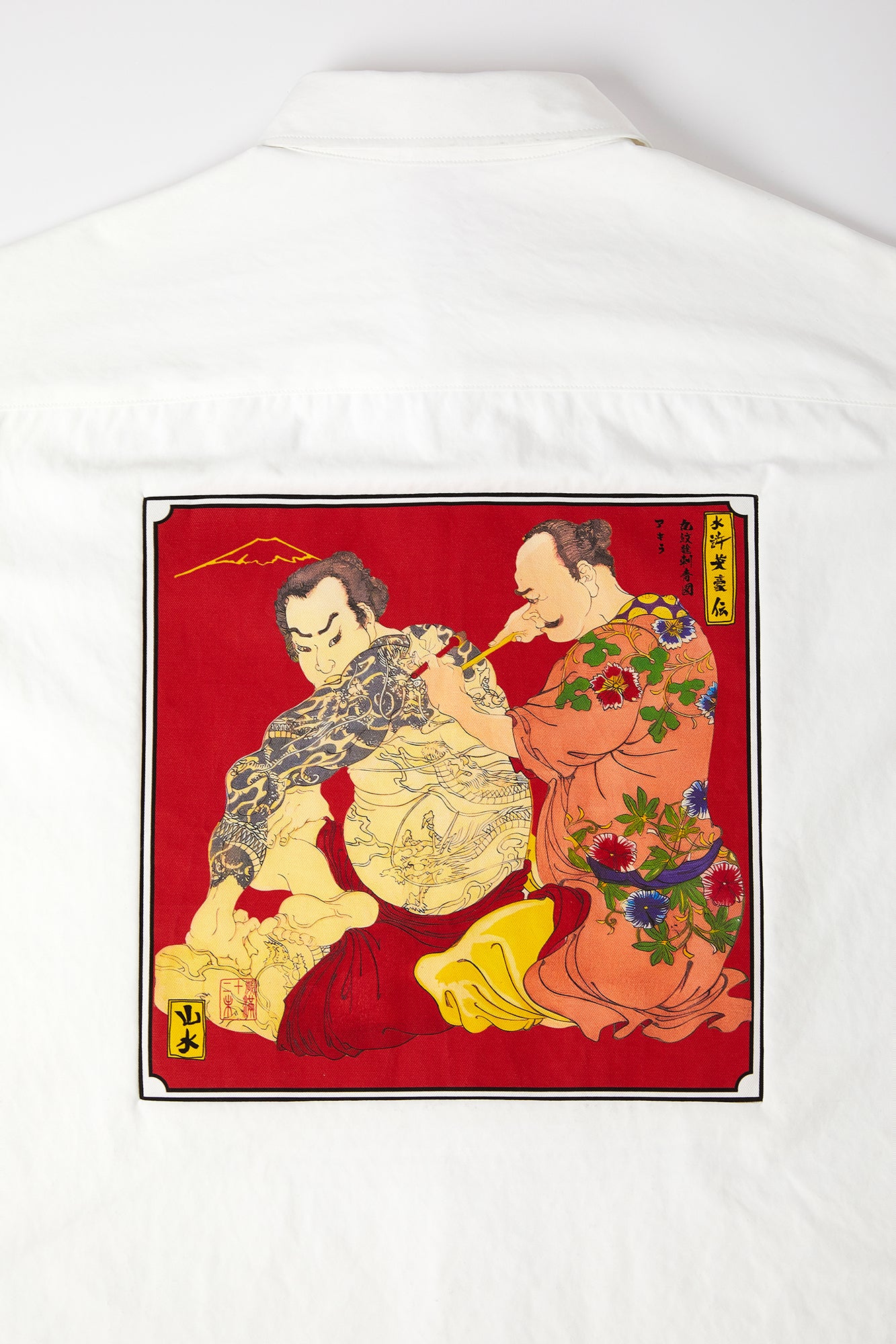 The graphic design comes from the famous ukiyo-e masterpiece Portrait of Shi Jin, featuring the first Liangshan hero character to appear in The Water Margin. We meticulously crafted this work using specialized pure cotton fabric, then hollowed out the back of the shirt and "embedded" the print into it, creating a three-dimensional visual effect that is vivid and layered. The left sleeve cuff of the shirt is adorned with a colorful TenGu Daruma figure designed by the founder, resembling a bracelet encircling the cuff, adding unique cultural symbols and personal style.