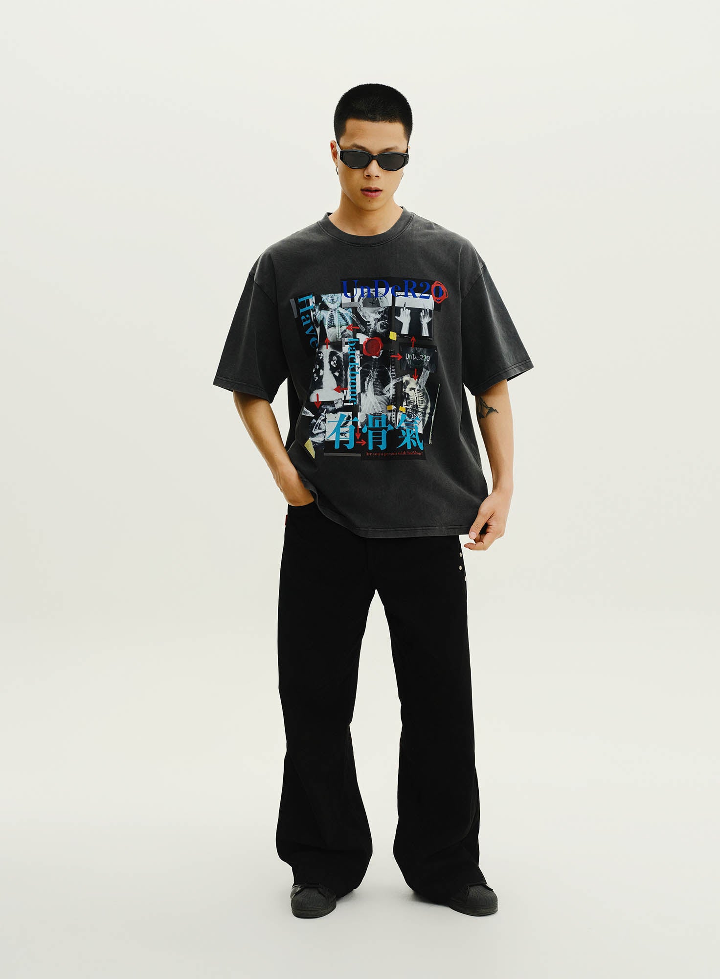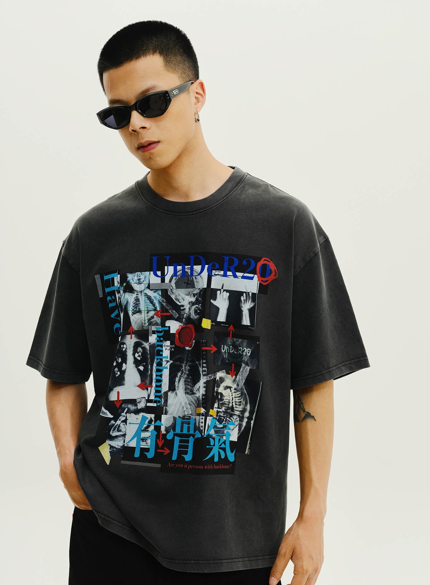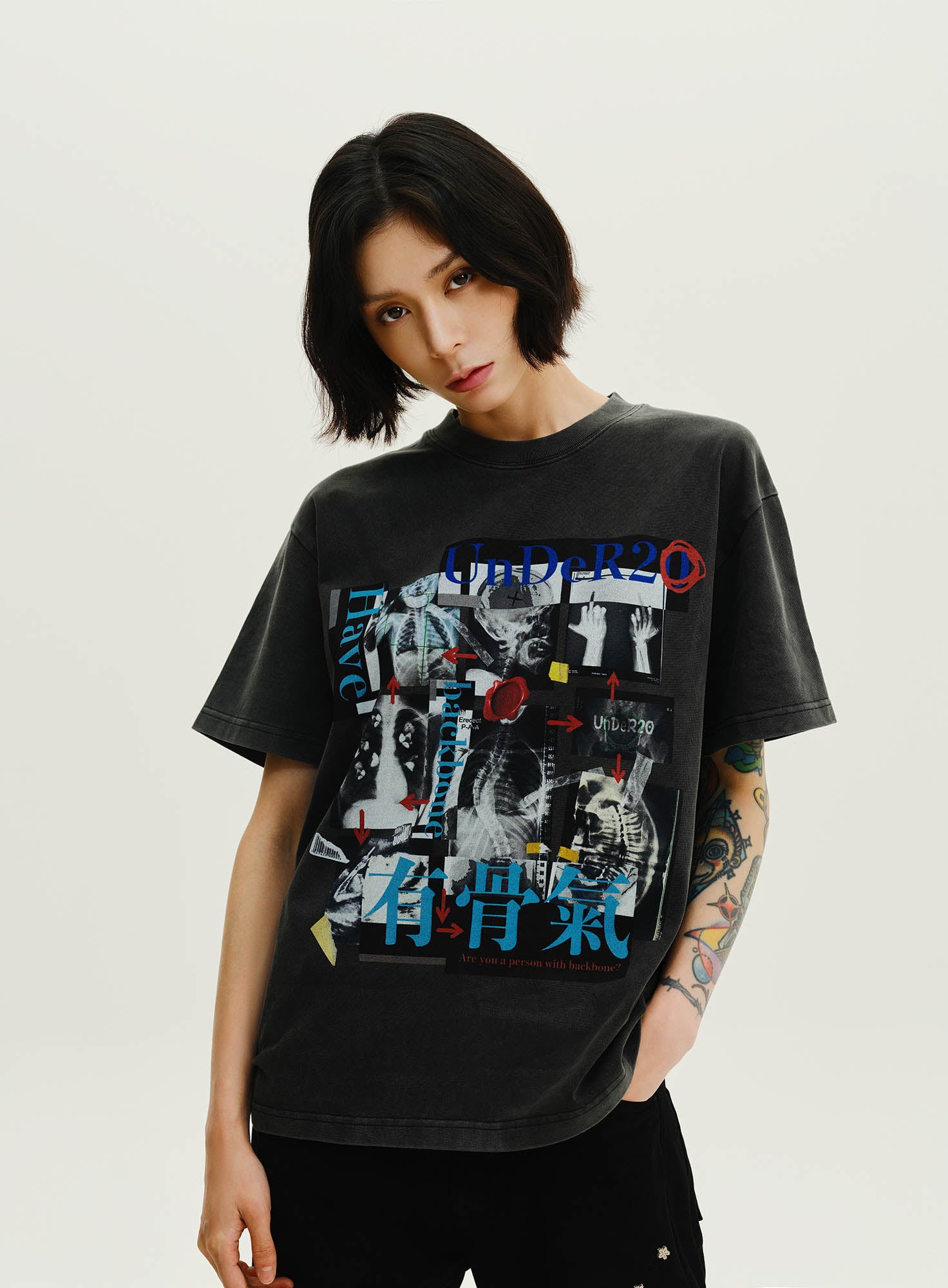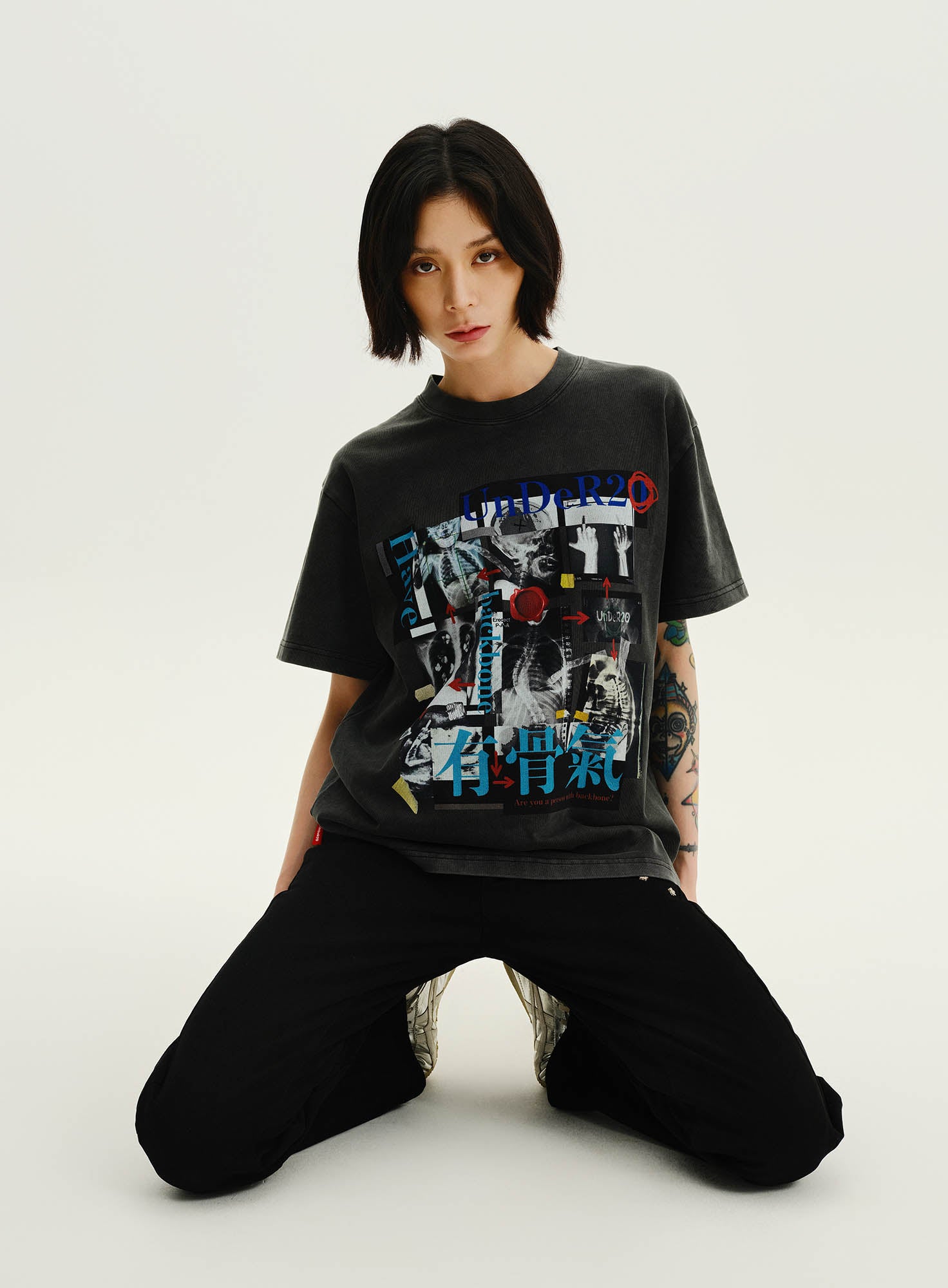 The Got Backbone? tee from UnDeR20 explores this question through a surreal X-ray collage—each figure a metaphor, each “scan” a glimpse into the unseen. One shows a pair of nails crossed inside the skull—stubbornness, or maybe thoughts pinned down by reality. Another throws up a cheerful peace sign, born with natural optimism. Someone else flips the bird with both hands—no words needed to show their defiance. One torso is filled with butterflies, a soft-hearted romantic through and through. Another has a crooked spine—physical deformity, or twisted psyche?