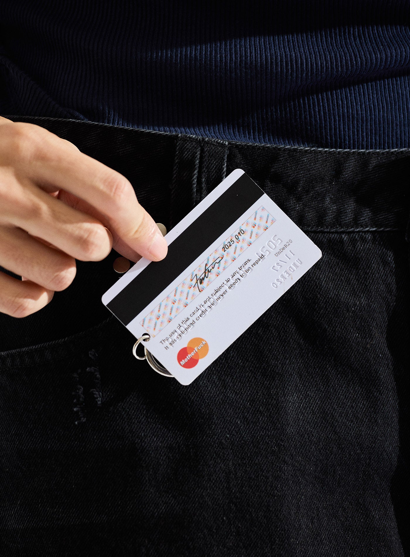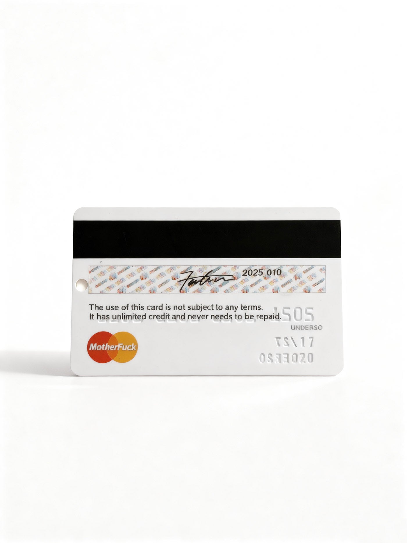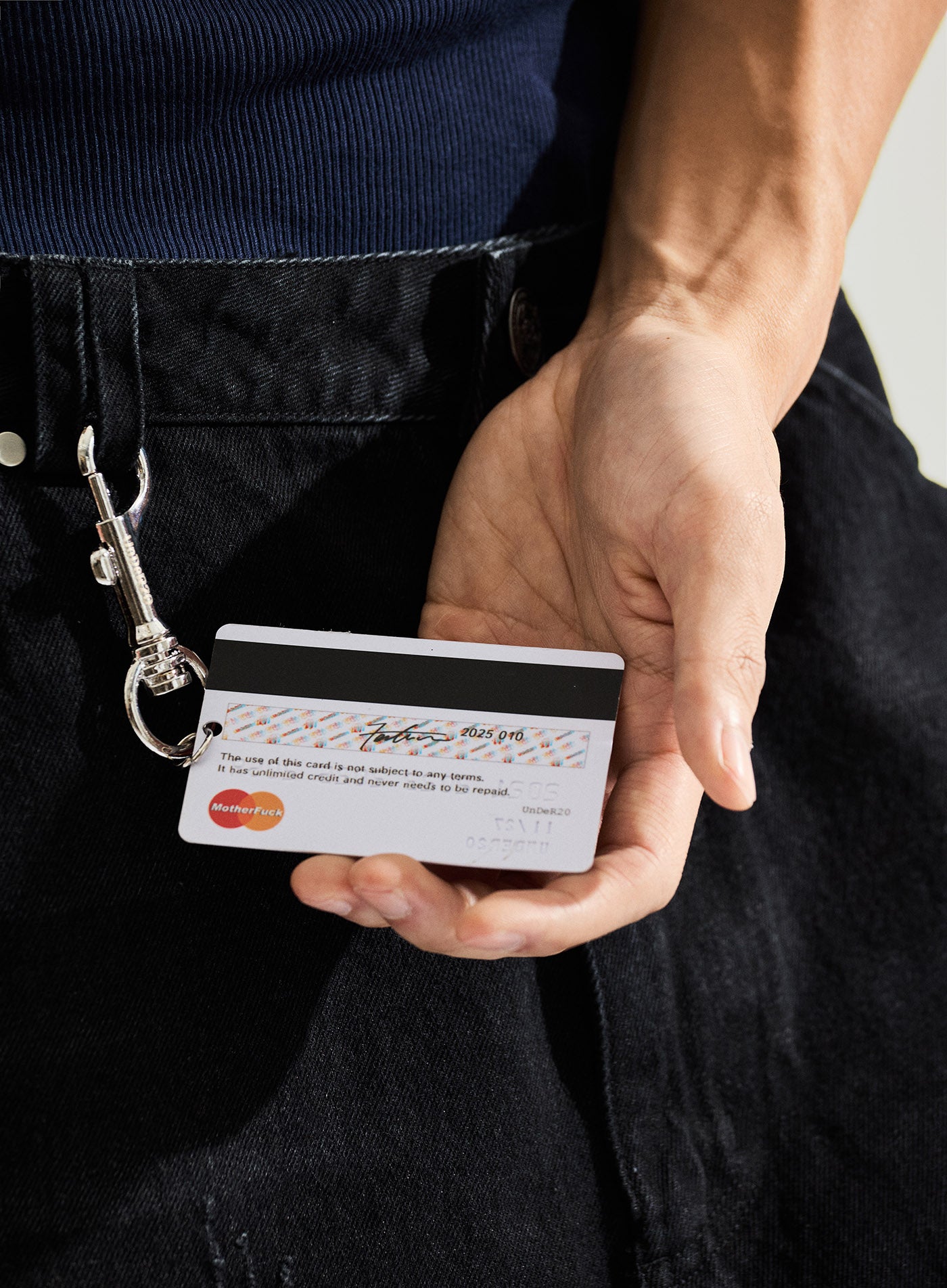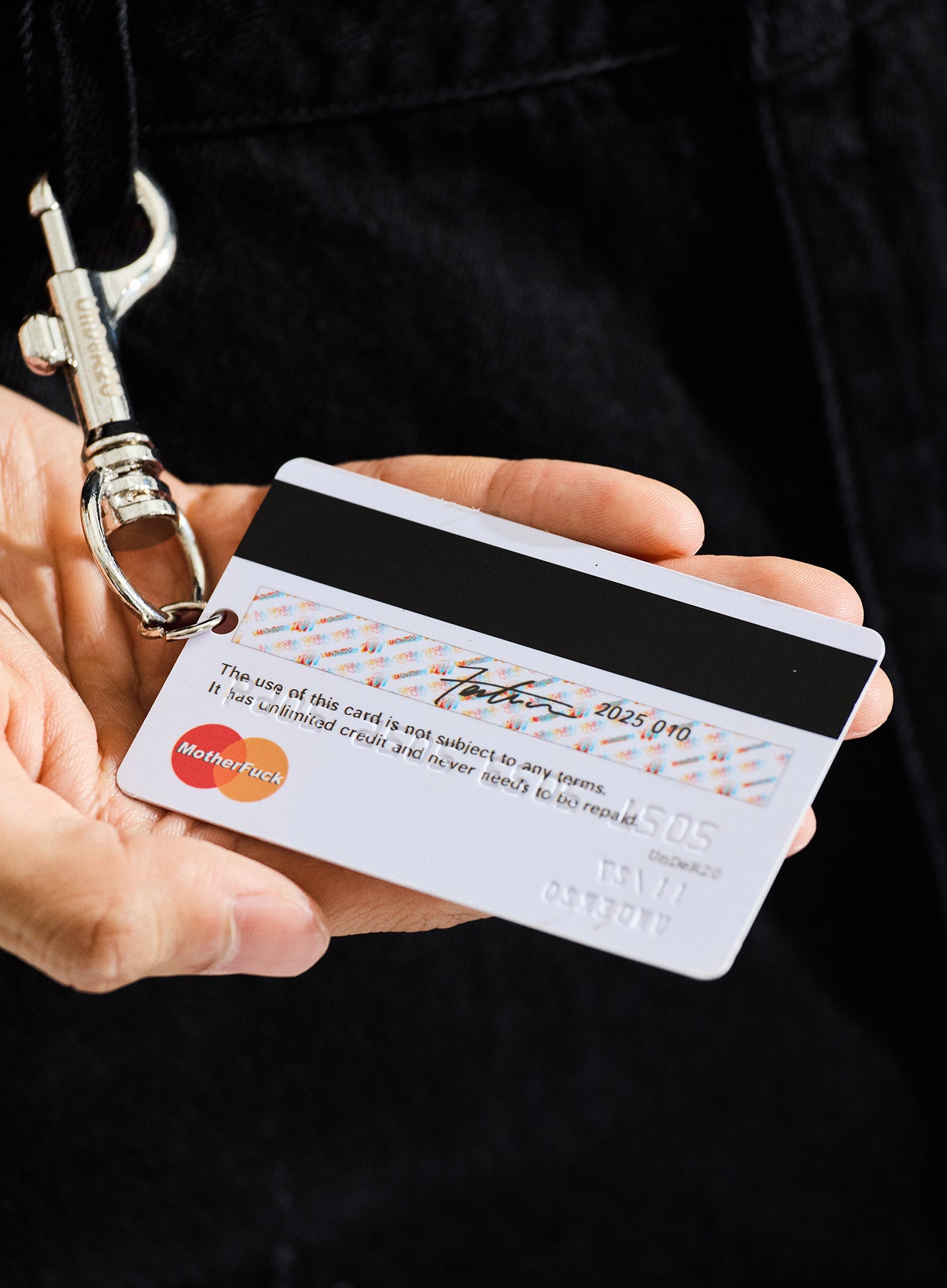 Real credit-card material, a real chip, and realistic wording. The card number is 2021 2023 2025 xxxx — the last four digits are dynamic and different on each card. The first three groups are obviously years: 2021 (when the UnDeR20 toy brand was founded), 2023 (when the clothing line was launched), and this year, 2025. Expiration date: 11/27 — my idol Bruce Lee’s birth date. The card’s issuer is a parody of Mastercard, turned into “MotherFuck.”