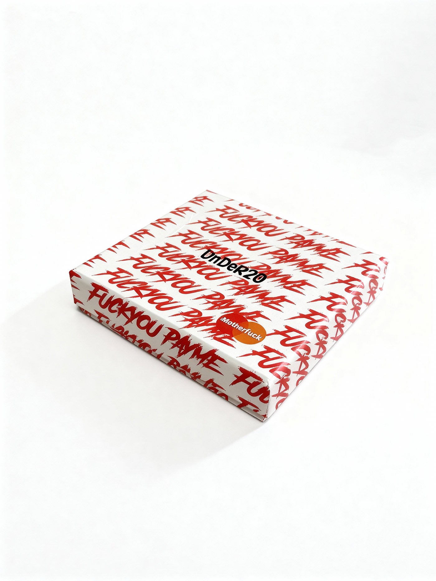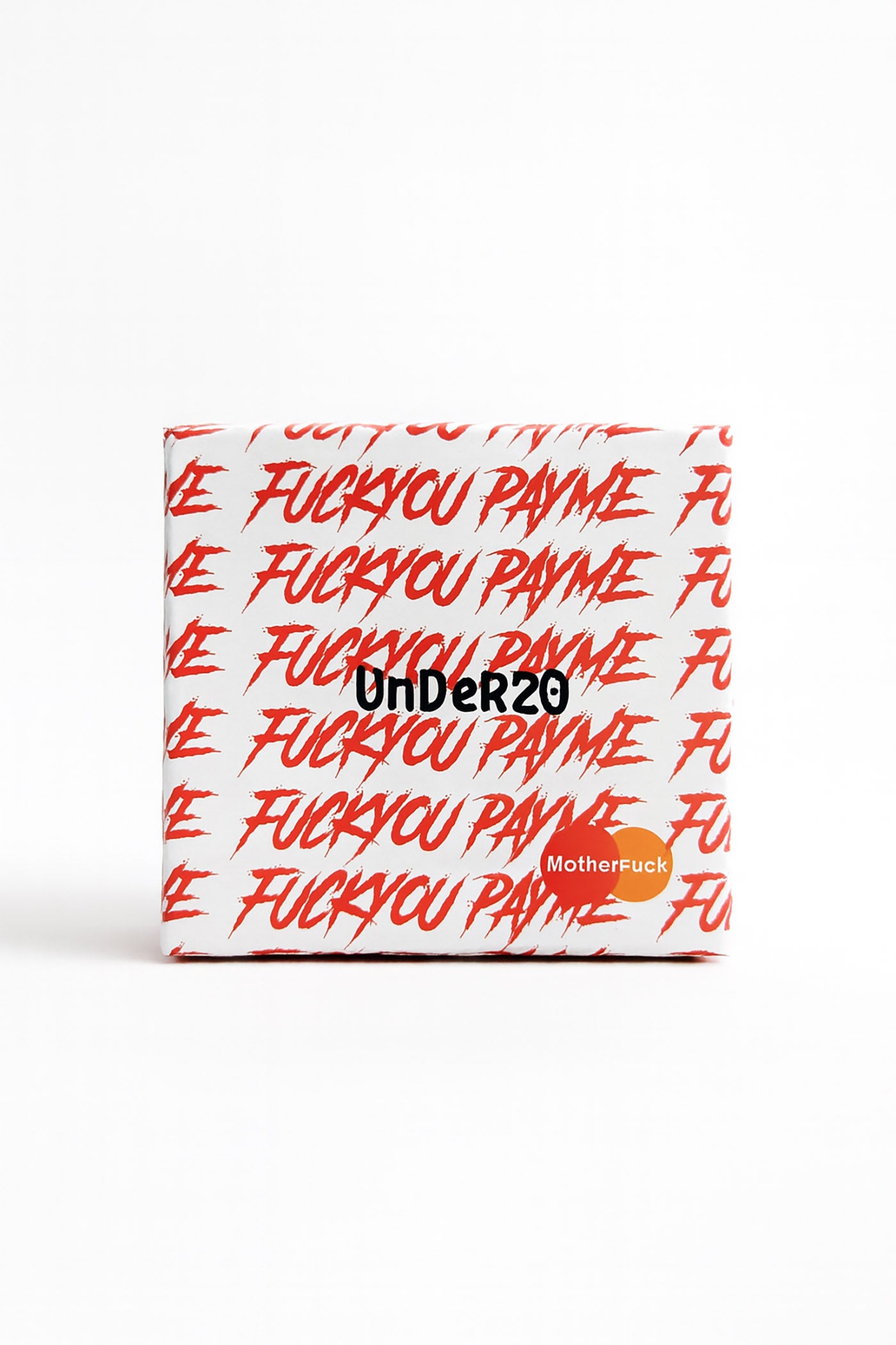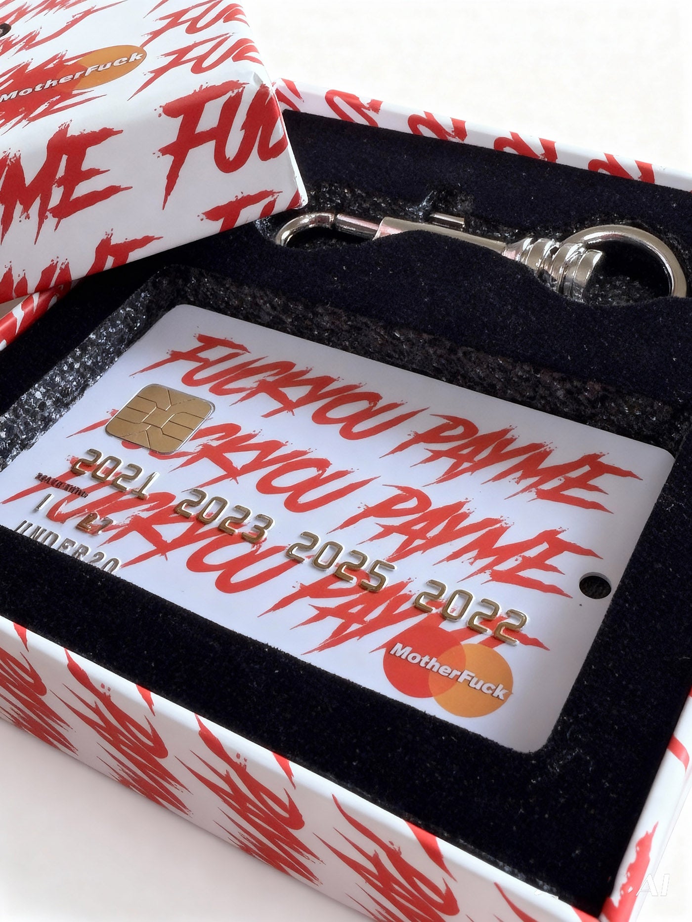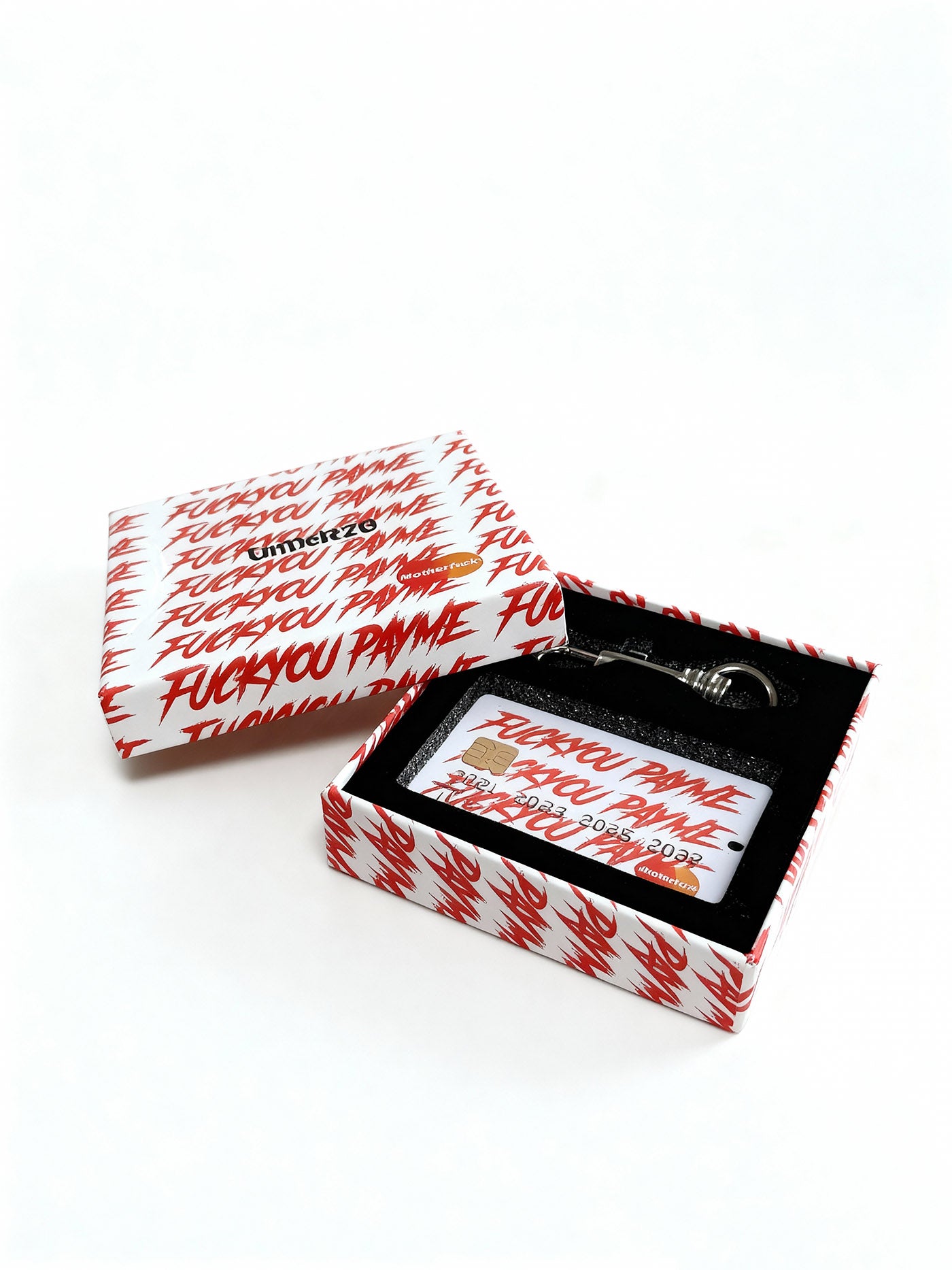 Real credit-card material, a real chip, and realistic wording. The card number is 2021 2023 2025 xxxx — the last four digits are dynamic and different on each card. The first three groups are obviously years: 2021 (when the UnDeR20 toy brand was founded), 2023 (when the clothing line was launched), and this year, 2025. Expiration date: 11/27 — my idol Bruce Lee’s birth date. The card’s issuer is a parody of Mastercard, turned into “MotherFuck.”