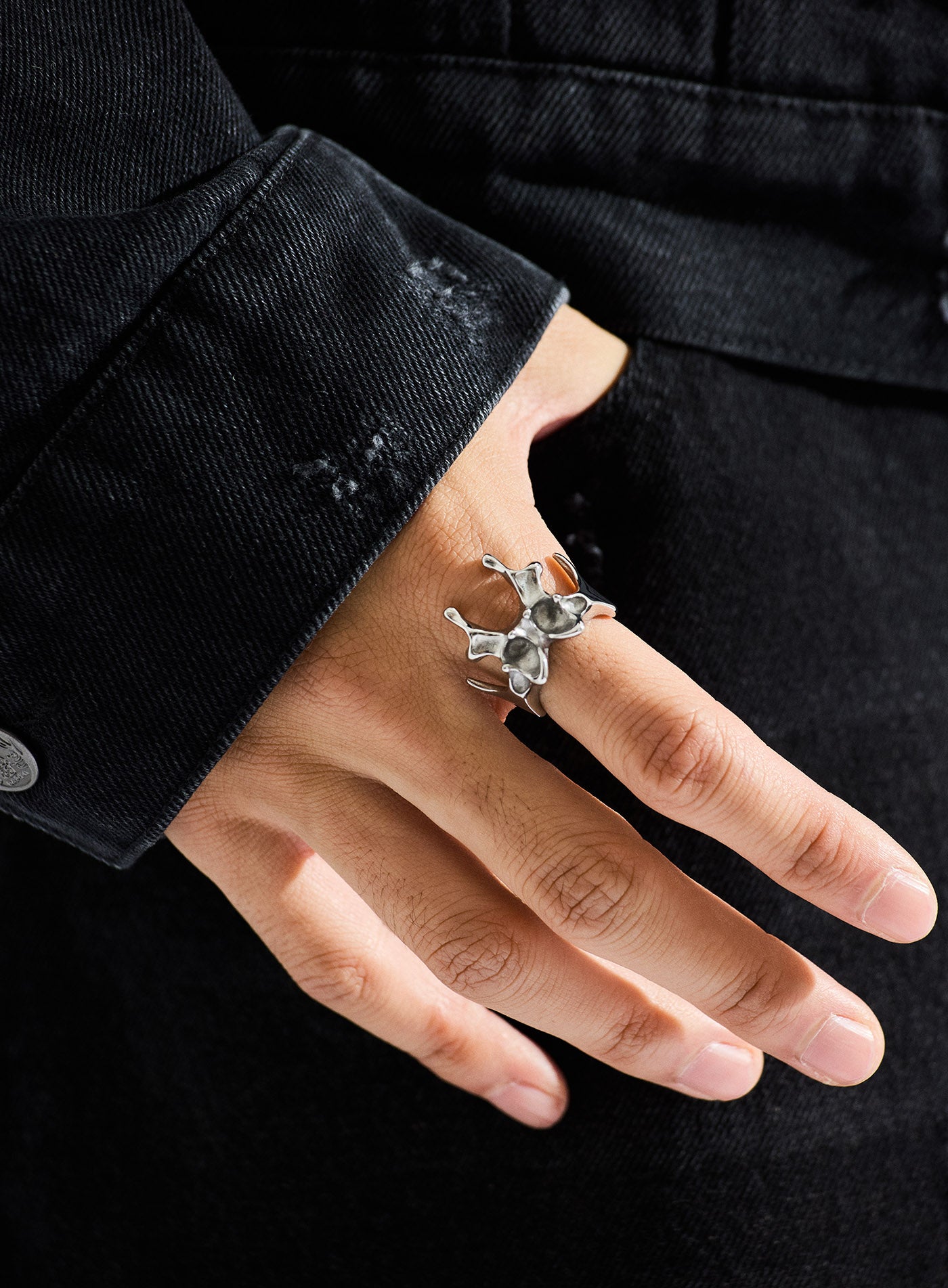 Reinterpreted as a sculptural piece of metal art worn on the hand, the design’s asymmetric curves echo the natural undulations of human bone, becoming both an abstract anatomy and a surreal act of rebirth.