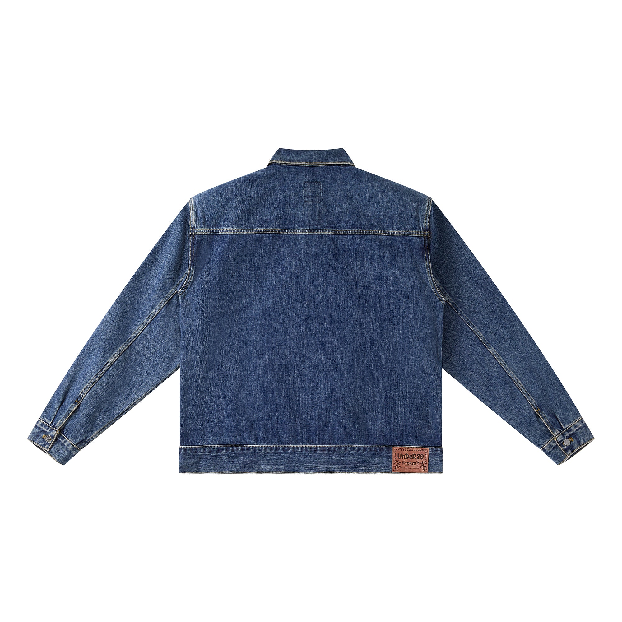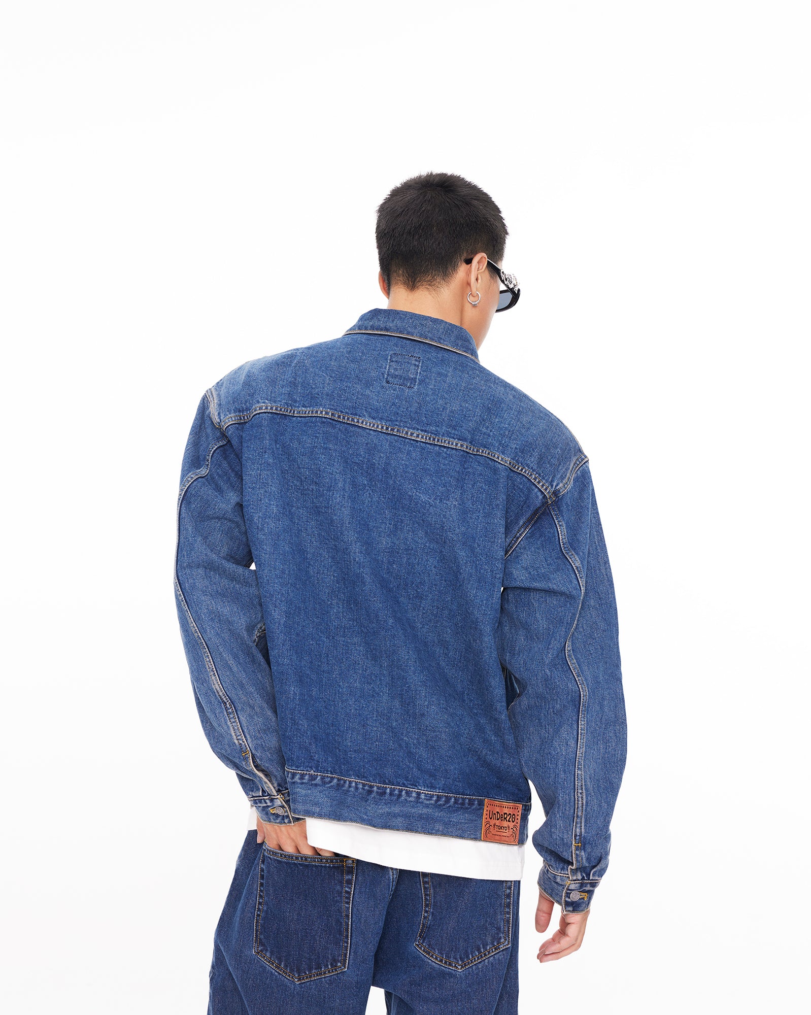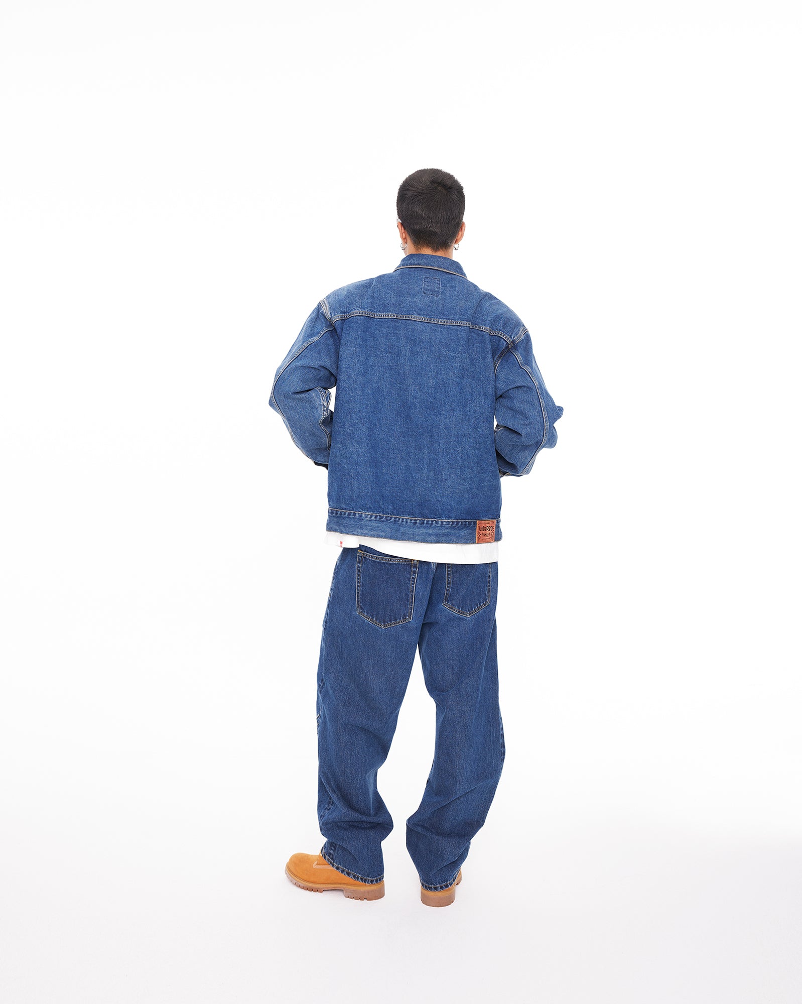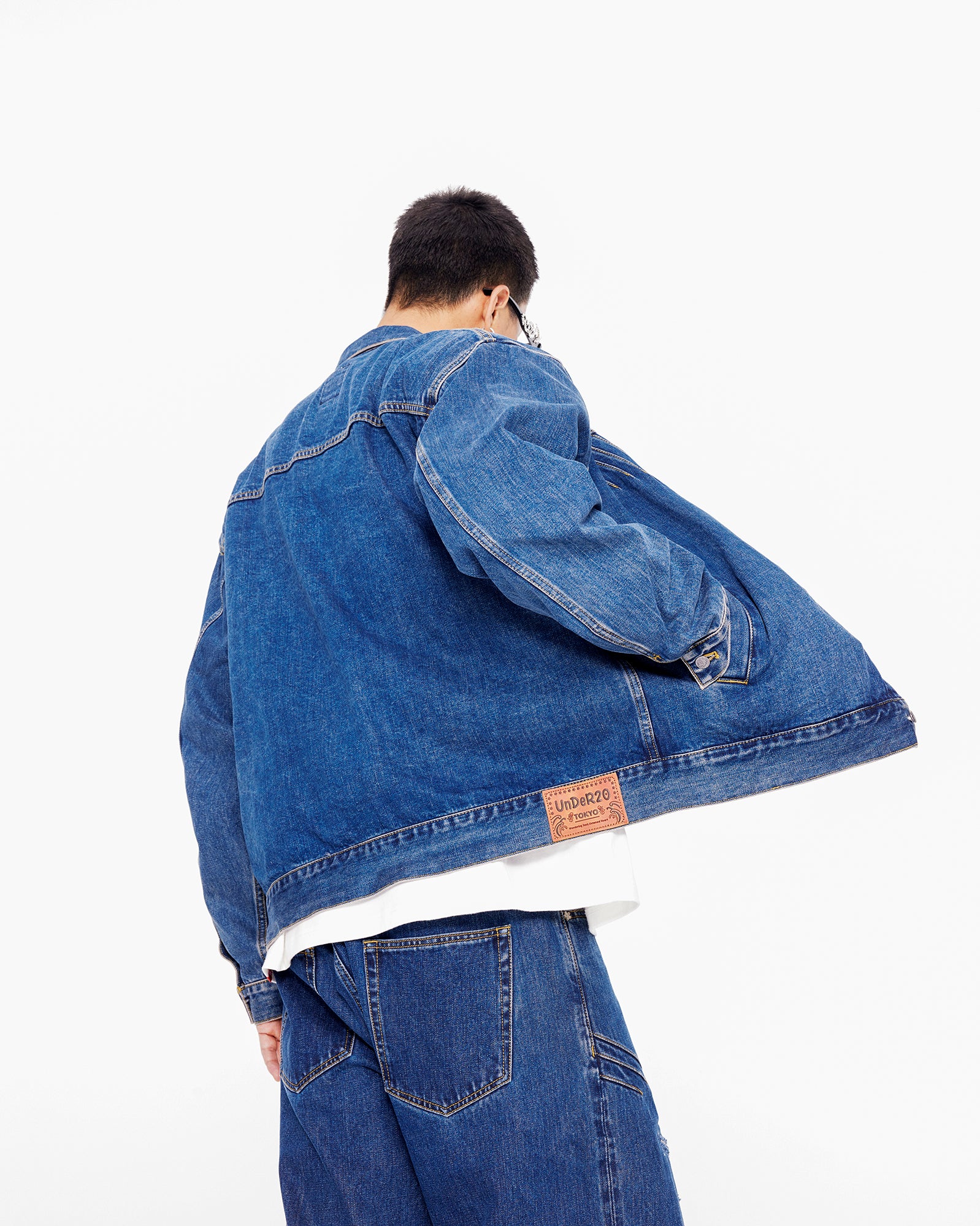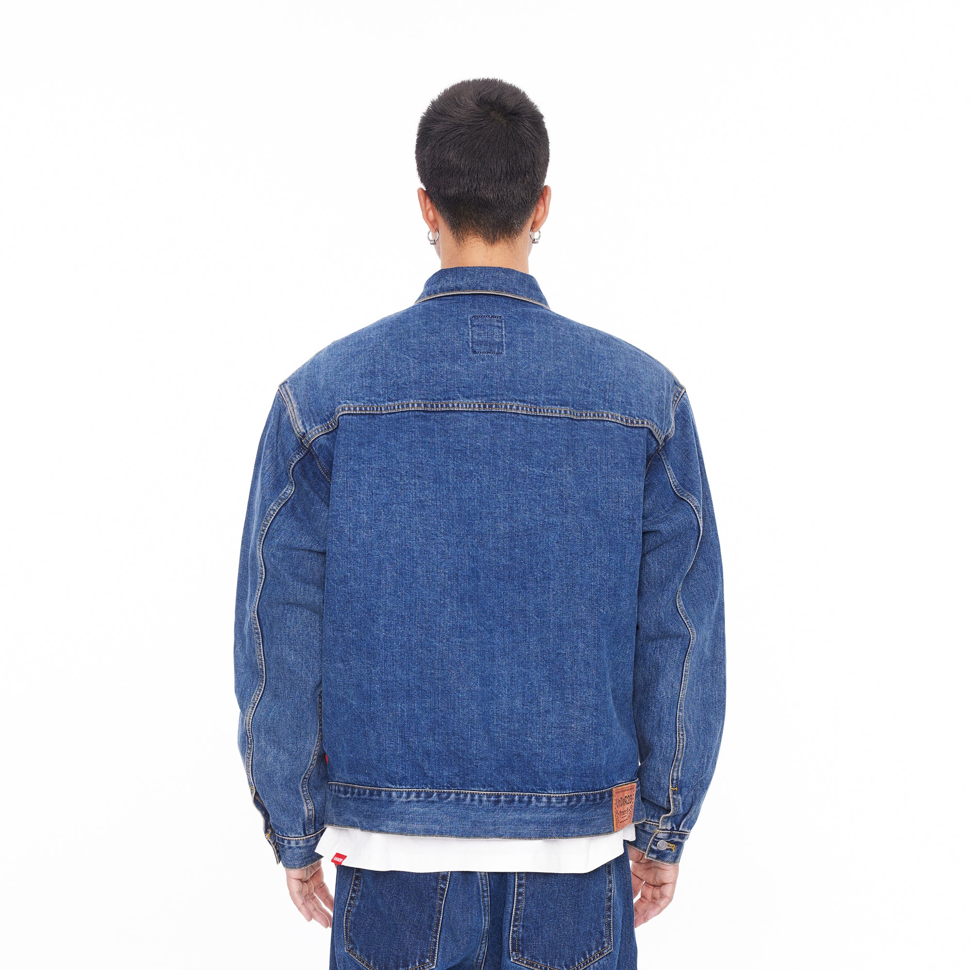 The jacket features a BOXYFIT short-cut silhouette, with two detachable shoulder pads embedded, paying tribute to Bruce Lee's iconic high-waist look and his strong V-shaped back. The classic denim blue color, combined with a washed finish and a genuine leather patch on the back waist, adds a vintage and classic touch to the jacket.