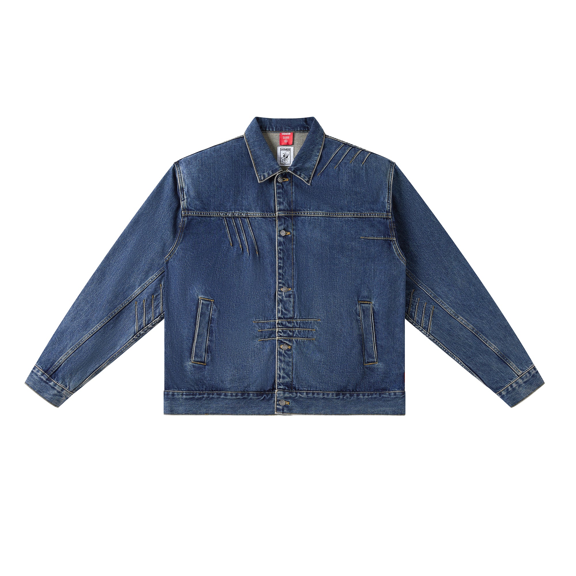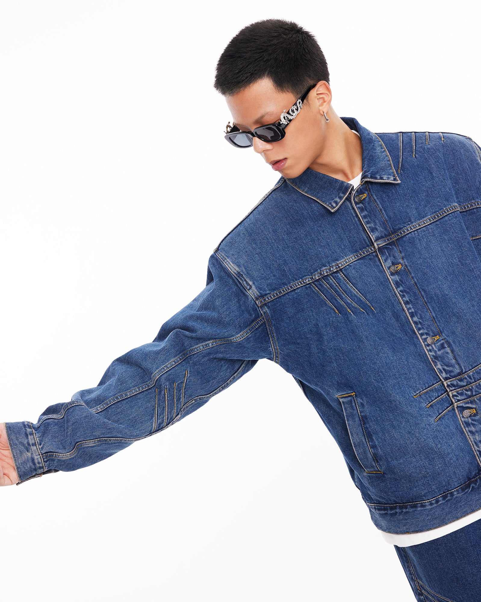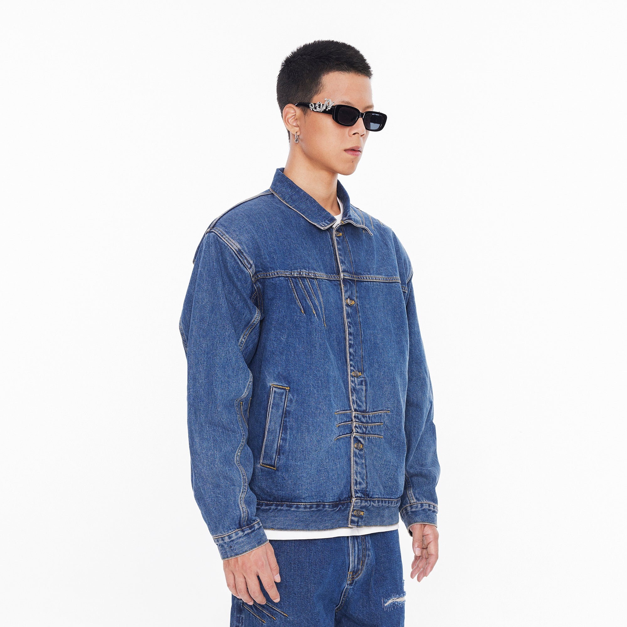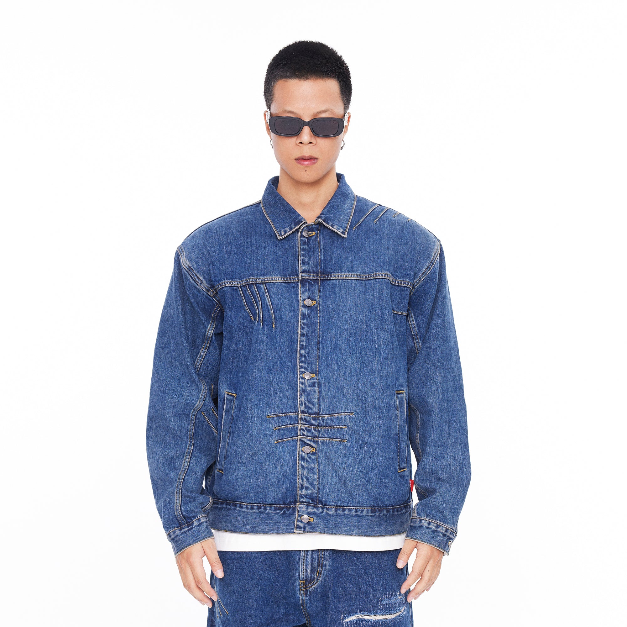 The jacket features a BOXYFIT short-cut silhouette, with two detachable shoulder pads embedded, paying tribute to Bruce Lee's iconic high-waist look and his strong V-shaped back. The classic denim blue color, combined with a washed finish and a genuine leather patch on the back waist, adds a vintage and classic touch to the jacket.