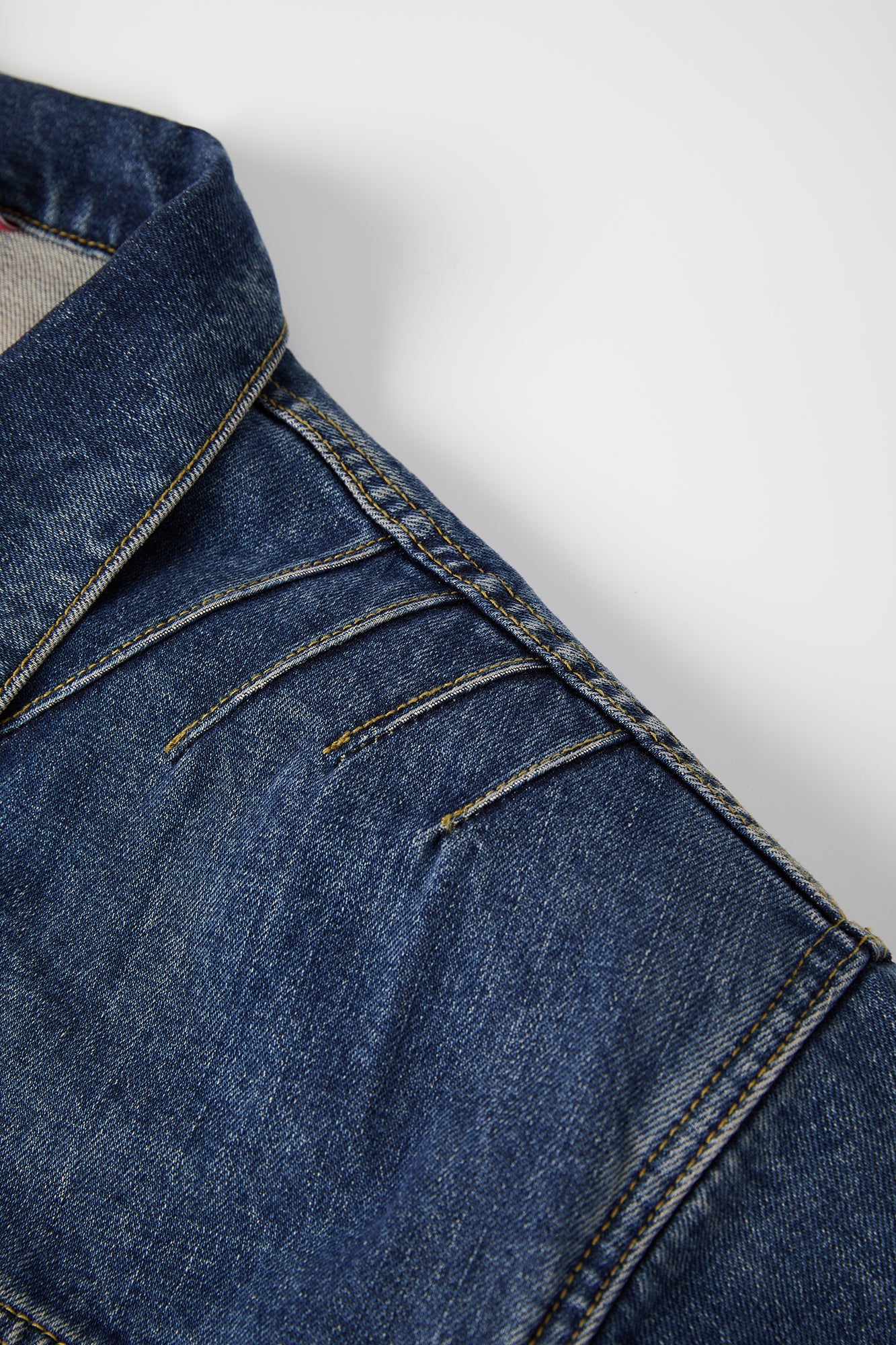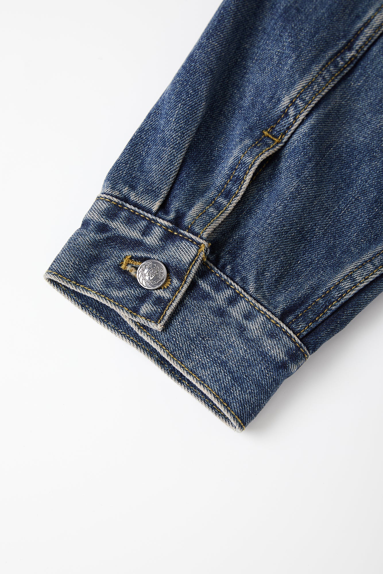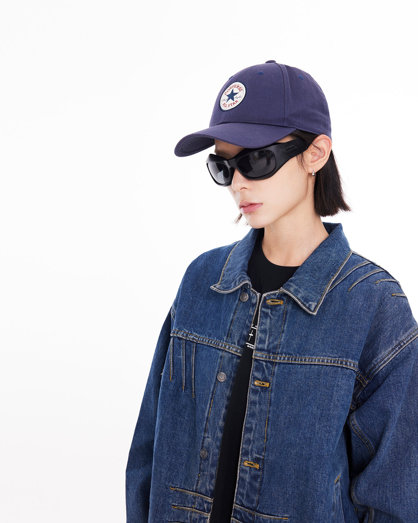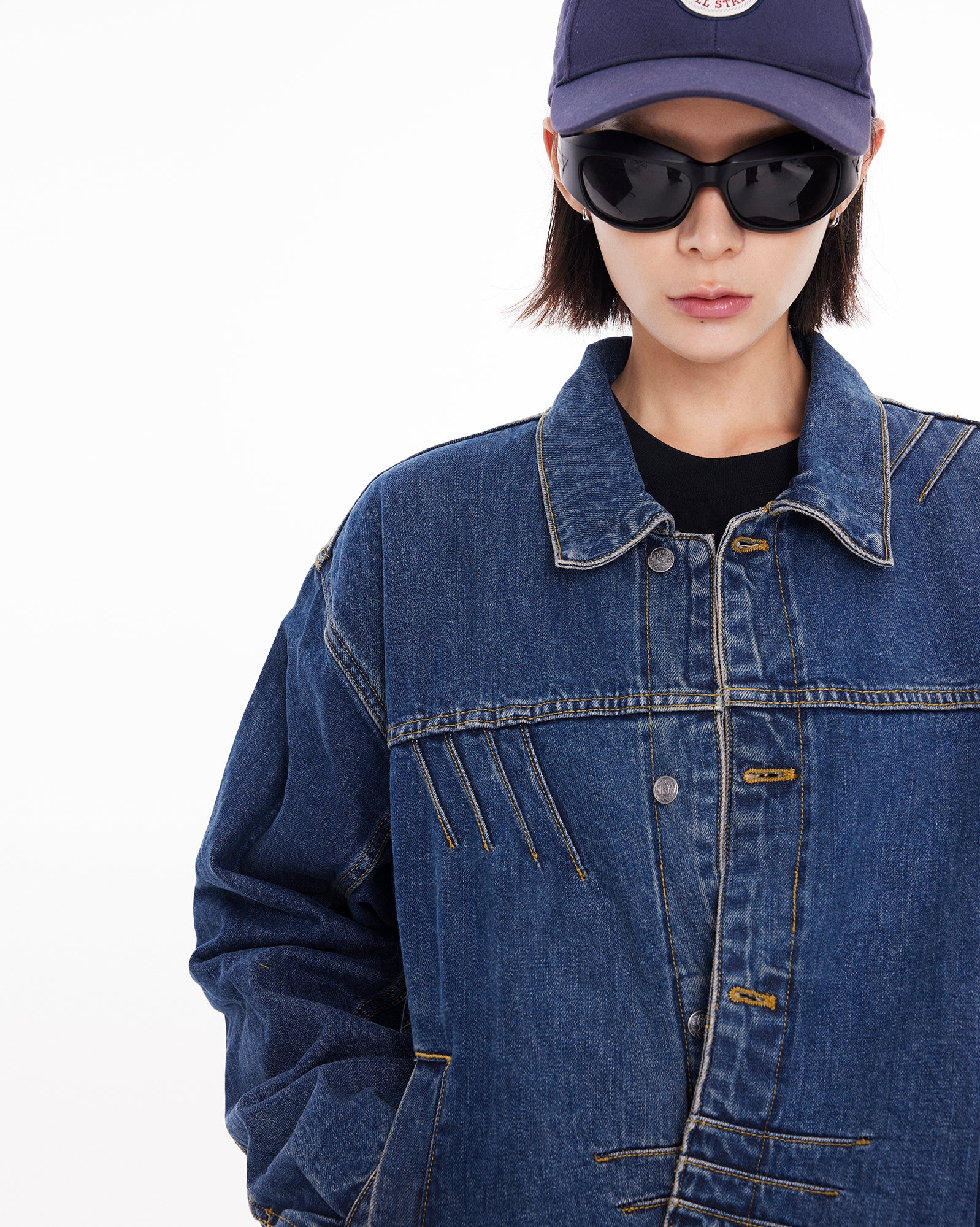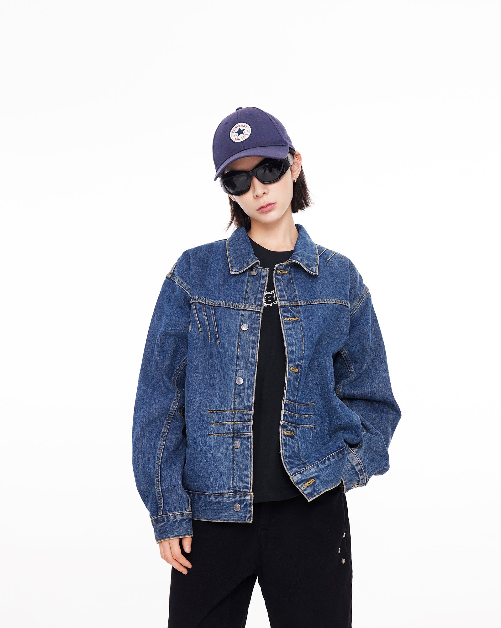 The jacket features a BOXYFIT short-cut silhouette, with two detachable shoulder pads embedded, paying tribute to Bruce Lee's iconic high-waist look and his strong V-shaped back. The classic denim blue color, combined with a washed finish and a genuine leather patch on the back waist, adds a vintage and classic touch to the jacket.