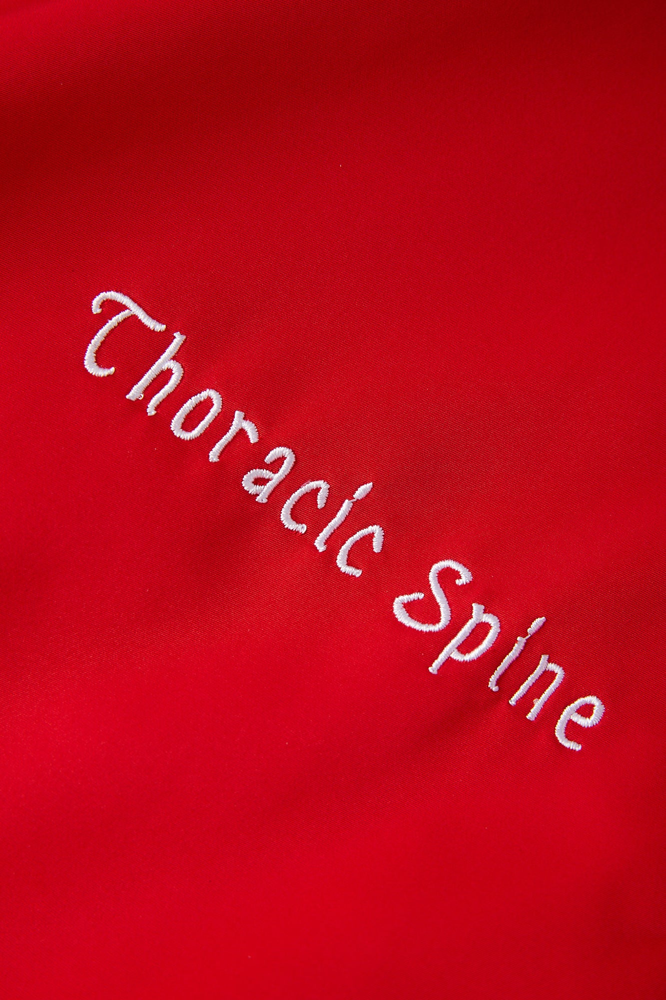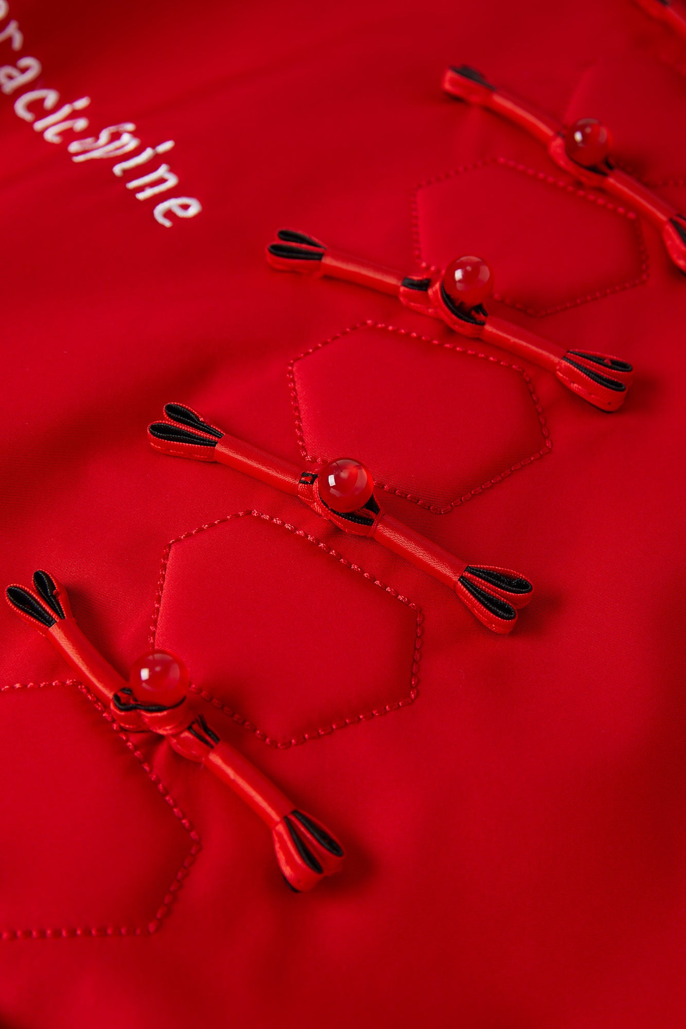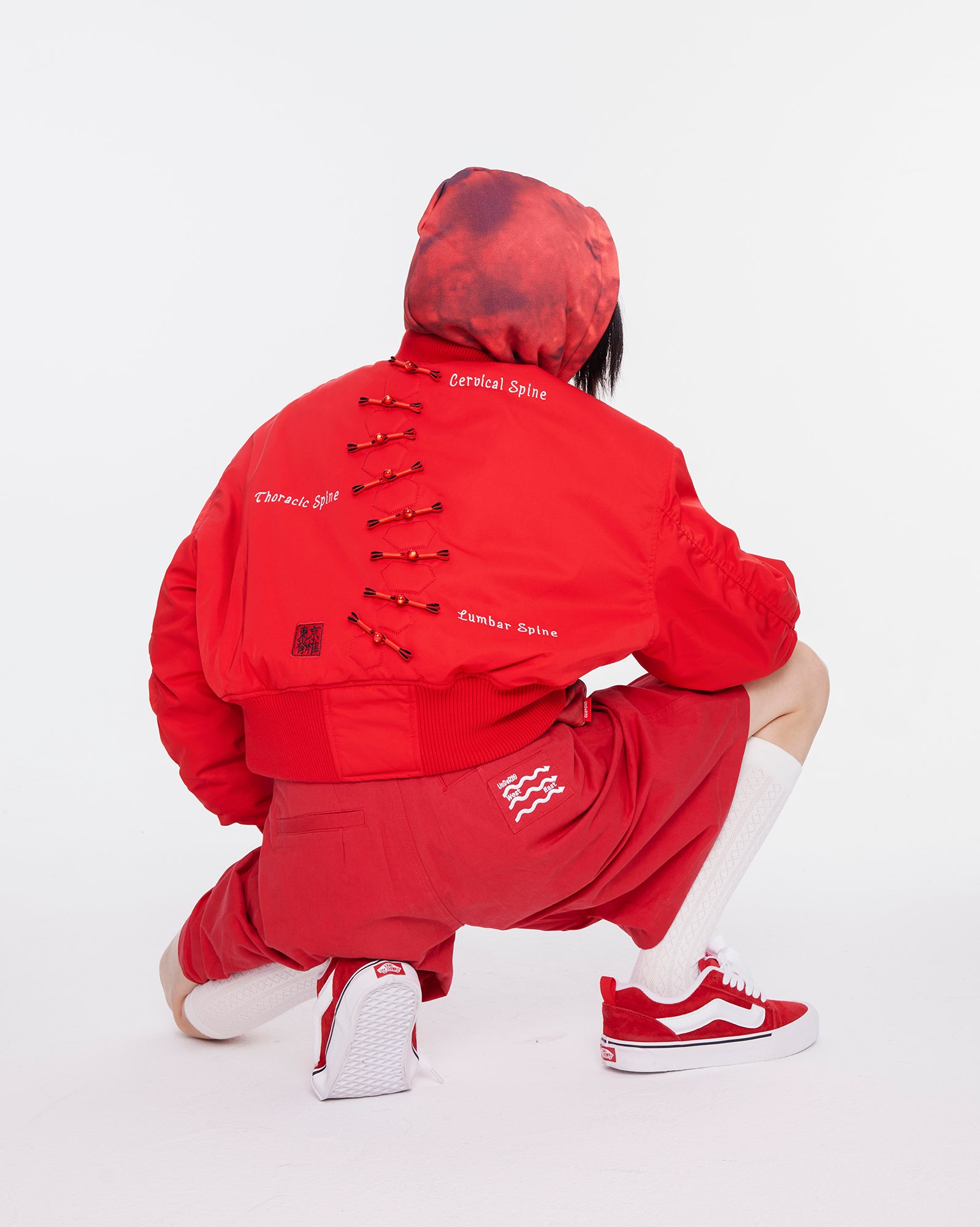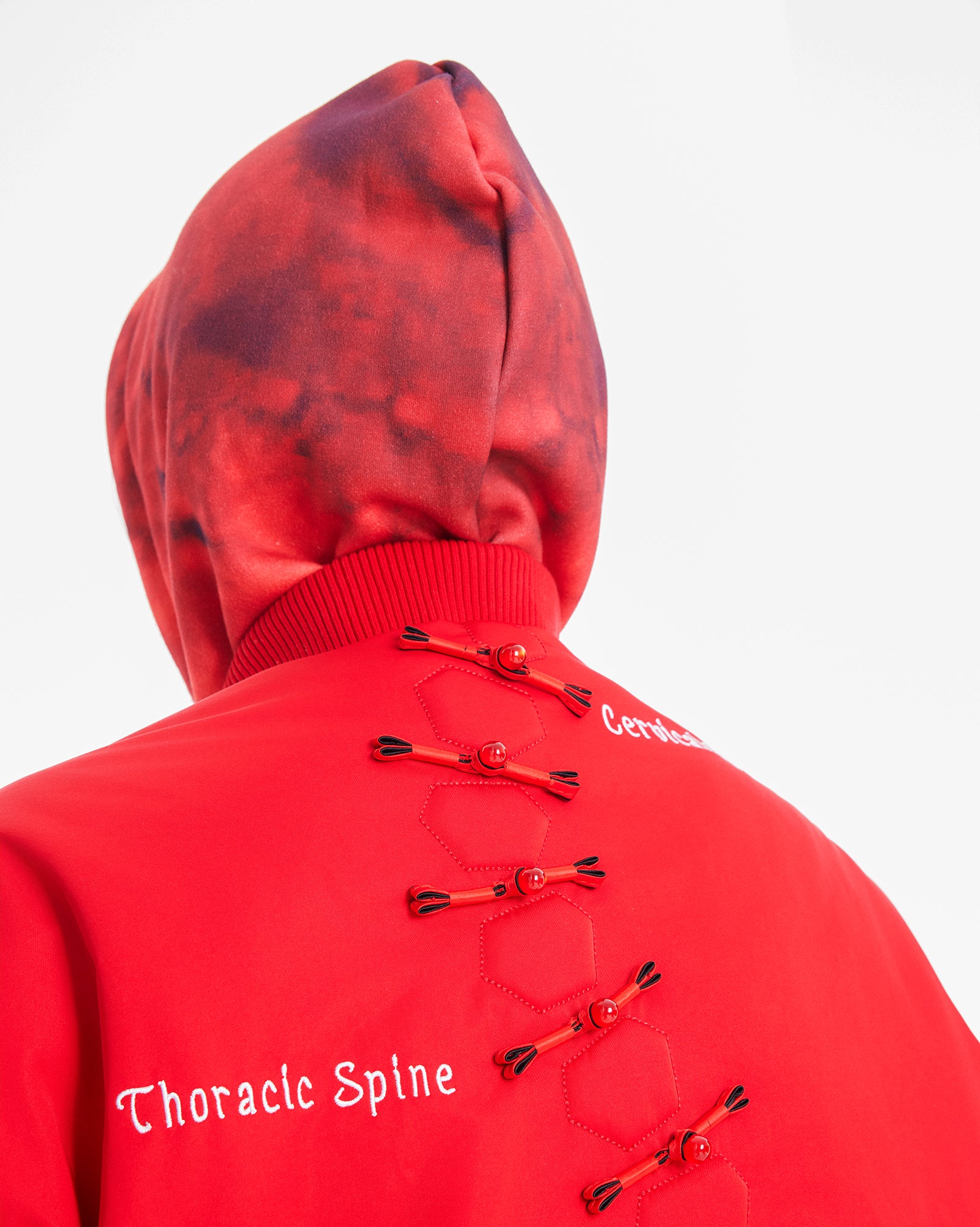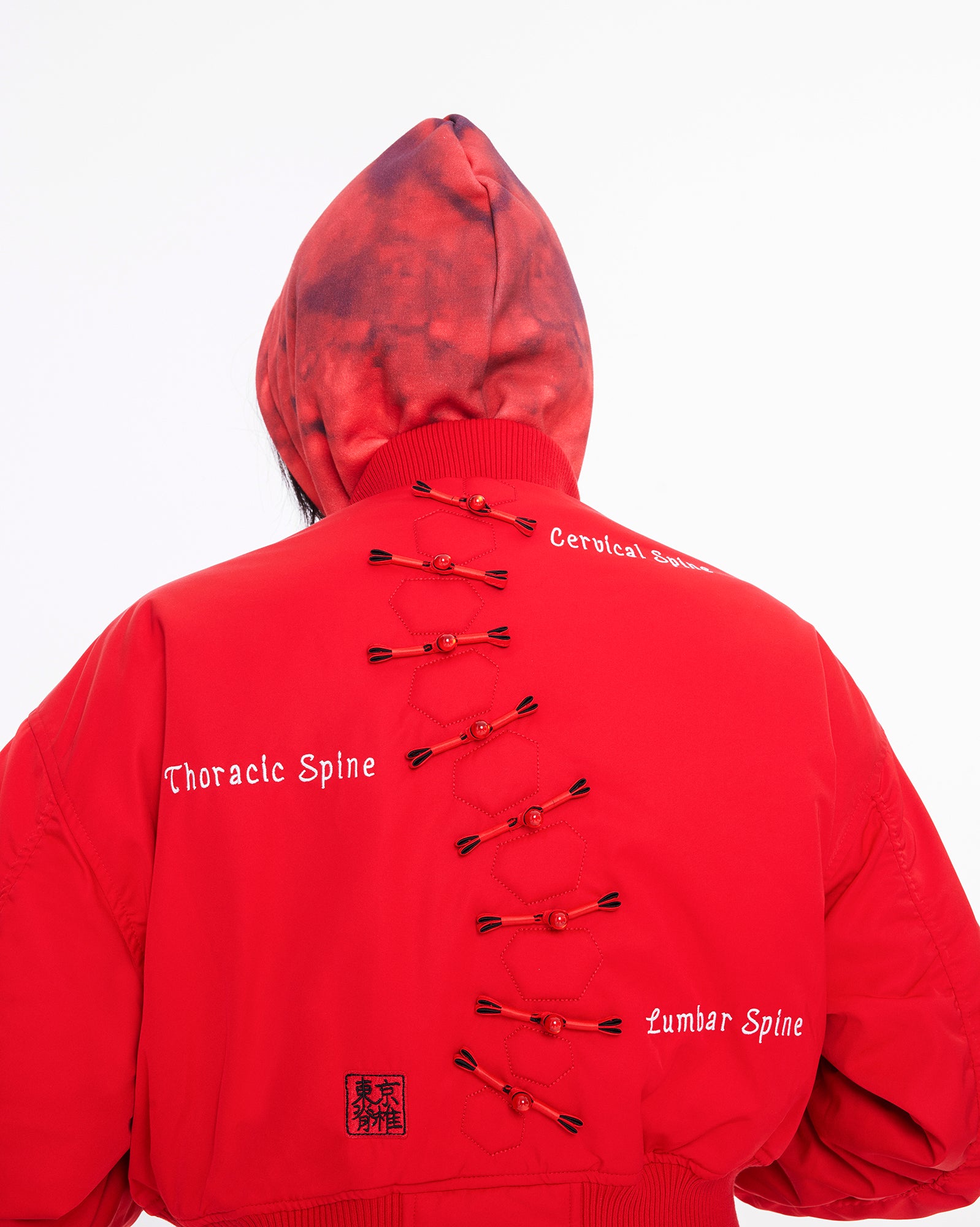 The highlight of this jacket lies in the back design. Unlike other brands, we did not place toggle buttons on the regular collar or chest area but broke away from the traditional design framework by placing them on the back, arranged in a curved shape like a scoliotic spine. Meanwhile, the main structure of the spine uses three-dimensional padding technology to enhance the detail and tactile feel, as if the spine were embedded in the garment. The combination of oriental elements with modern, rugged shapes not only enhances the visual depth but also reflects the fusion of cultural collision and innovation.