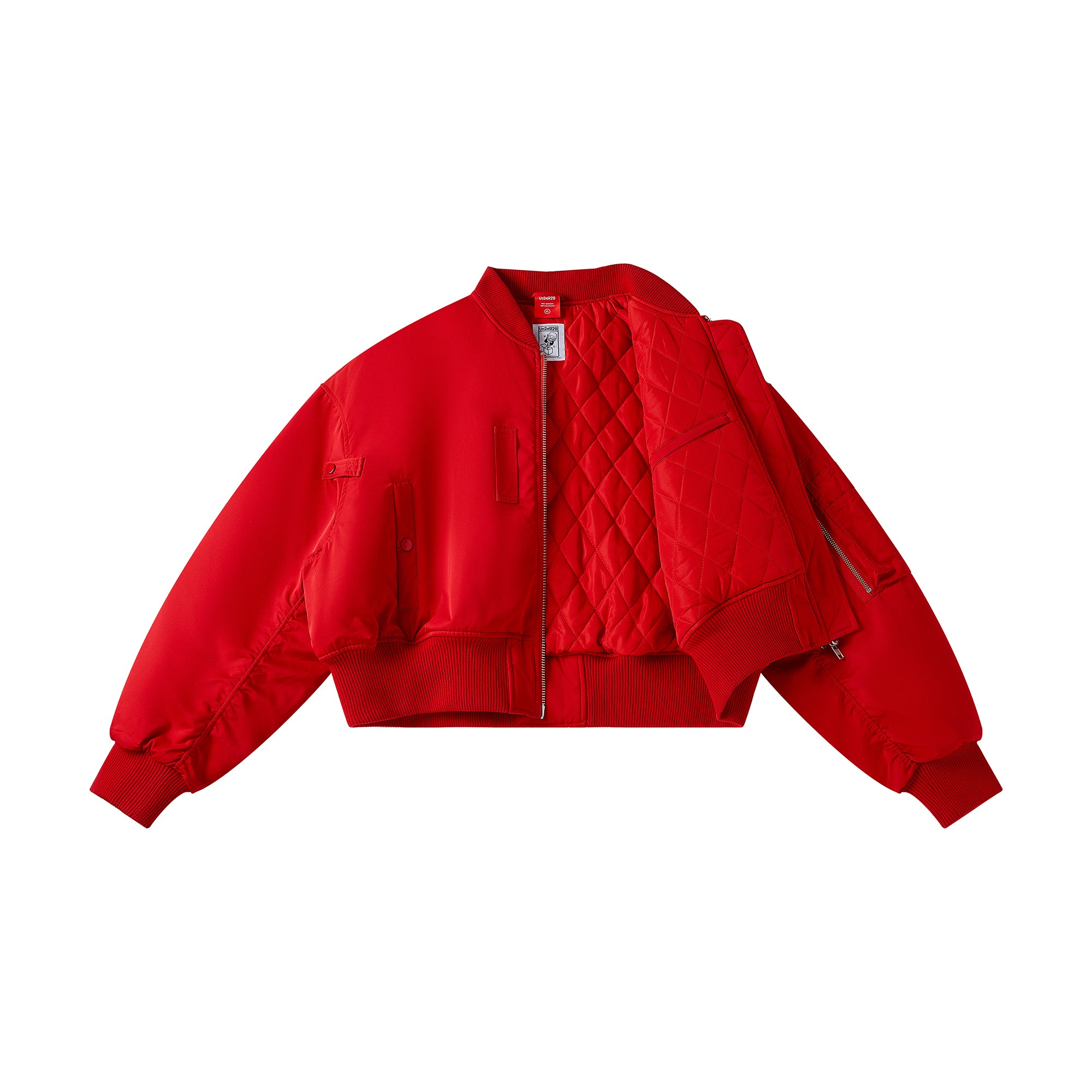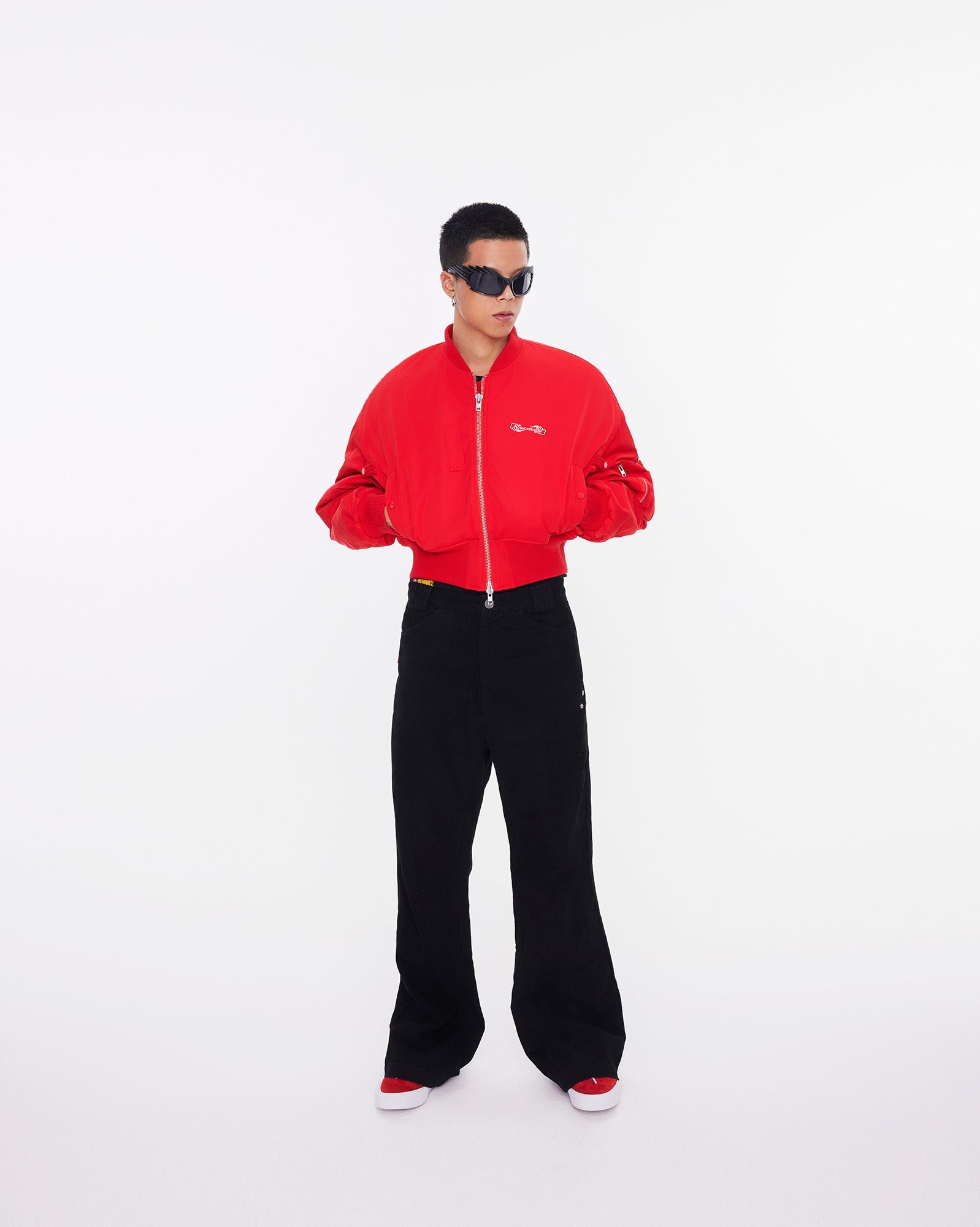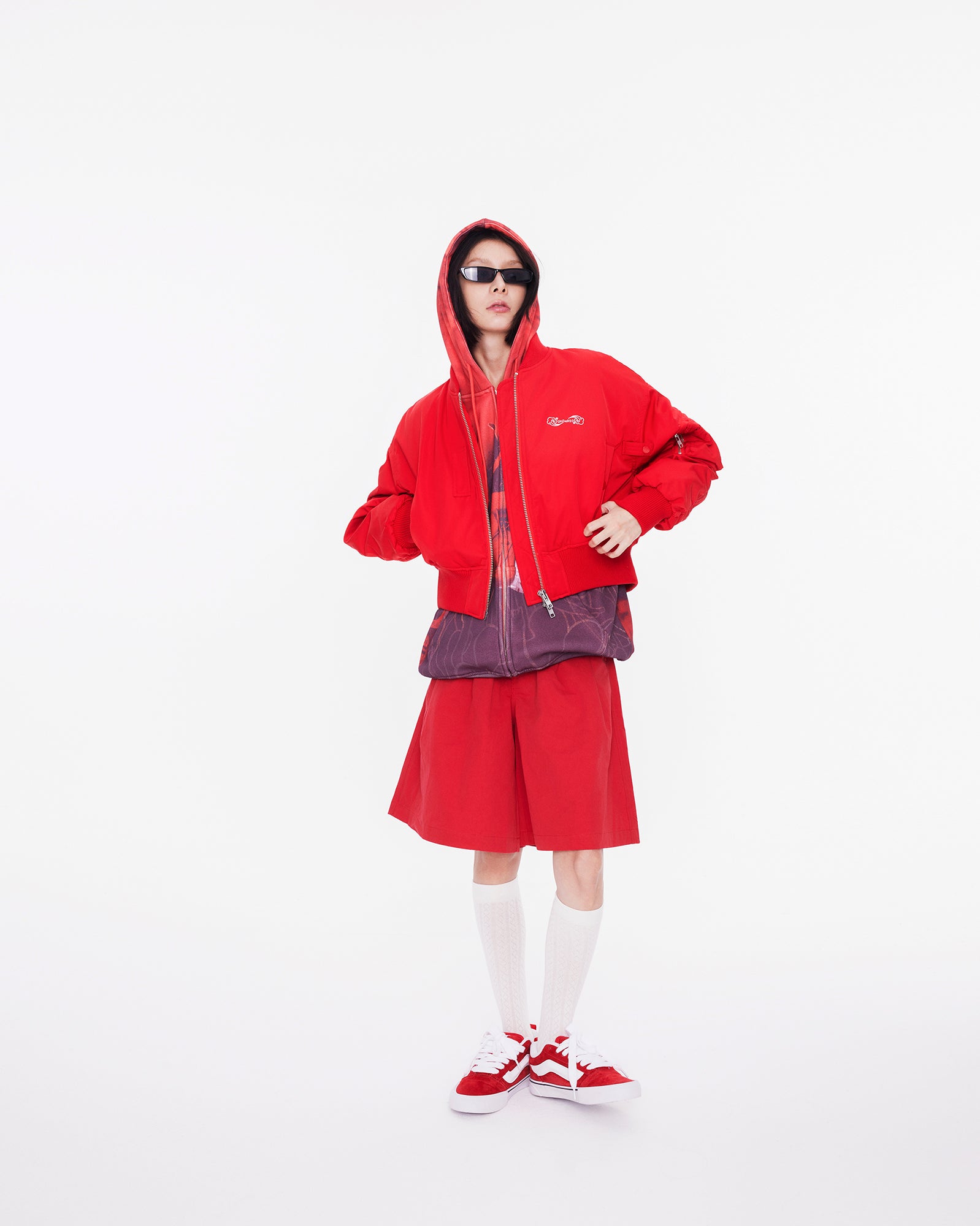 This “Tokyo Spine 3.0” bomber jacket from the UnDeR20 classic regular series is a bold reinterpretation of the classic MA-1 bomber jacket. The scimitar-shaped sleeves give a sense of fluidity in motion, while the cropped silhouette makes the entire appearance more sleek and streamlined, highlighting the wearer’s contours and posture.