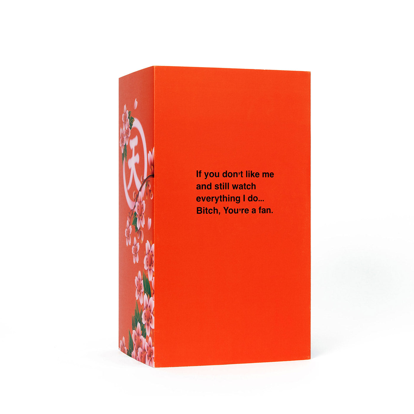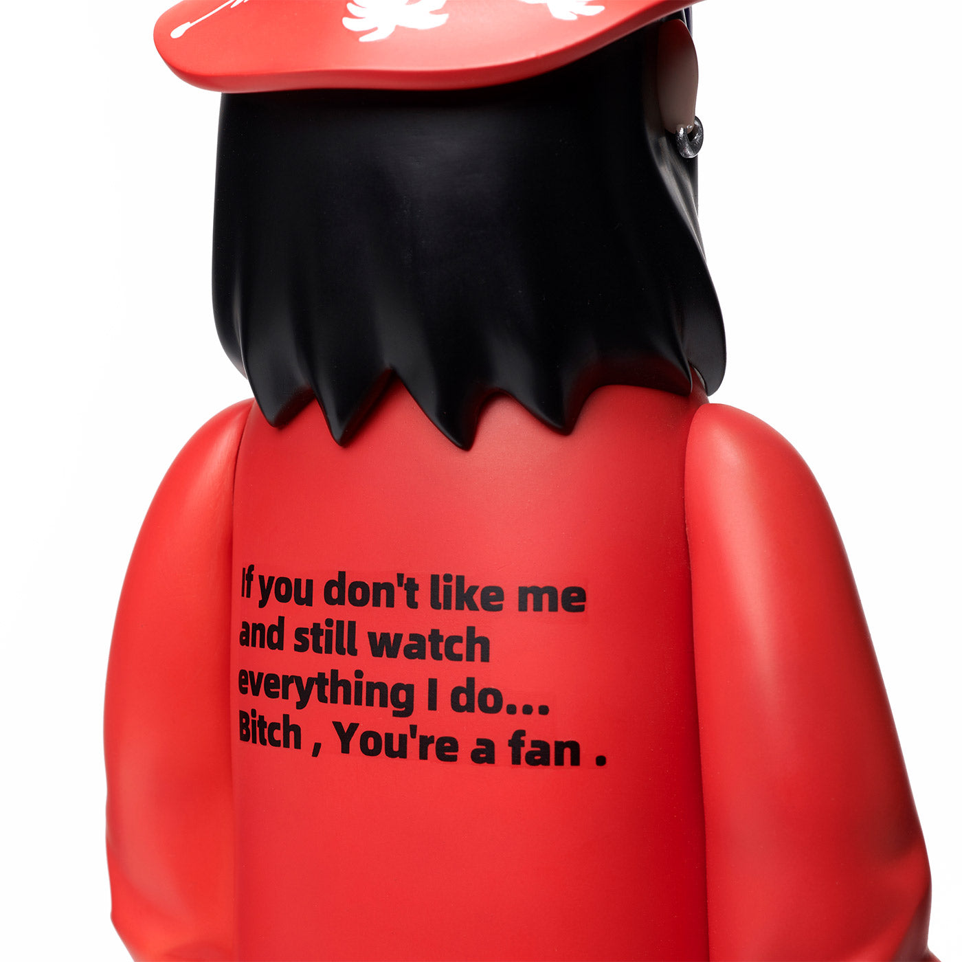 At least for now, we won't buy familiar copyright to design, nor will we take those materials to play close to the line to make our own products. We also don't see how cute trendy toys with big eyes have anything to do with us, so we only make what we think is right. The point of art toys is being trendy, and behind trendiness is attitude. Just like the phrase on the back of this trendy figure: If You Don't like Me and Still Watch Everything I Do, Bitch You Are a Fan.