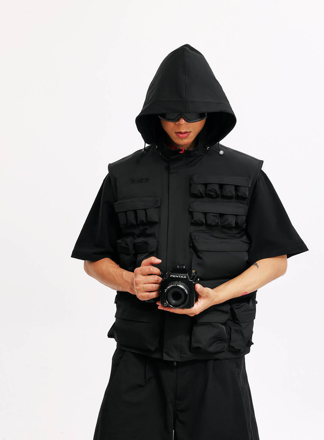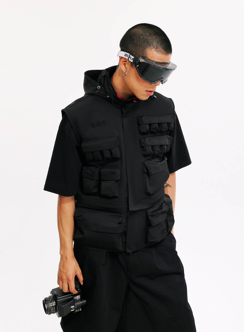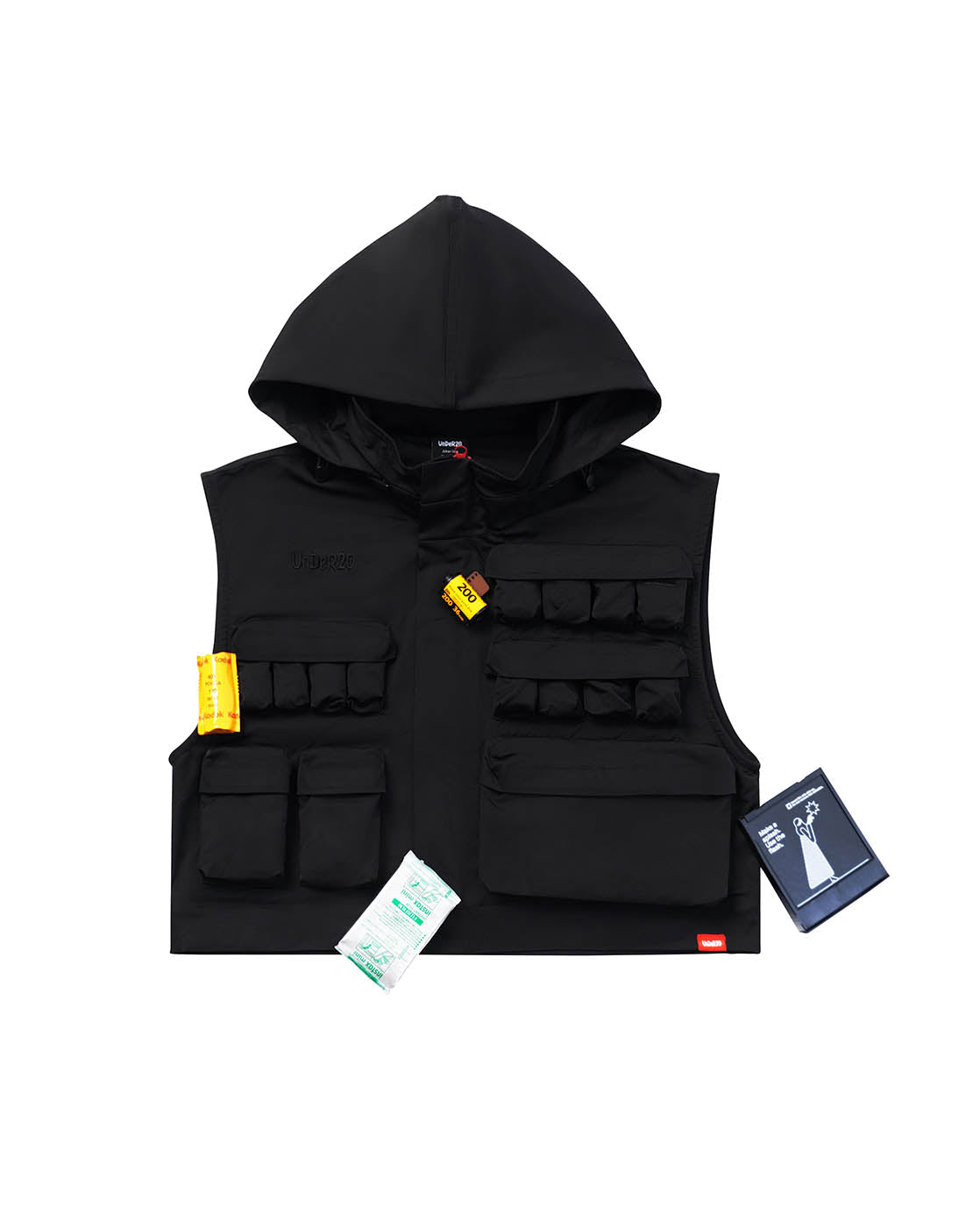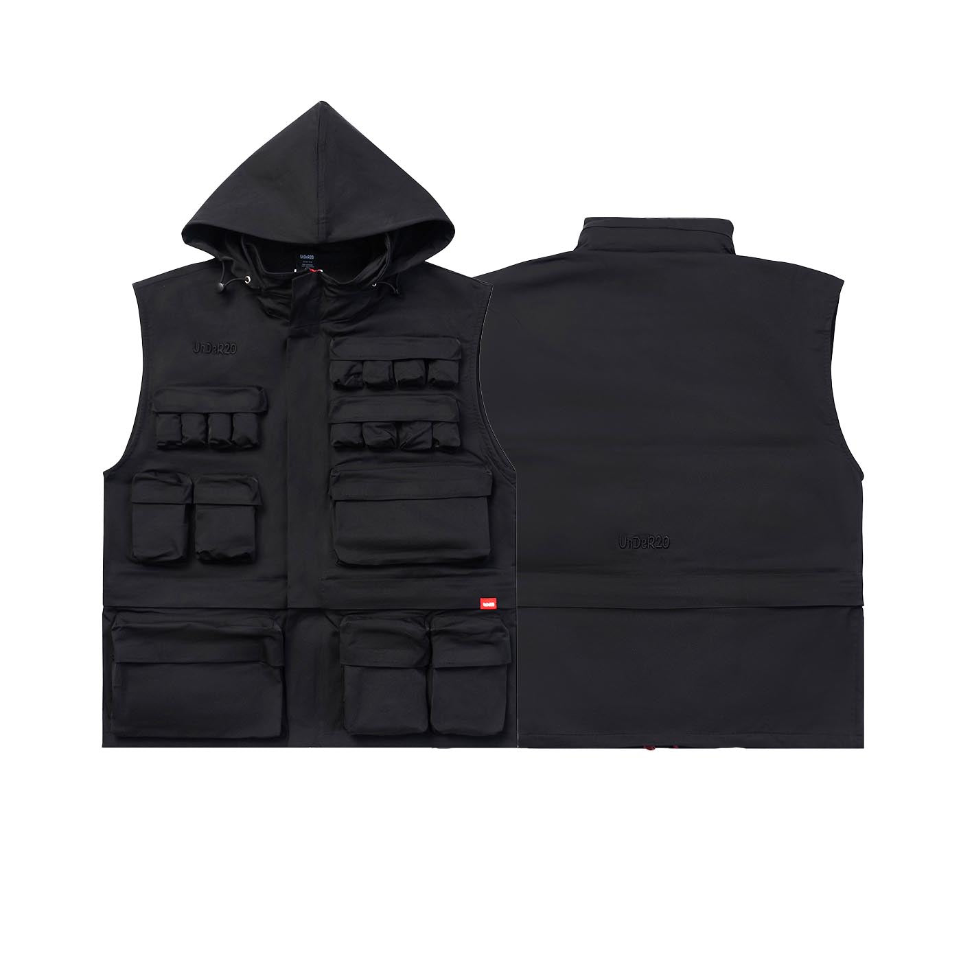 Introducing the UnDeR20 Joker, the high-end line of UnDeR20, which aligns with our brand's ethos of whimsical and satirical tones. The debut piece from this line is this outdoor photographer vest, which not only caters to the needs of photographers, outdoor enthusiasts, and fishermen but also exemplifies the fusion of functionality and fashion through its detachable and reconfigurable design. It features splash-resistant fabric to protect your valuable assets, an accordion pocket that prevents light exposure to film, a concealed foldable hood, and waterproof zippers for ultimate practicality.