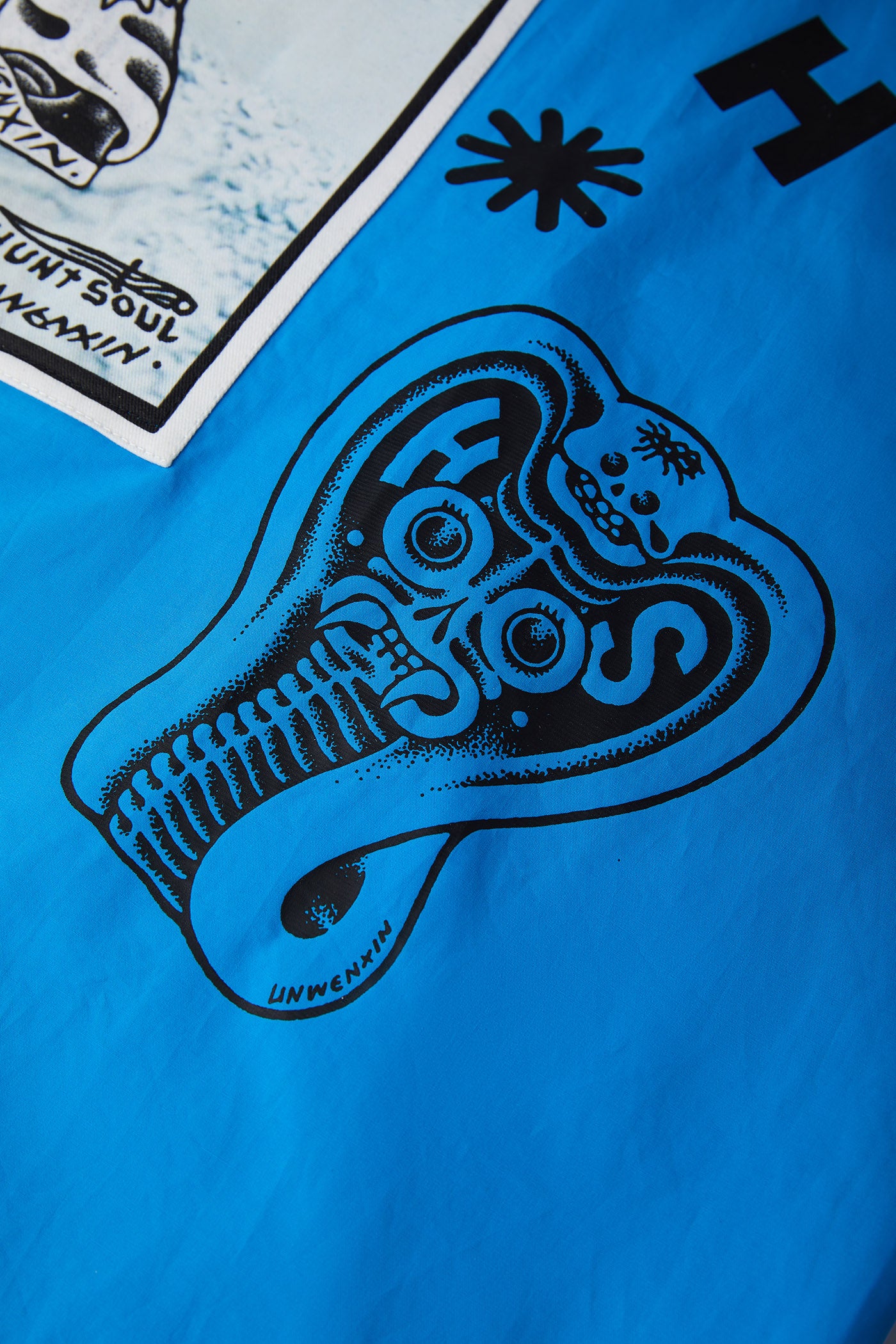 The graphic design of this shirt continues artist LIN WENXIN’s signature visual language, featuring scattered elements such as skulls, nails, teardrops, spiders, and abstract symbols. On the surface, they appear chaotic, but they actually conceal a hidden sense of visual order—like a coded score from another world.