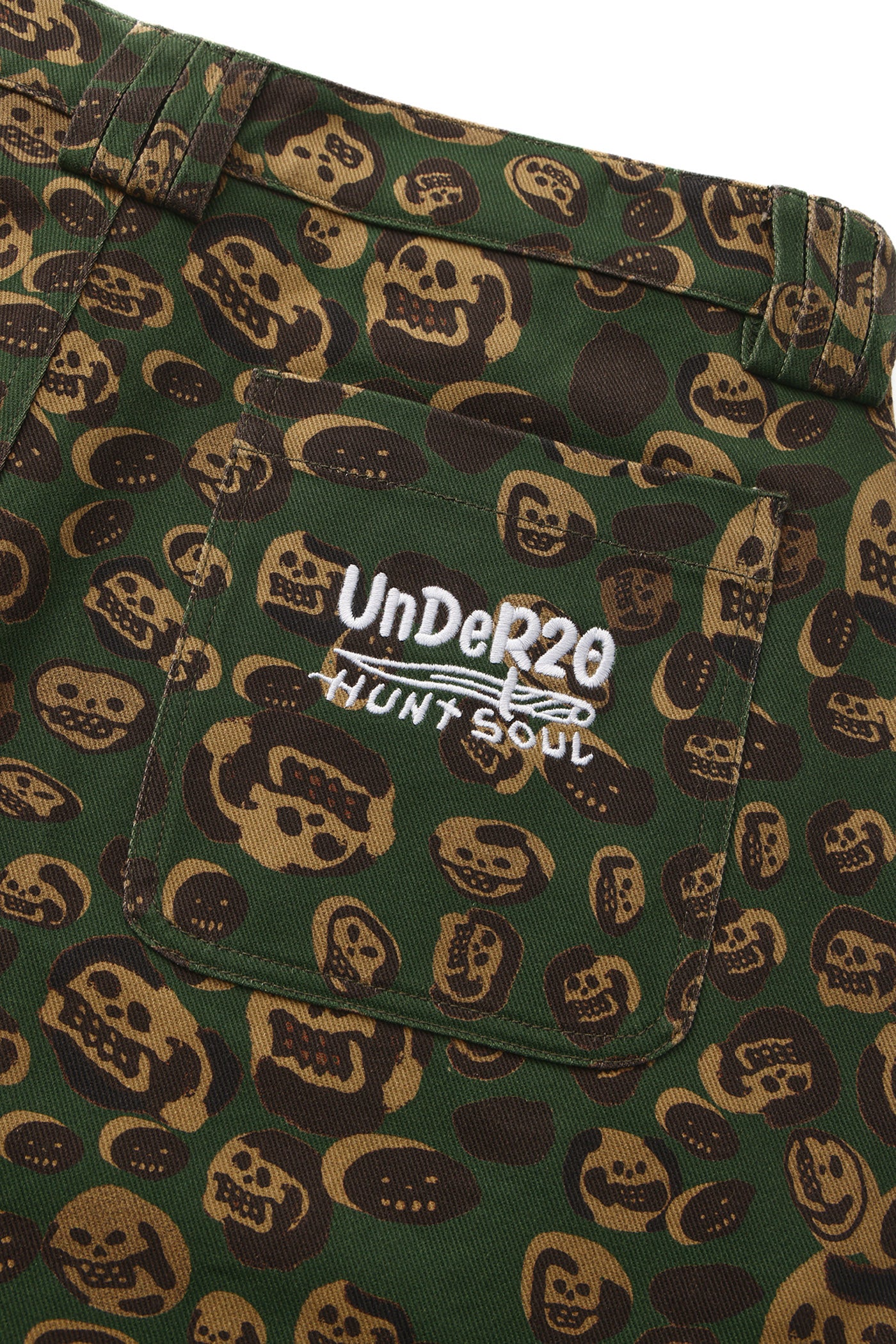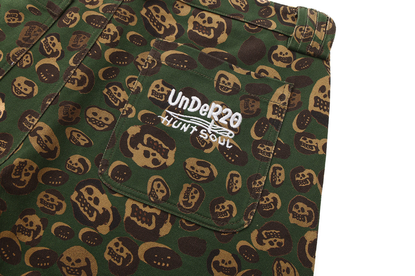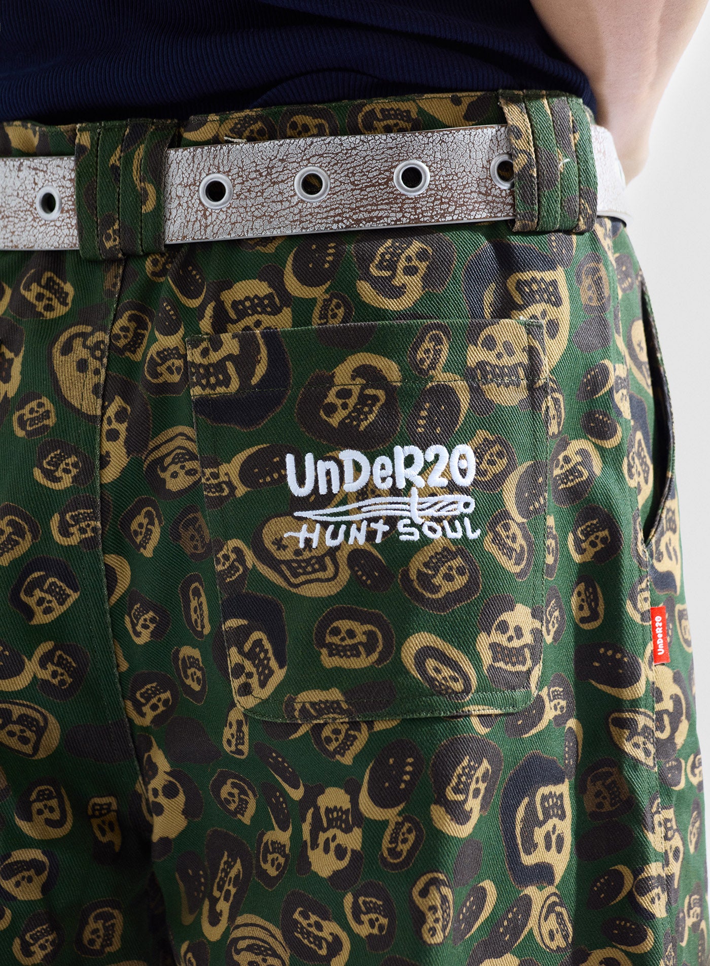 These loose-fitting wide-leg pants transform artist LIN WENXIN’s skull paintings into an all-over leopard camouflage print, creating a distinctive layered texture. From afar, it appears as leopard camo; up close, it reveals a surreal pattern of skulls. The back pocket features an embroidered UNDER20 × Hunt Soul logo, making this piece a fusion of leopard print, skull motifs, and streetwear symbolism.