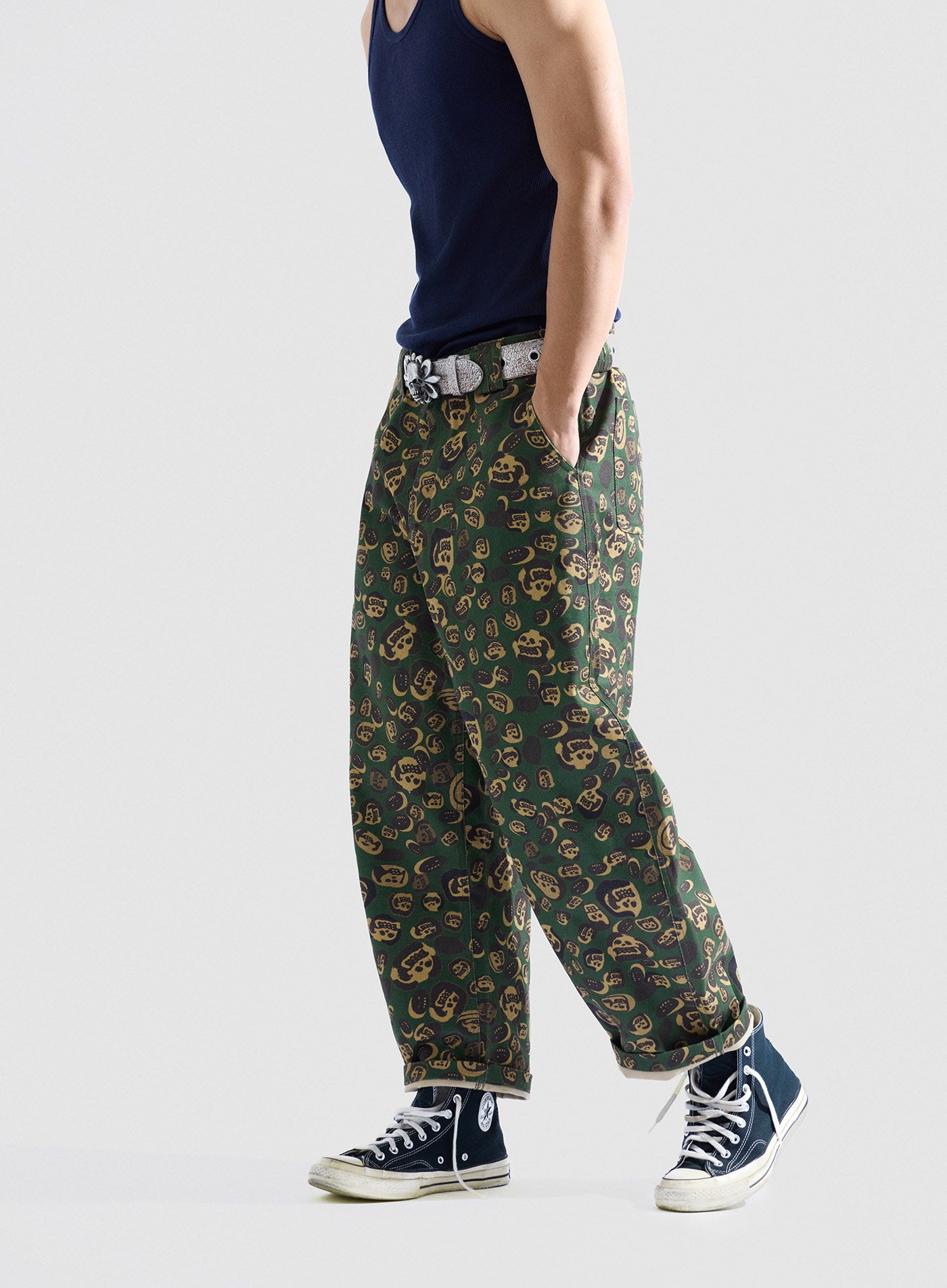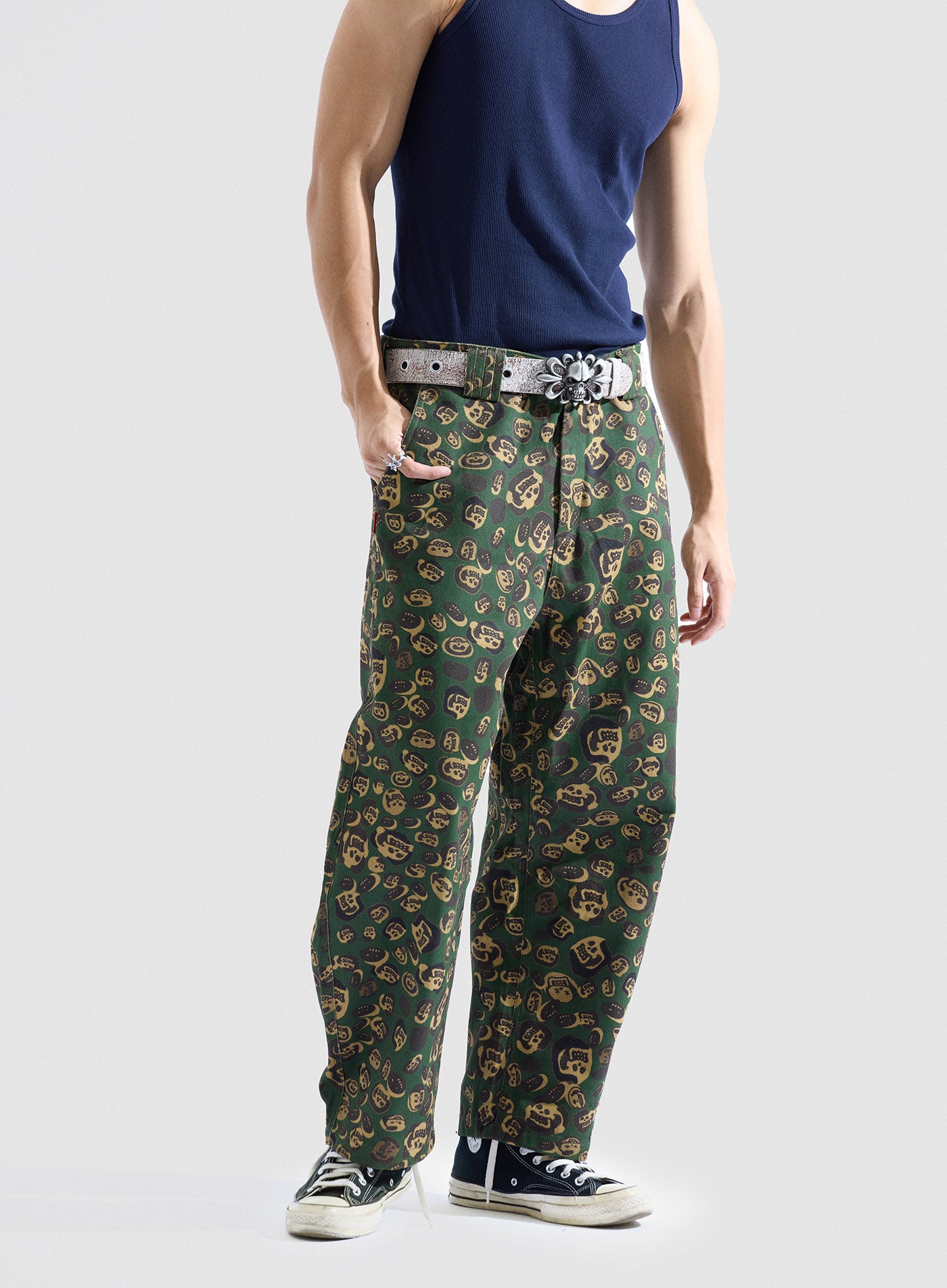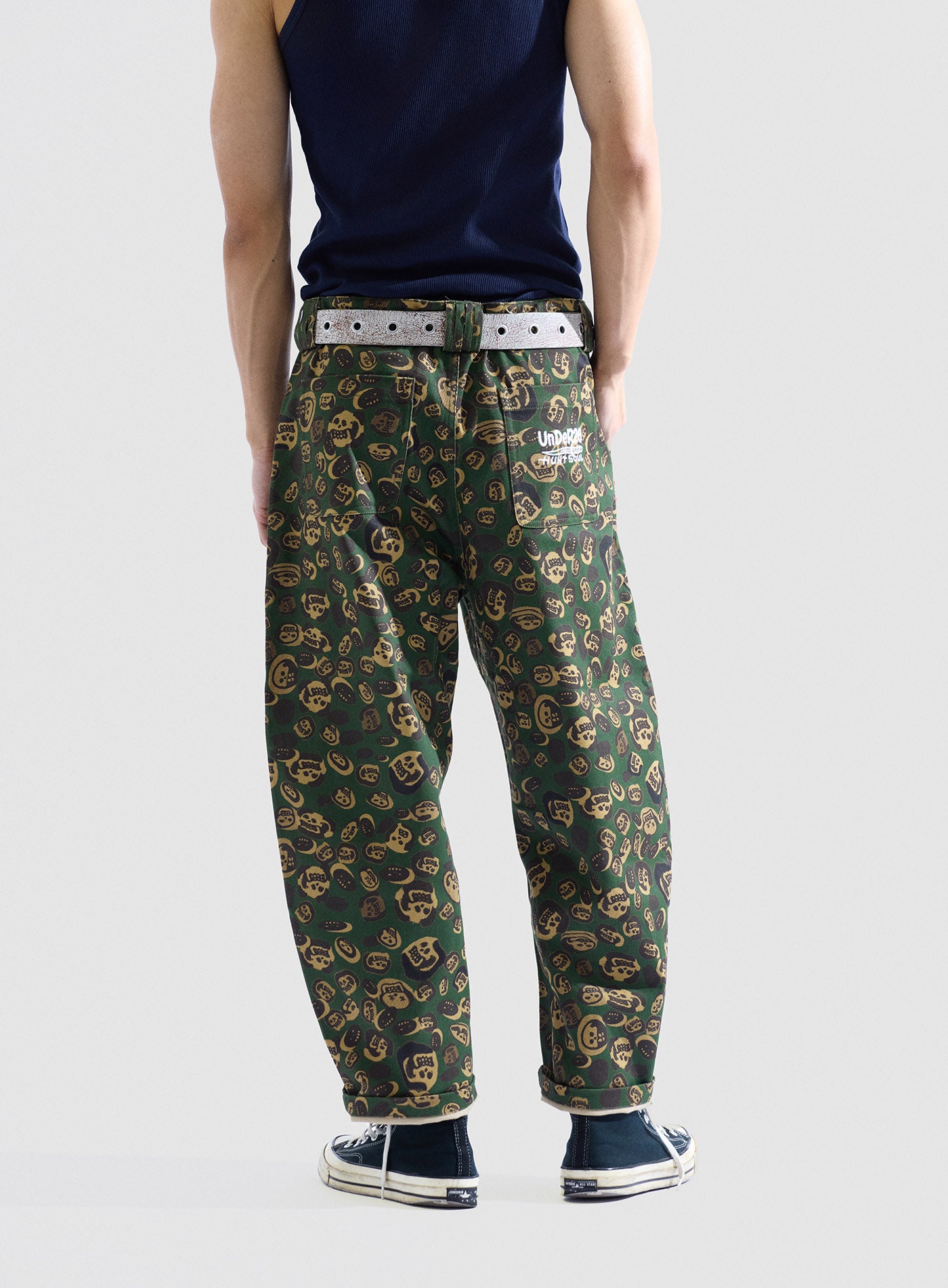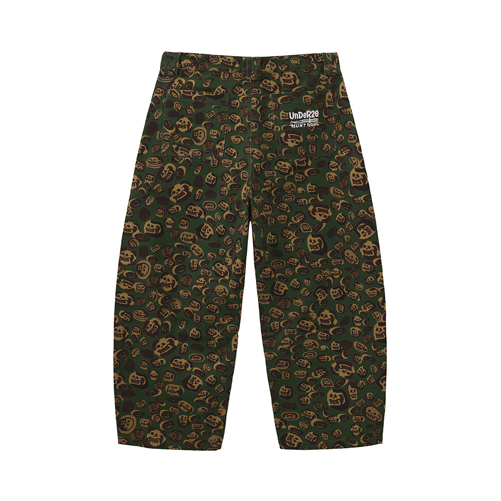 These loose-fitting wide-leg pants transform artist LIN WENXIN’s skull paintings into an all-over leopard camouflage print, creating a distinctive layered texture. From afar, it appears as leopard camo; up close, it reveals a surreal pattern of skulls. The back pocket features an embroidered UNDER20 × Hunt Soul logo, making this piece a fusion of leopard print, skull motifs, and streetwear symbolism.
