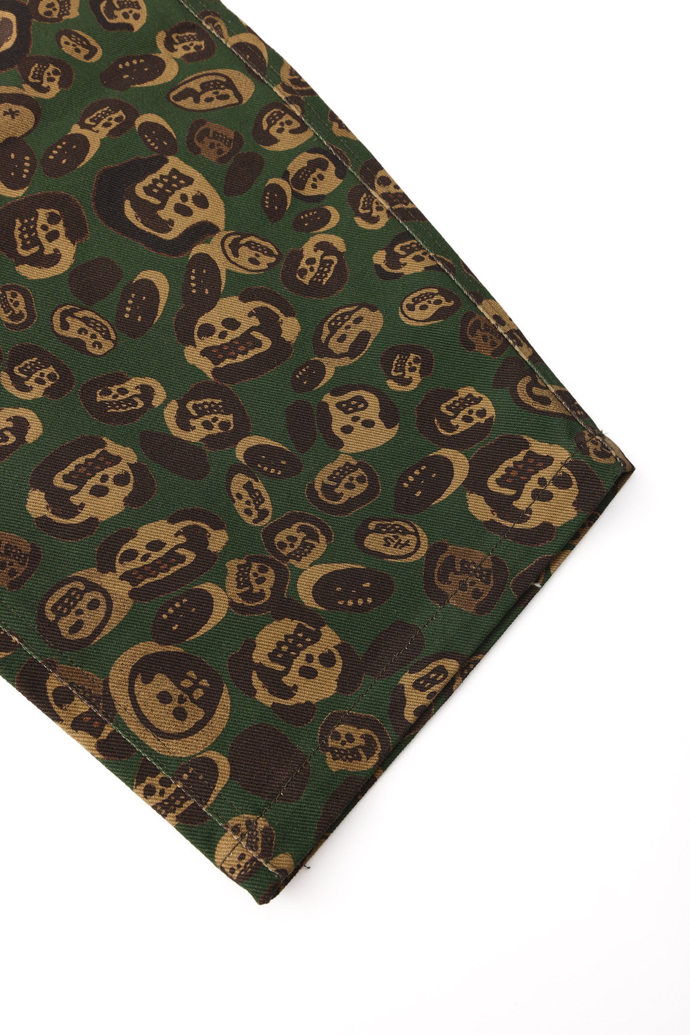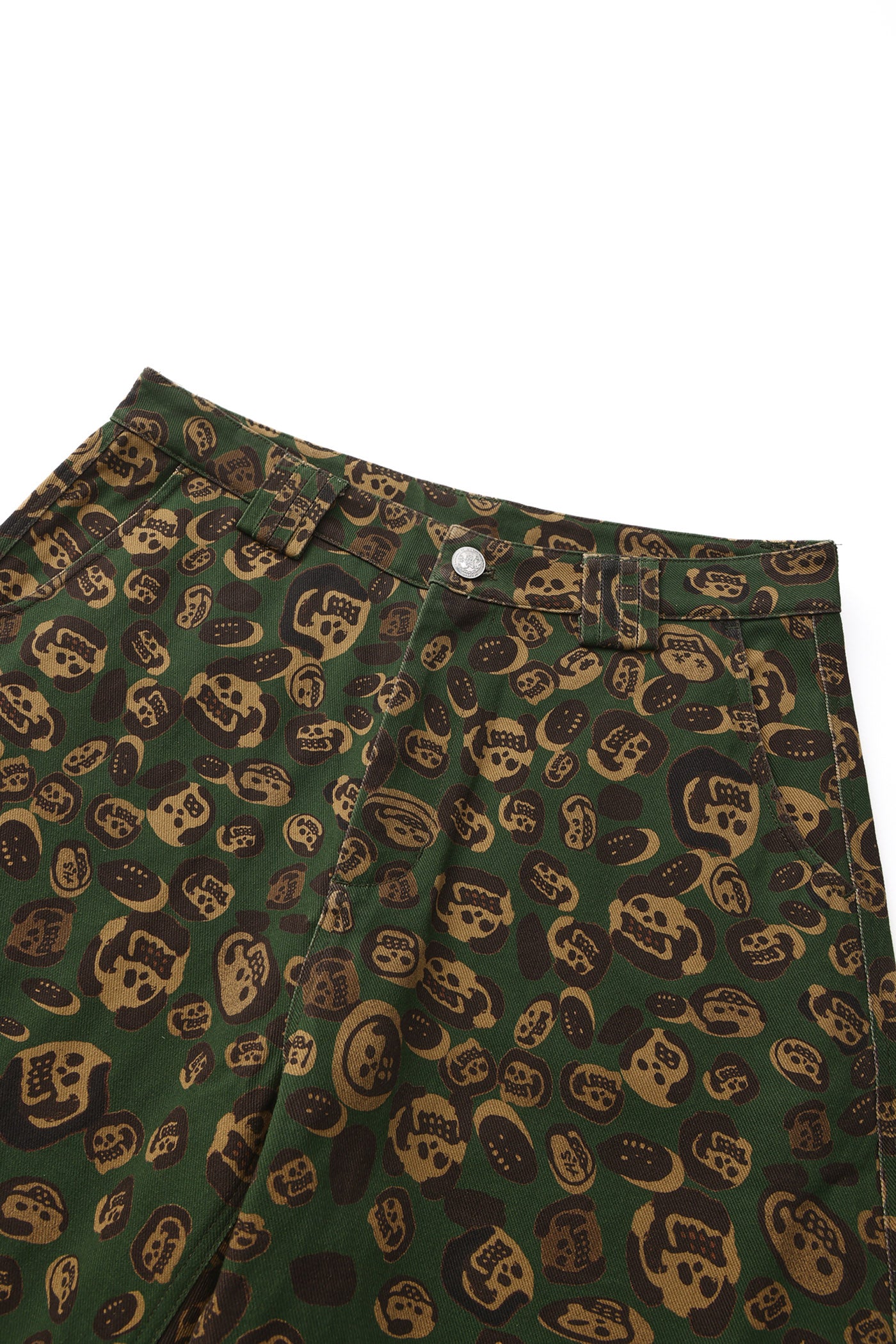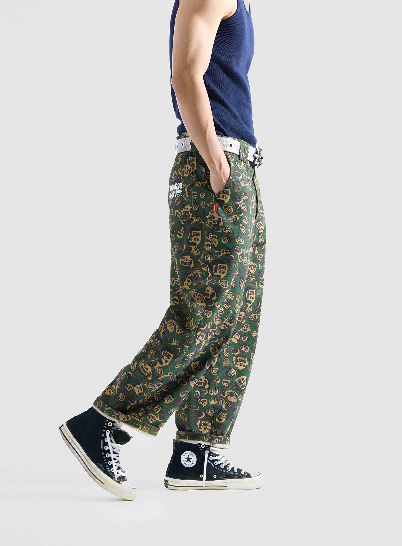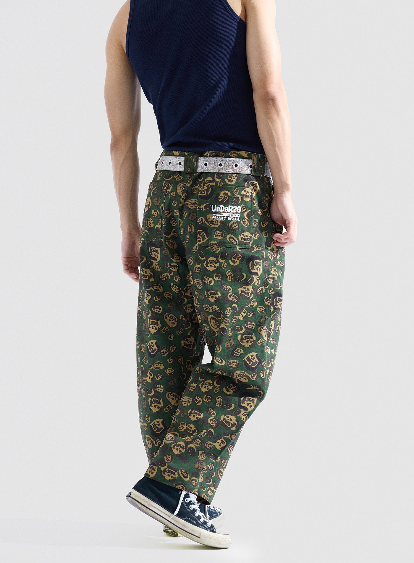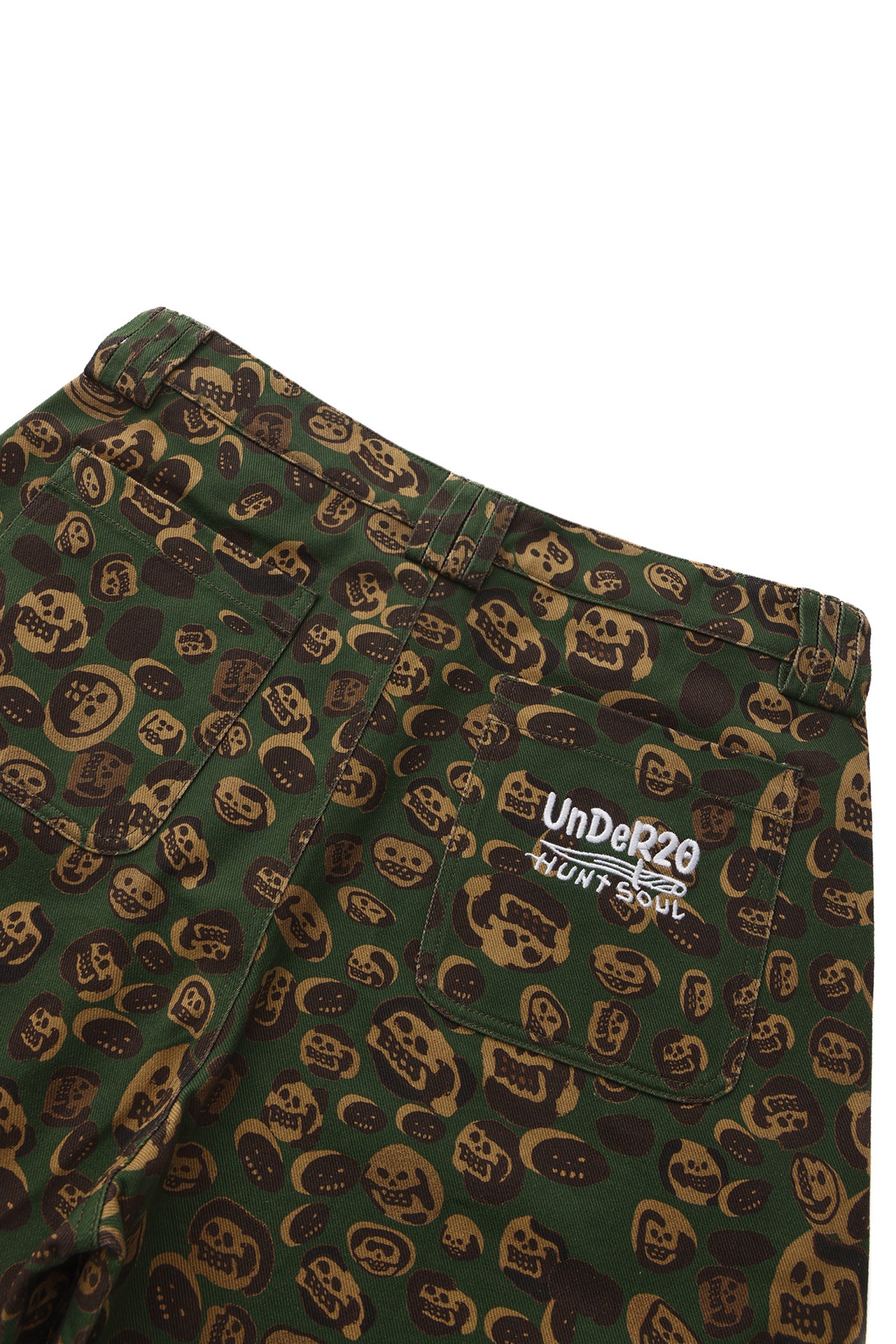 These loose-fitting wide-leg pants transform artist LIN WENXIN’s skull paintings into an all-over leopard camouflage print, creating a distinctive layered texture. From afar, it appears as leopard camo; up close, it reveals a surreal pattern of skulls. The back pocket features an embroidered UNDER20 × Hunt Soul logo, making this piece a fusion of leopard print, skull motifs, and streetwear symbolism.
