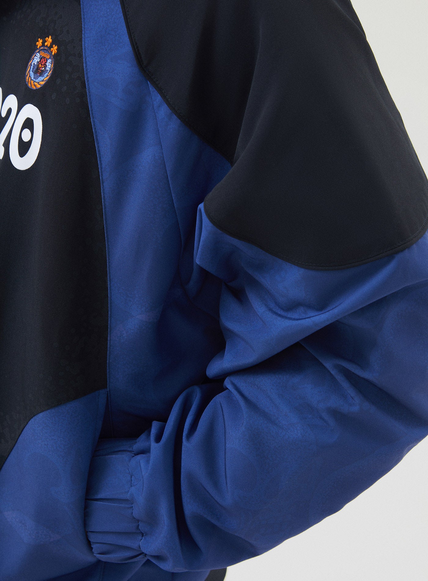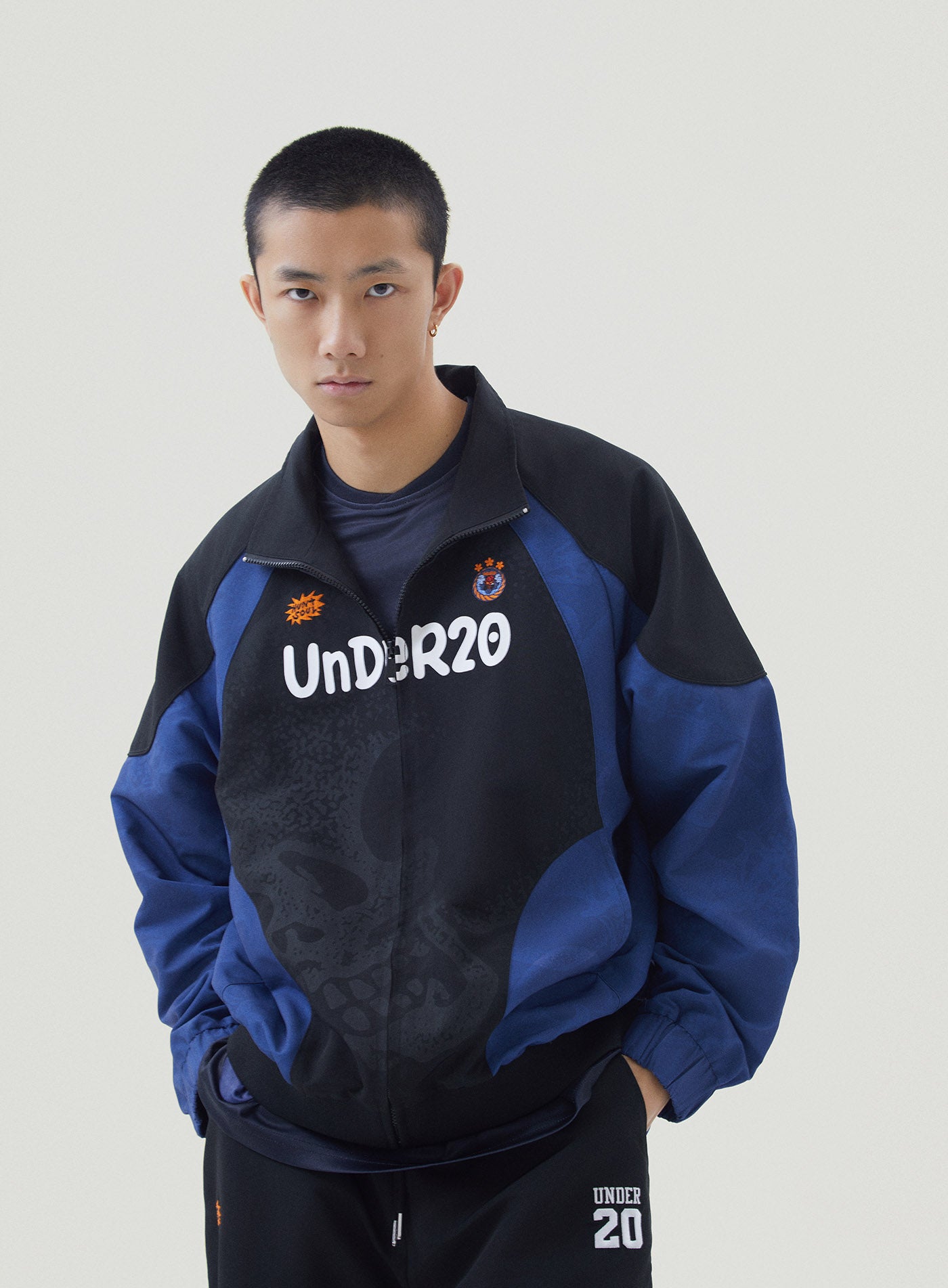 A street-sport mashup with attitude. Blue-and-black contrast blocking merges with Linwenxins signature skull graphics — loud in silence, powerful up close. UnDeR20” front details + oversized UNDER 20” back print pull from vintage team kits, built for movement and made for the city. Elastic cuffs and hem keep the shape sharp and ready for action.