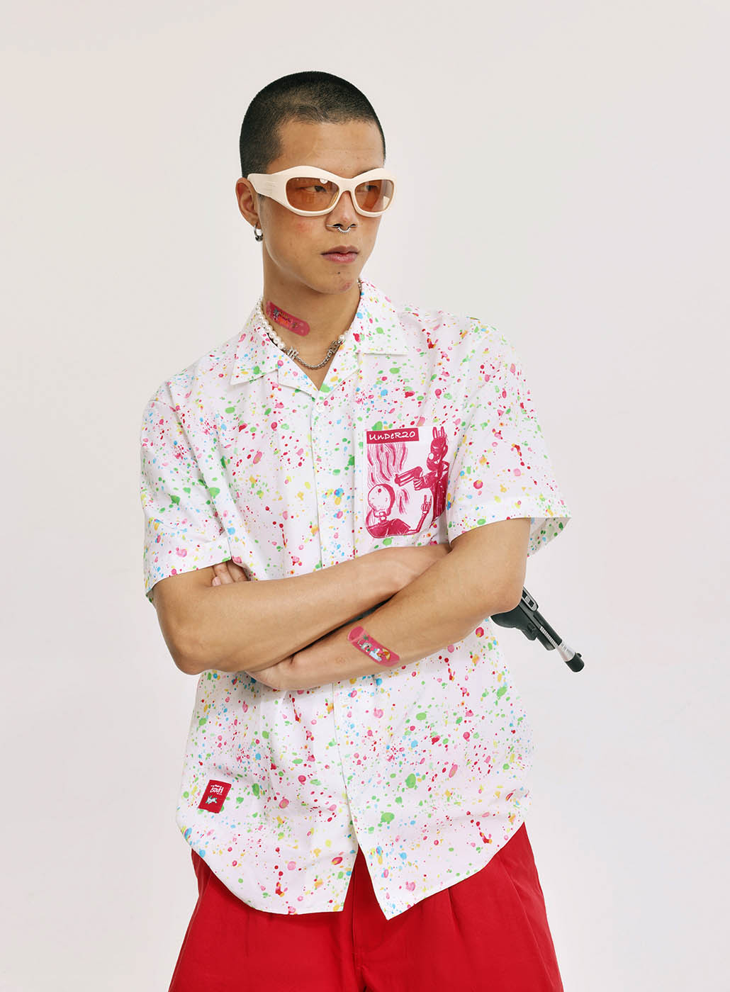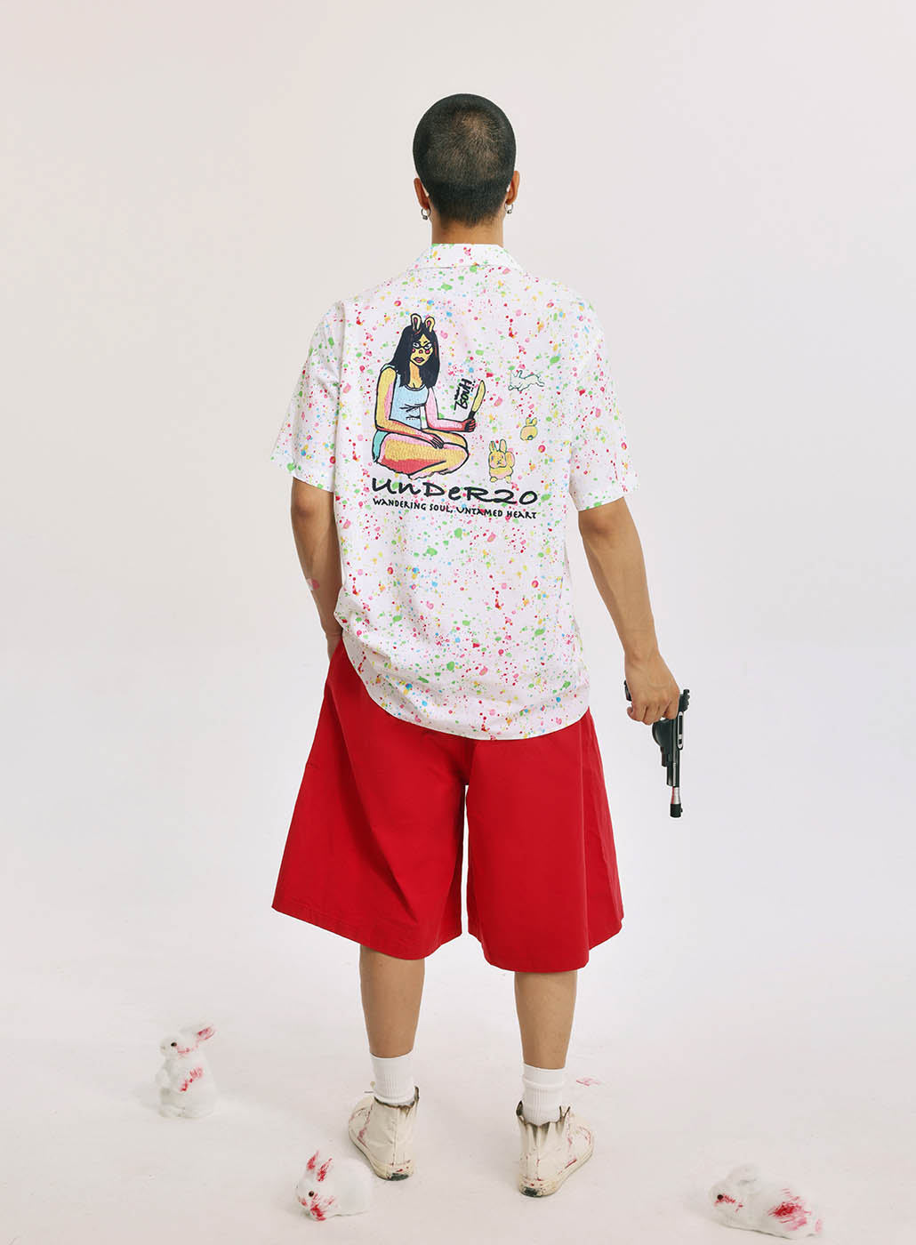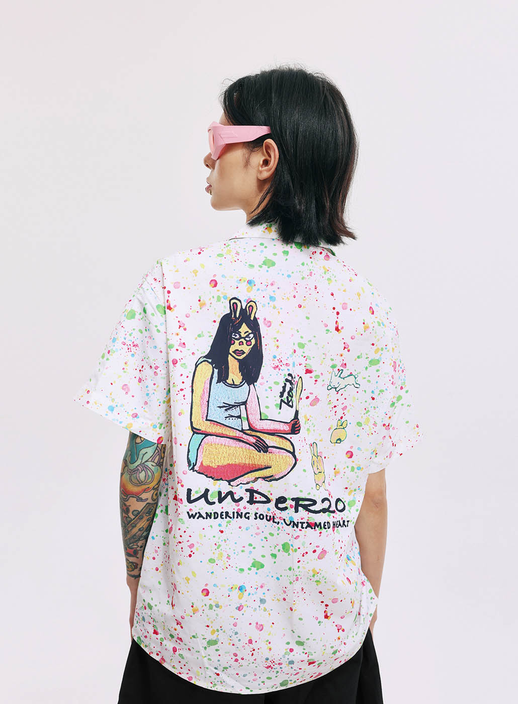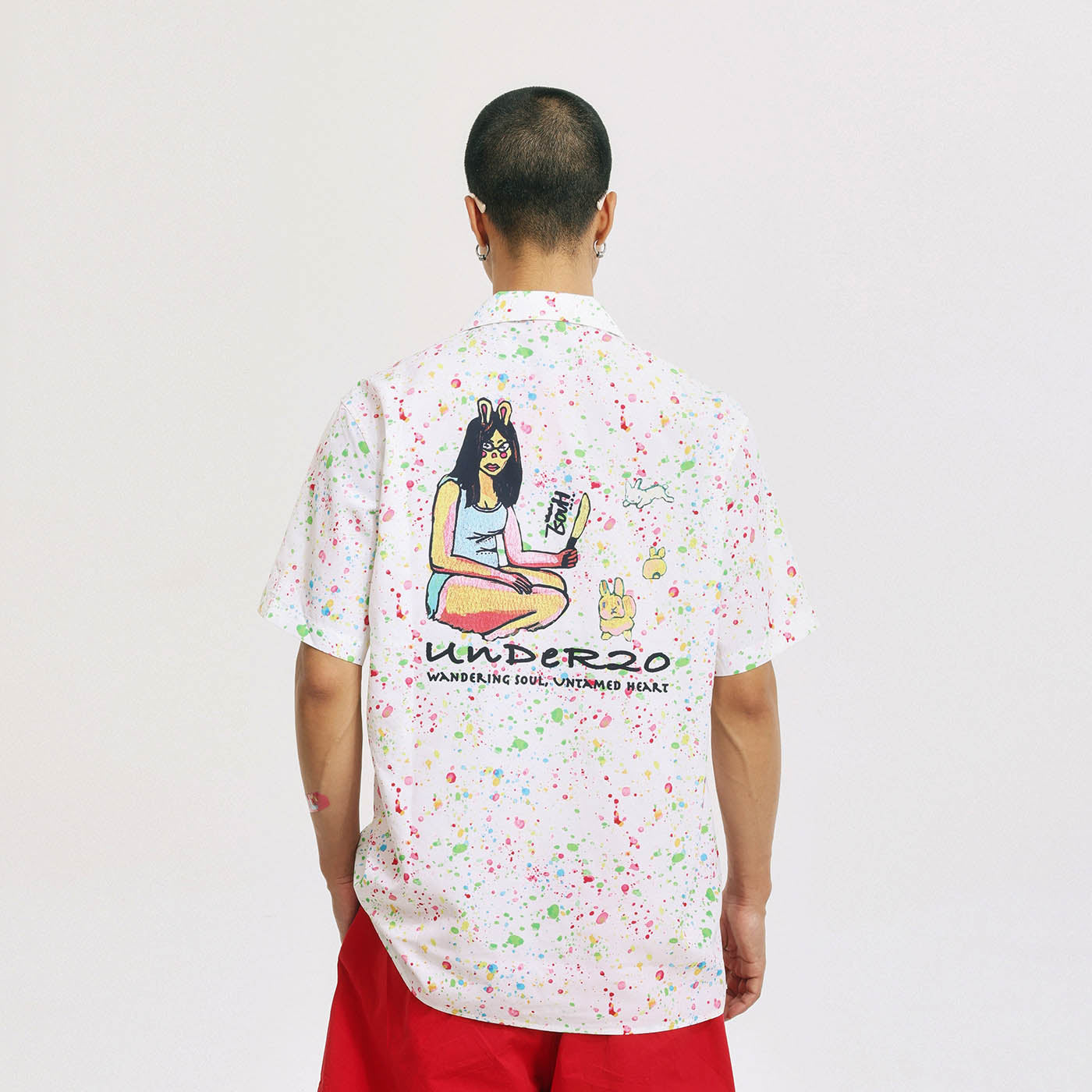 This Aloha shirt features a base design splattered with oil paint strokes, creating a vivid backdrop for graphics designed by EouH. The front pocket showcases an illustration of the "bad boy" Tailer, while the back features a bunny girl described by the artist as Tailer's girlfriend, also depicted as a fierce character. The boxy fit gives the shirt a modern, casual feel that accommodates both movement and everyday leisure.
