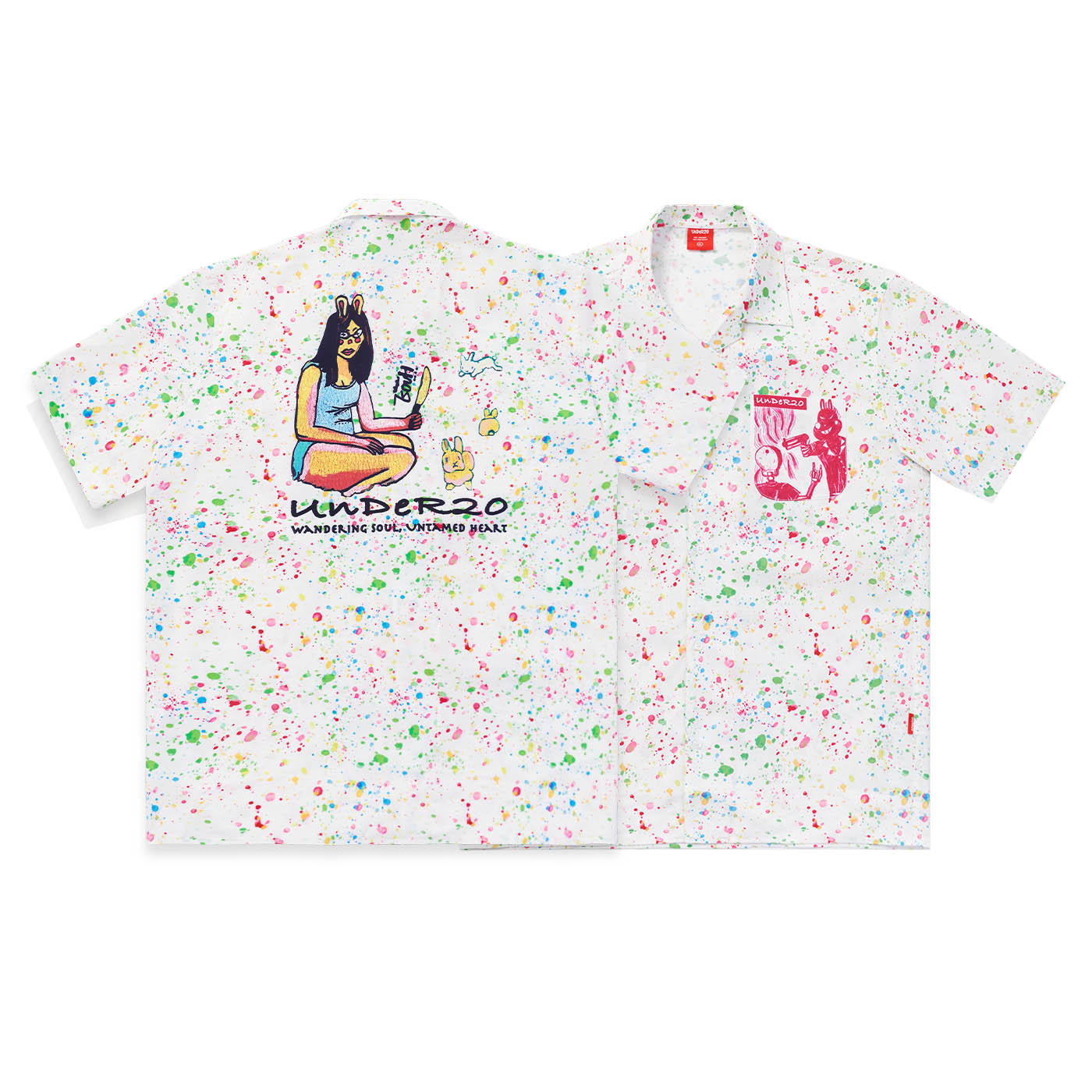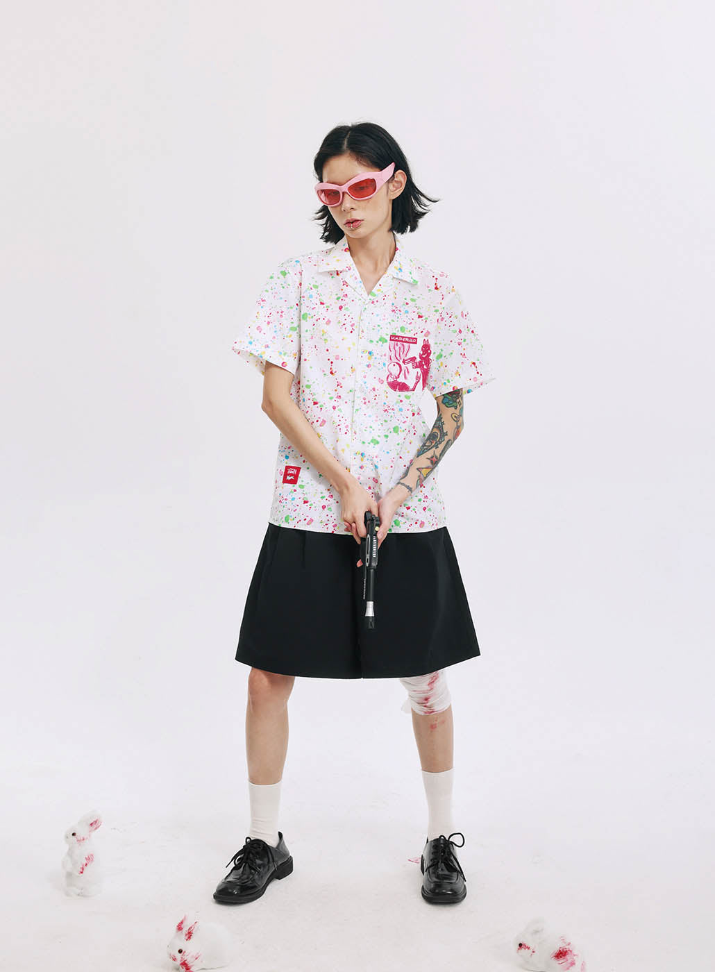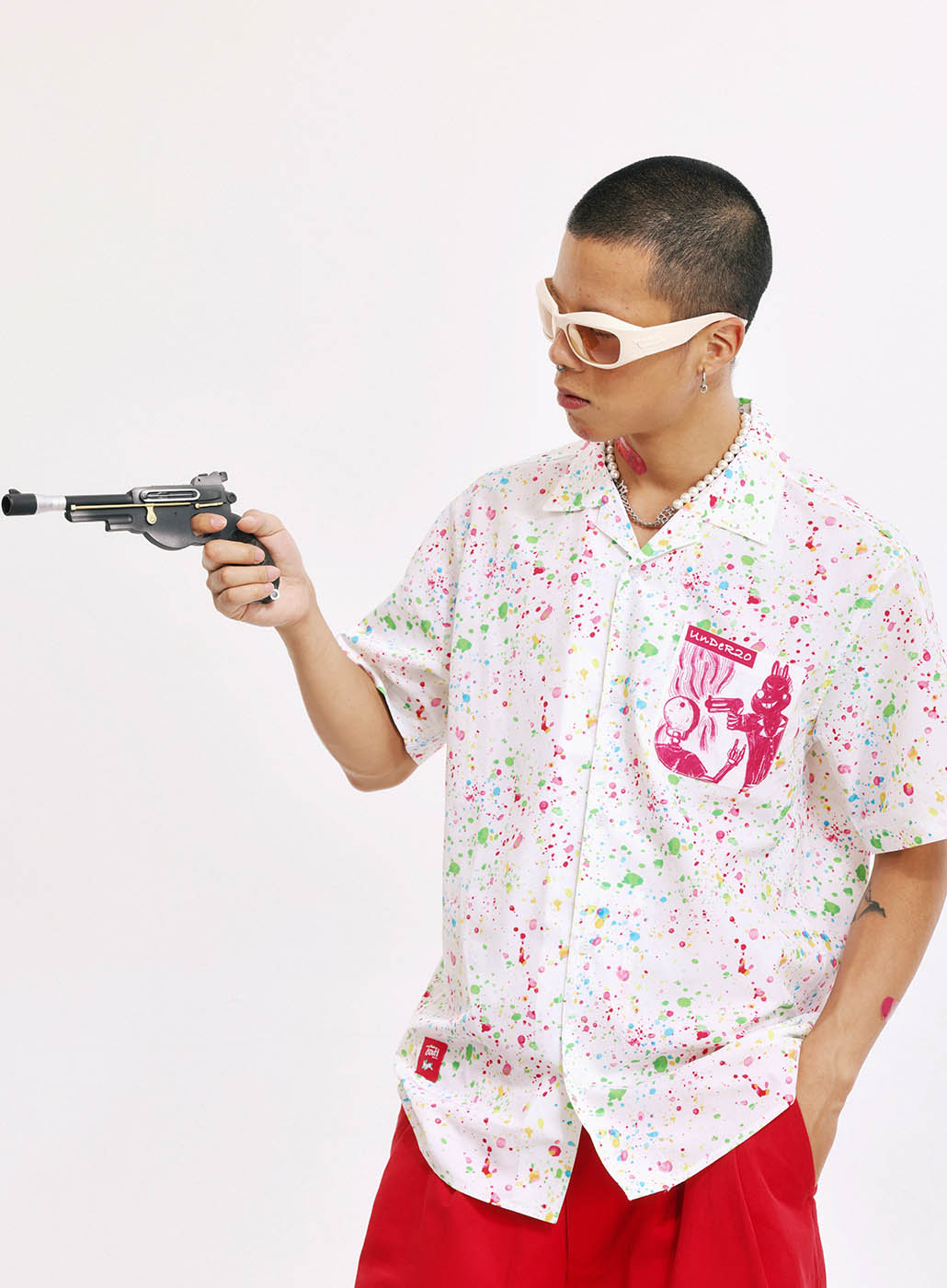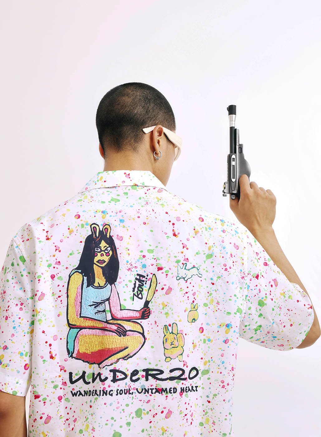 This Aloha shirt features a base design splattered with oil paint strokes, creating a vivid backdrop for graphics designed by EouH. The front pocket showcases an illustration of the "bad boy" Tailer, while the back features a bunny girl described by the artist as Tailer's girlfriend, also depicted as a fierce character. The boxy fit gives the shirt a modern, casual feel that accommodates both movement and everyday leisure.