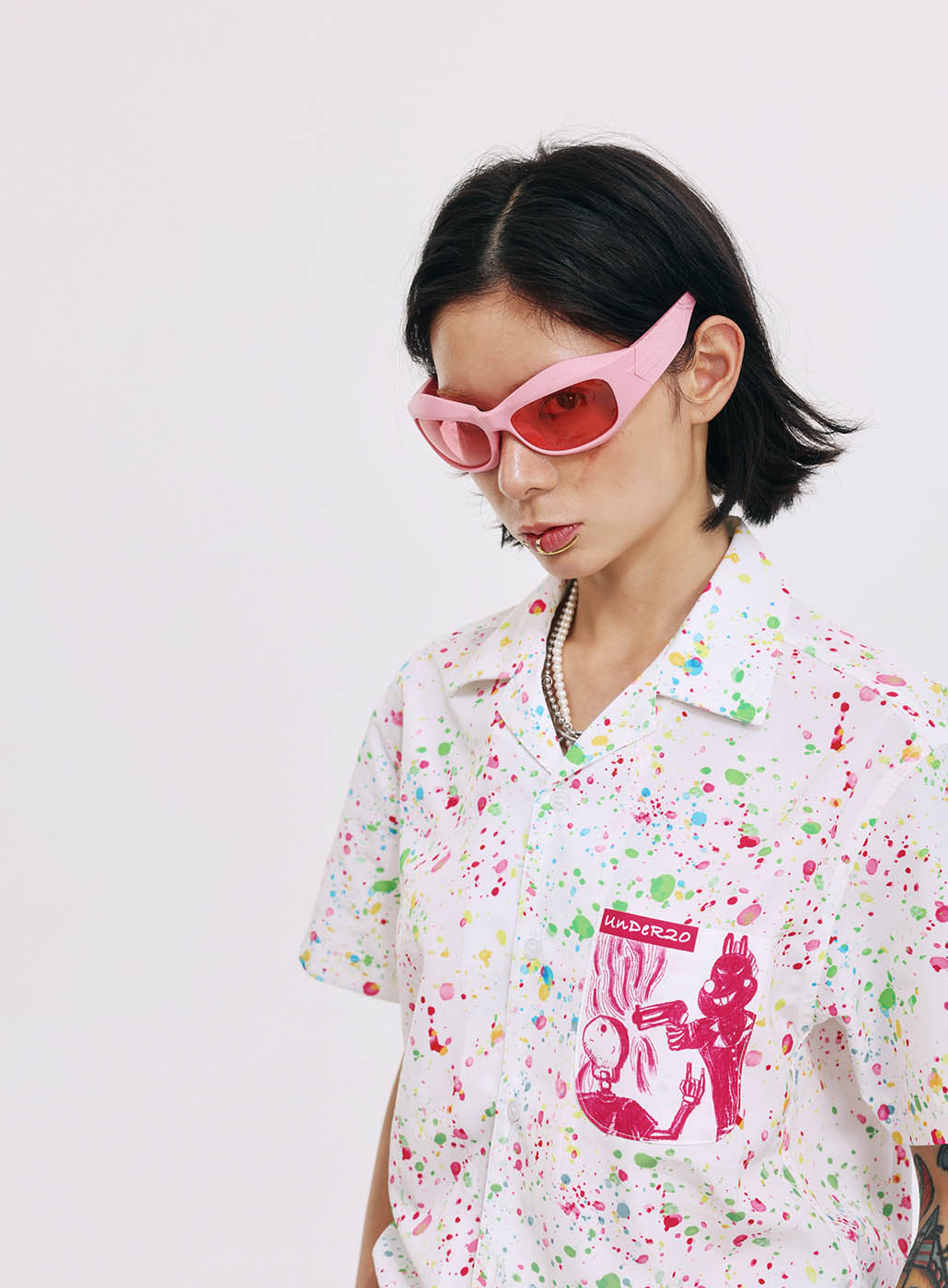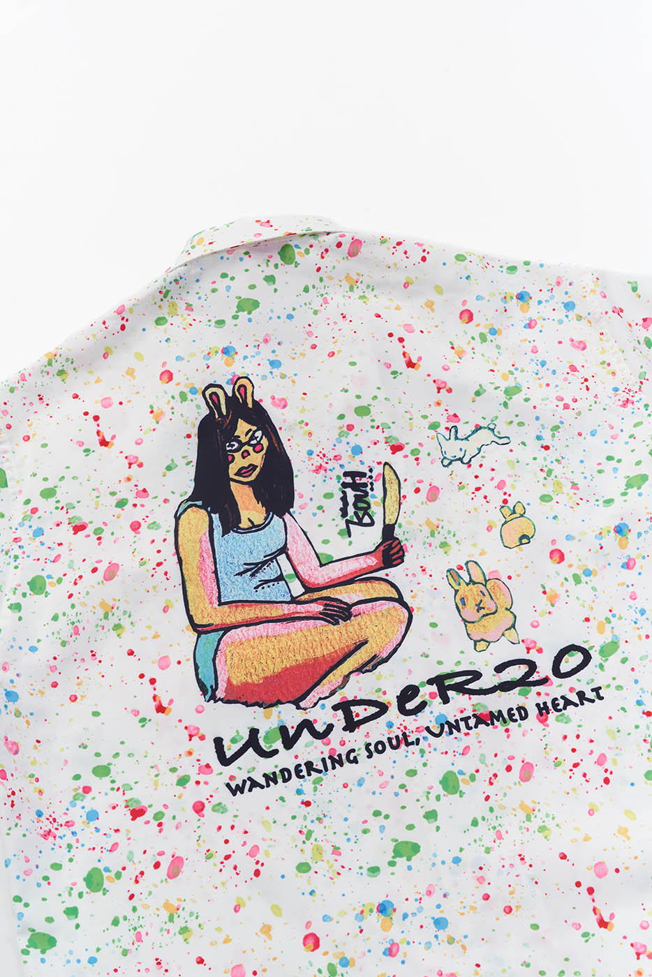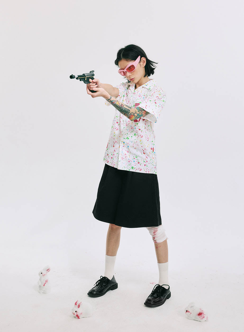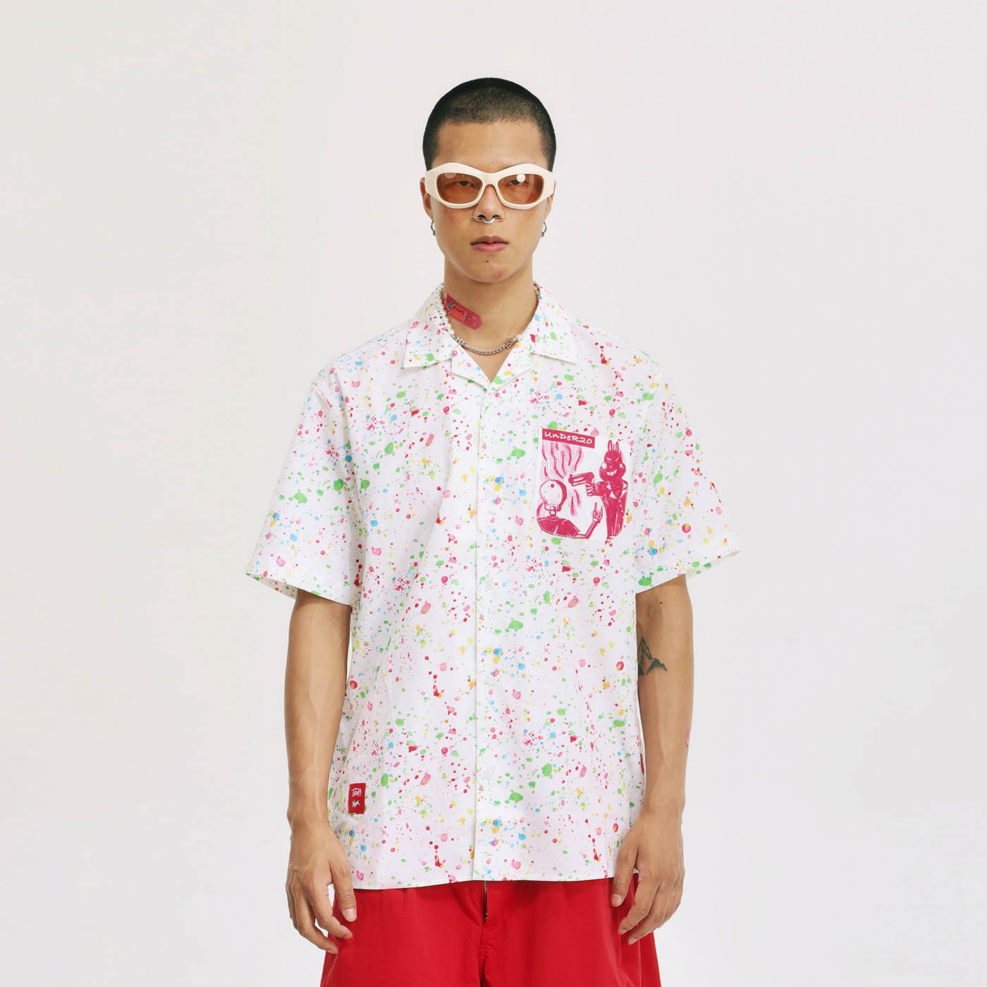 This Aloha shirt features a base design splattered with oil paint strokes, creating a vivid backdrop for graphics designed by EouH. The front pocket showcases an illustration of the "bad boy" Tailer, while the back features a bunny girl described by the artist as Tailer's girlfriend, also depicted as a fierce character. The boxy fit gives the shirt a modern, casual feel that accommodates both movement and everyday leisure.