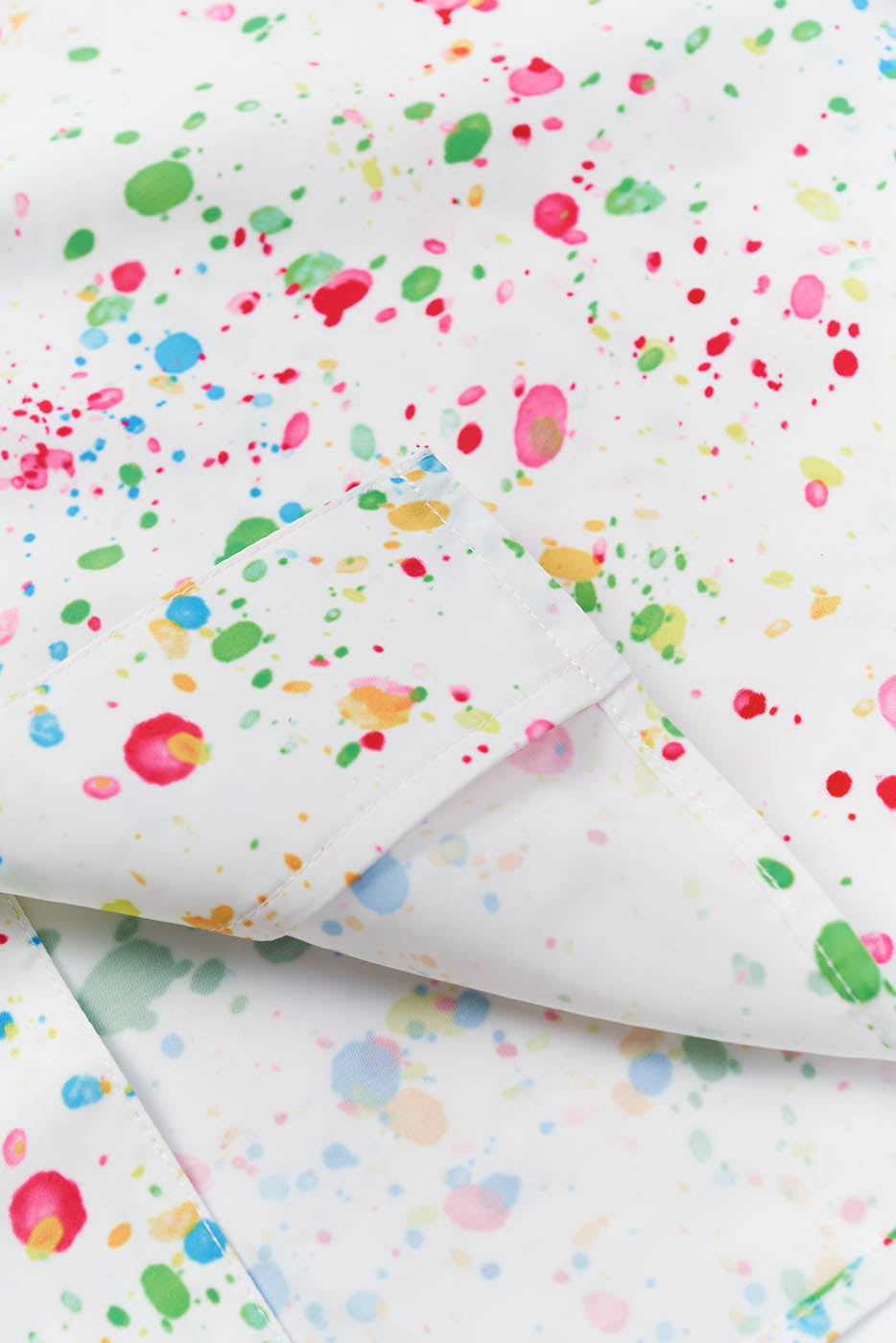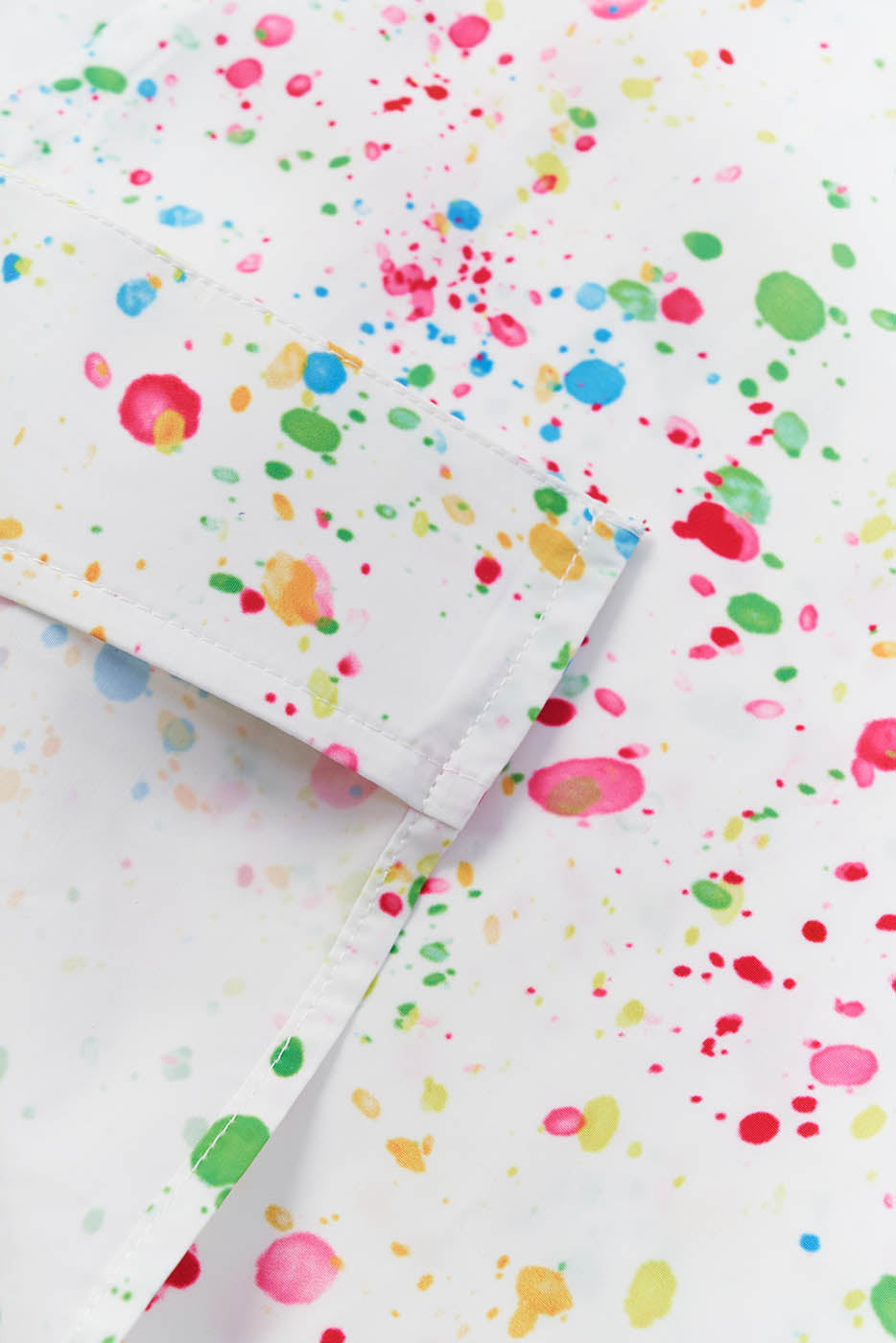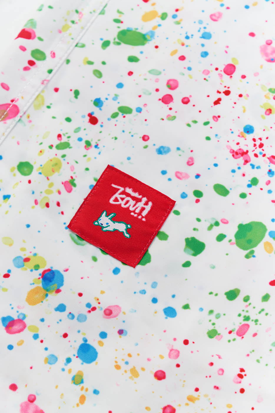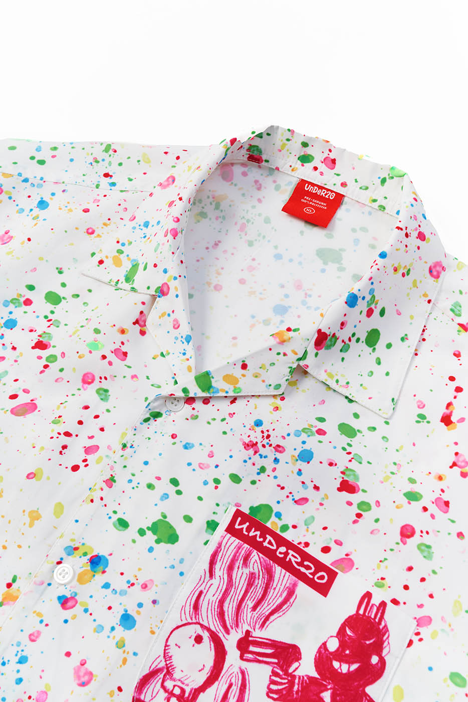 This Aloha shirt features a base design splattered with oil paint strokes, creating a vivid backdrop for graphics designed by EouH. The front pocket showcases an illustration of the "bad boy" Tailer, while the back features a bunny girl described by the artist as Tailer's girlfriend, also depicted as a fierce character. The boxy fit gives the shirt a modern, casual feel that accommodates both movement and everyday leisure.