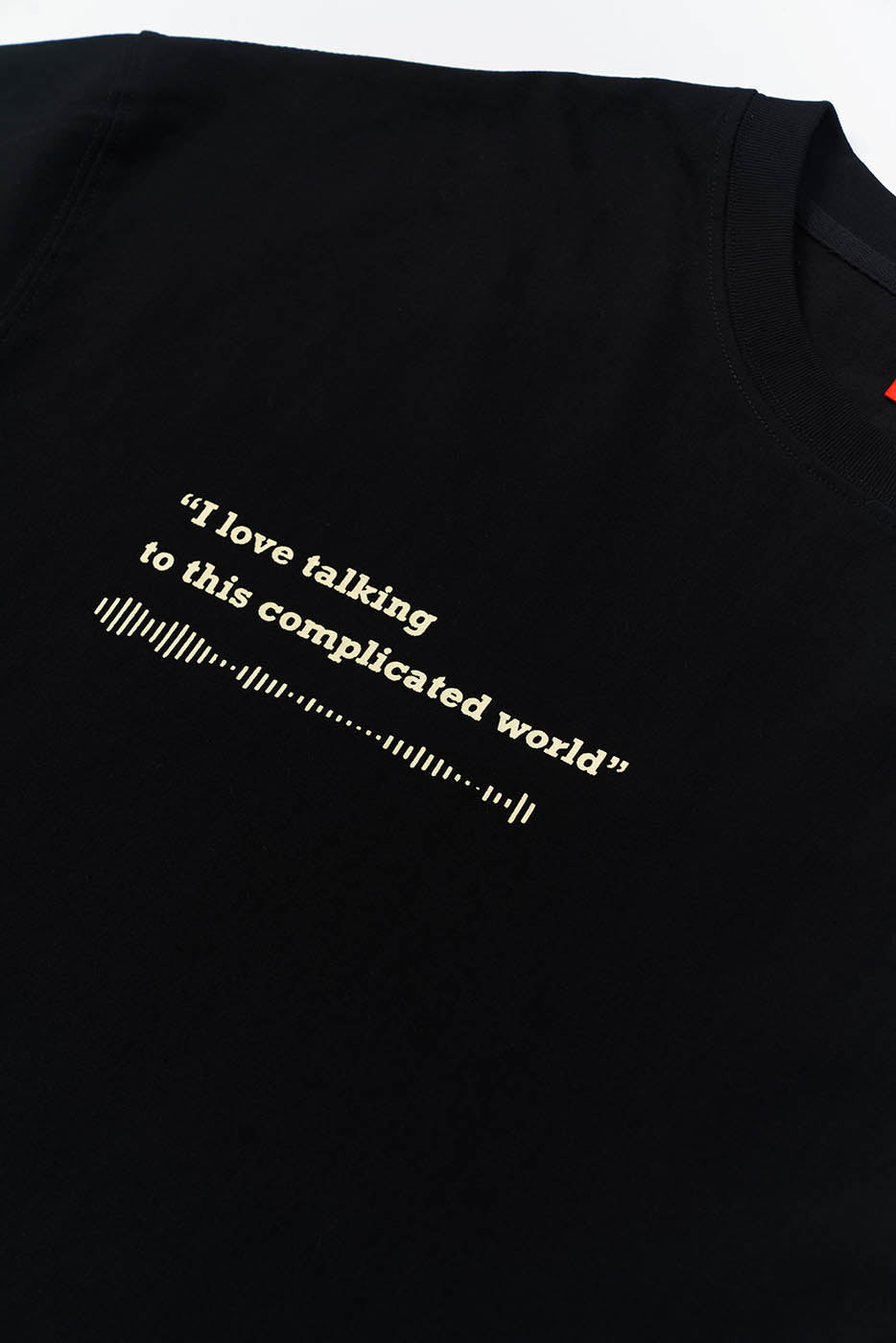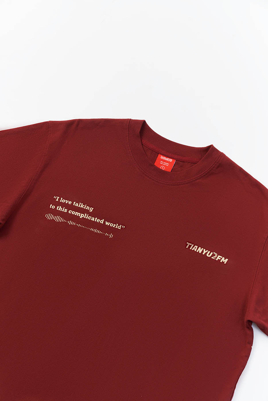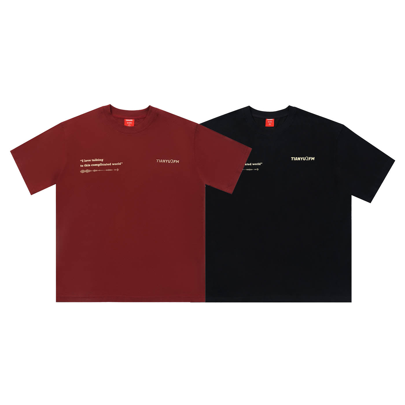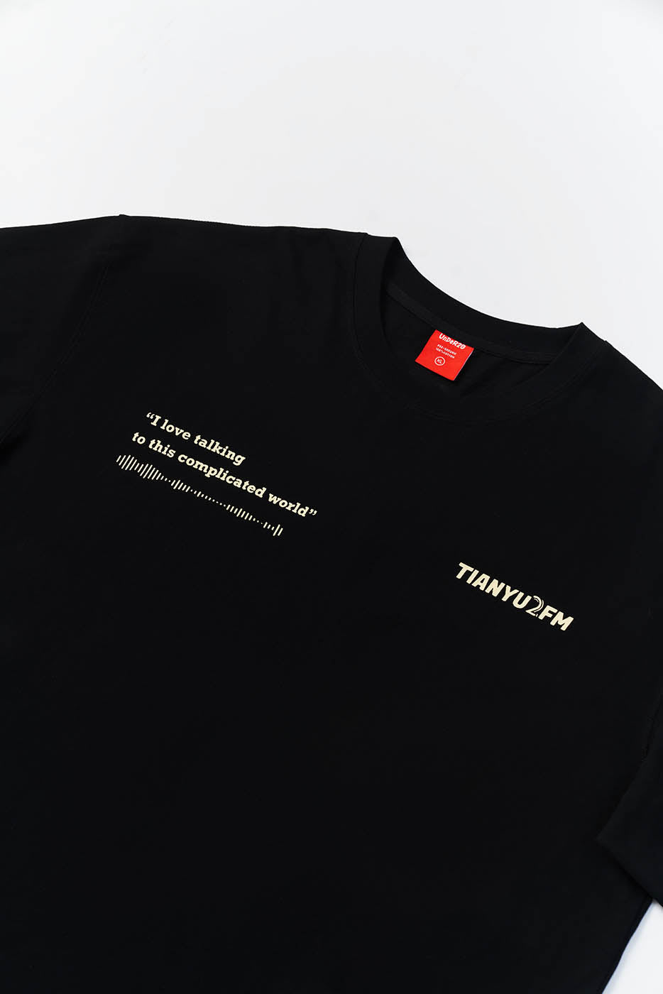 This is our first merchandise, co-designed by Tianyu and Tianyu, and produced under the supervision of TenGuSan. The colors are inspired by the TIANYU2FM logo's color scheme. The red enhances whiteness, and black is slimming! We've centered our design around the podcast's defining feature—sound—and depicted it on both the front and back of the shirt. The phrases "I love talking to this complicated world" and "resonate with the world" not only reflect our content creation experiences but also our insights and aspirations.