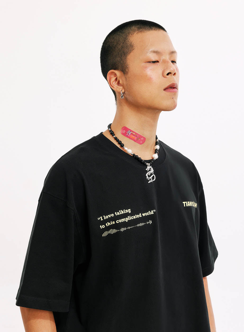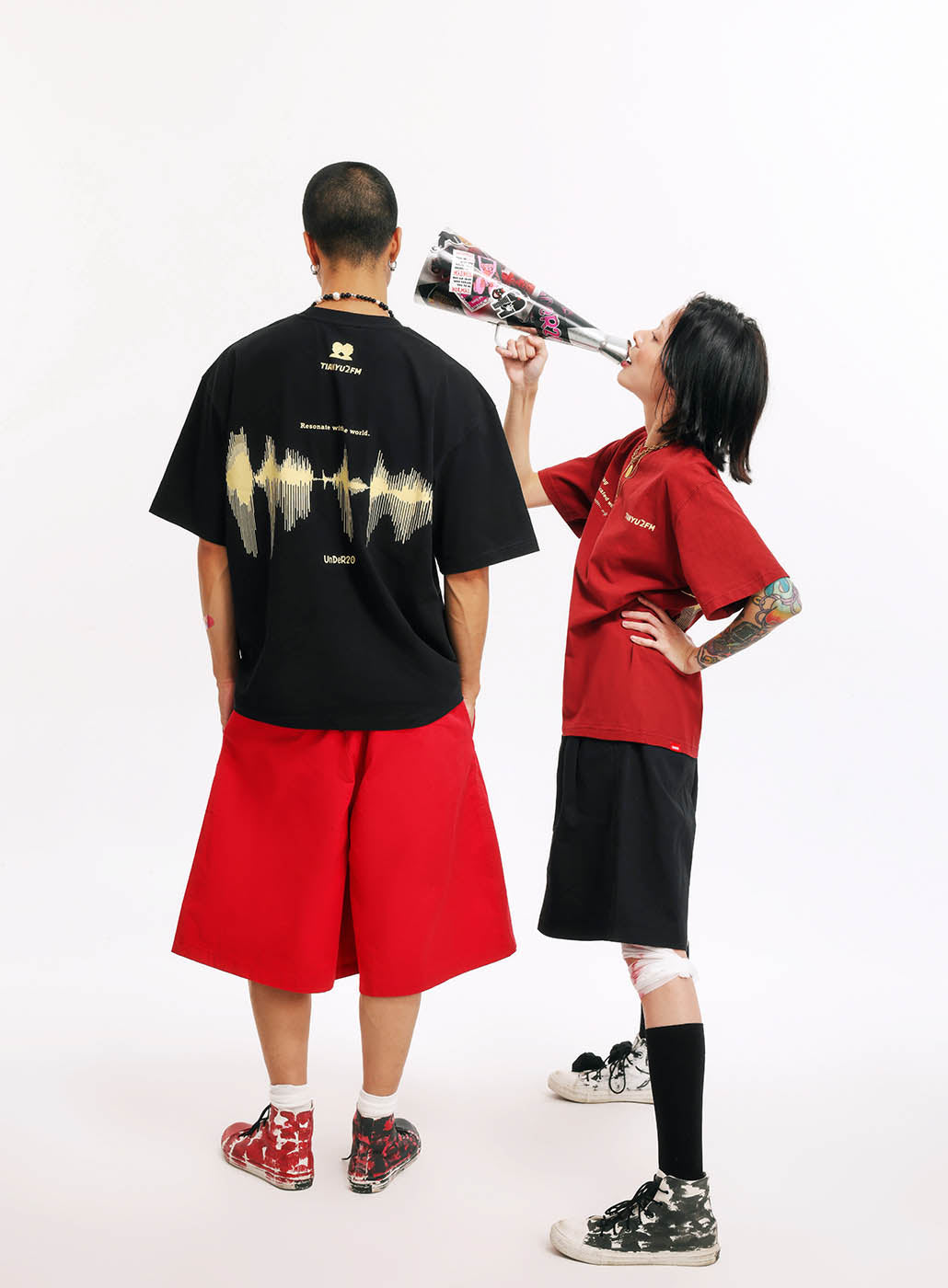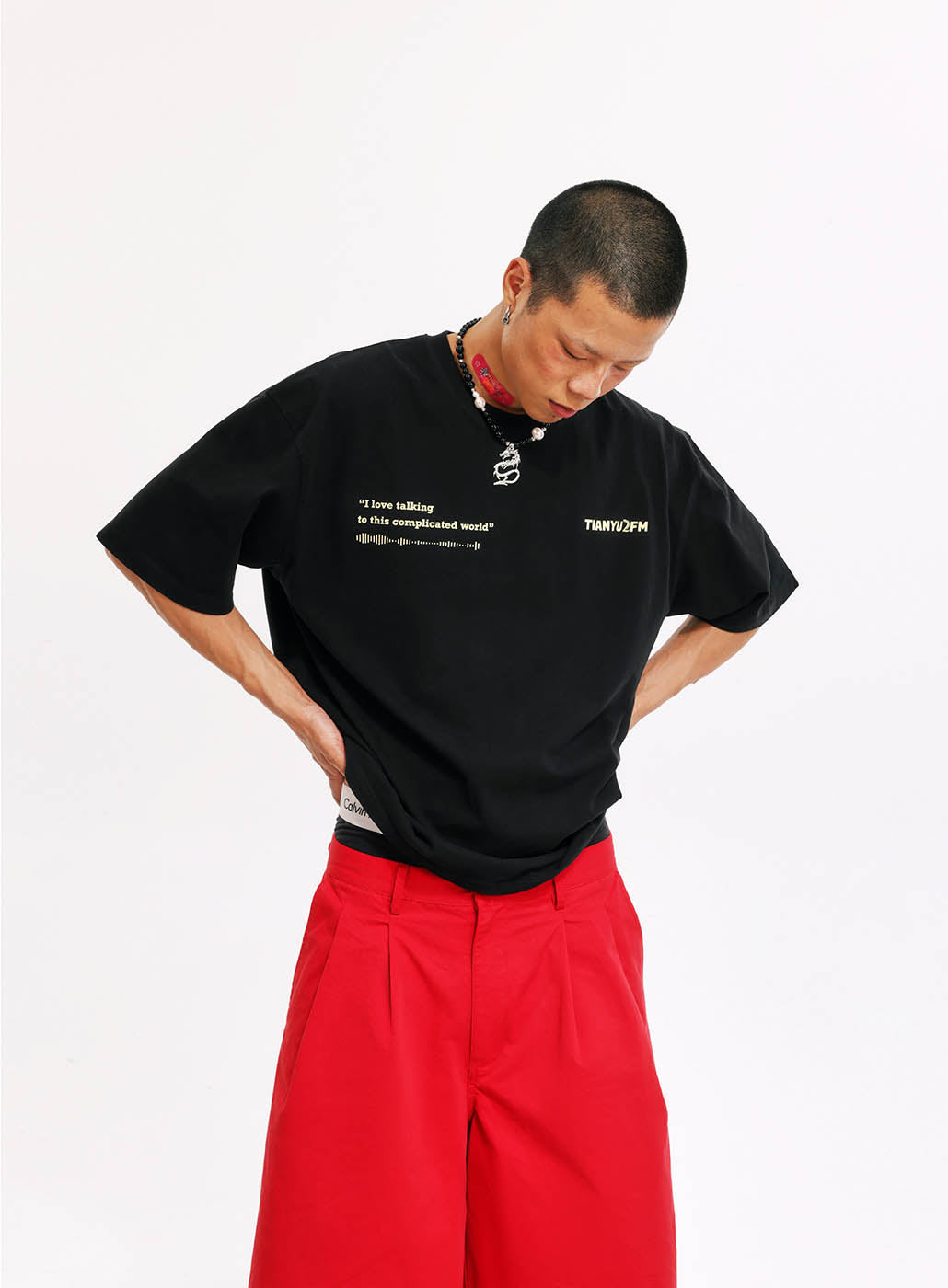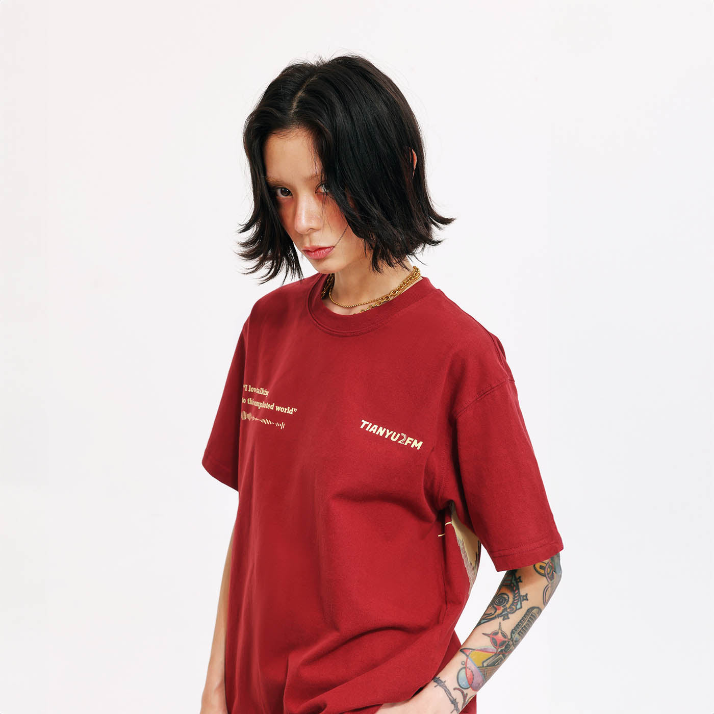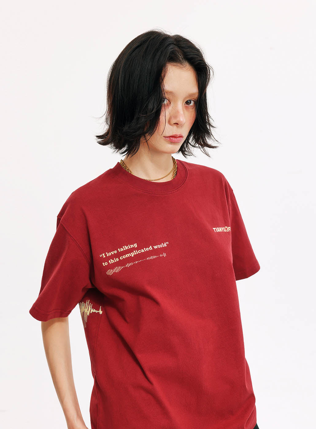 This is our first merchandise, co-designed by Tianyu and Tianyu, and produced under the supervision of TenGuSan. The colors are inspired by the TIANYU2FM logo's color scheme. The red enhances whiteness, and black is slimming! We've centered our design around the podcast's defining feature—sound—and depicted it on both the front and back of the shirt. The phrases "I love talking to this complicated world" and "resonate with the world" not only reflect our content creation experiences but also our insights and aspirations.