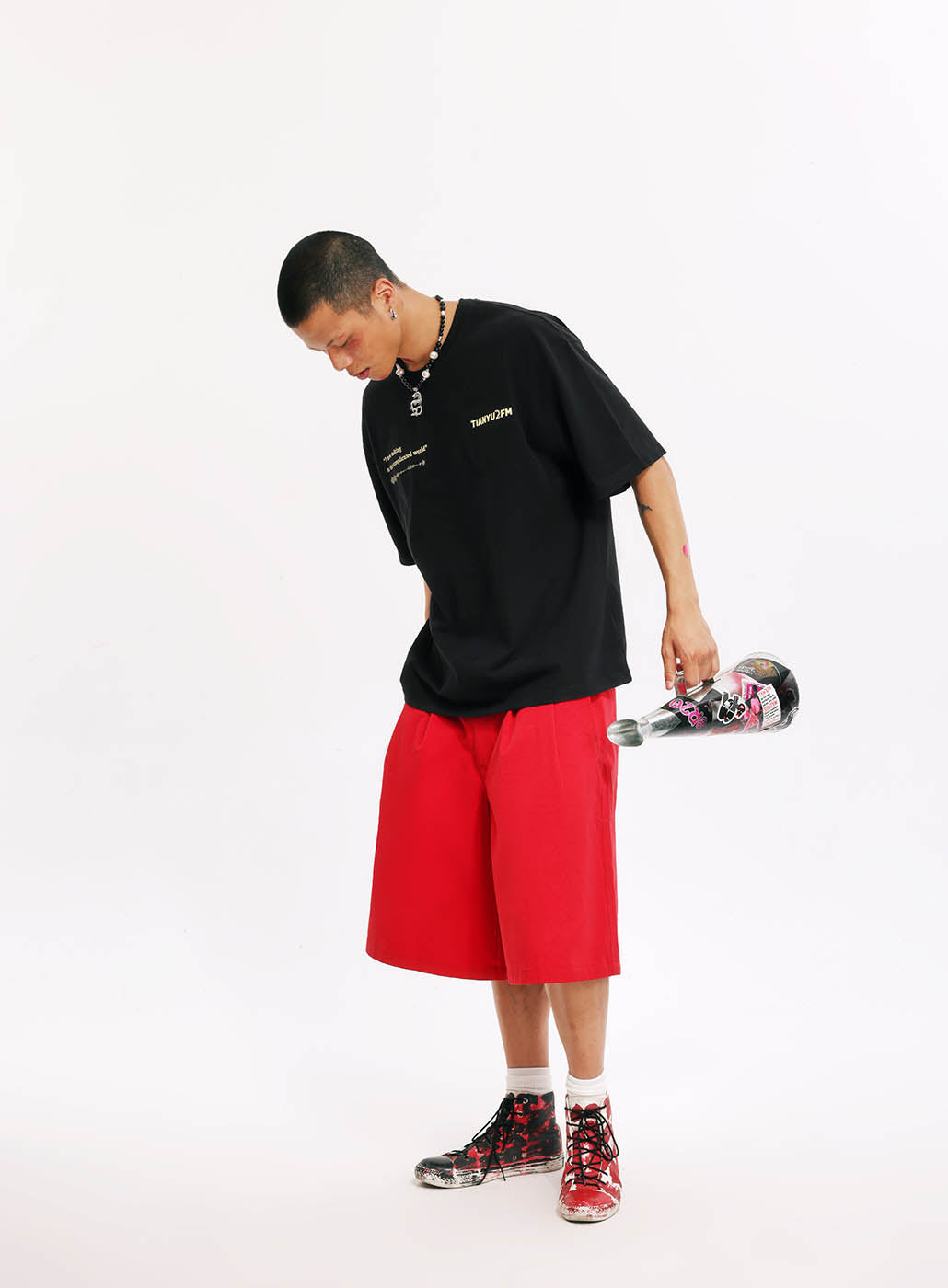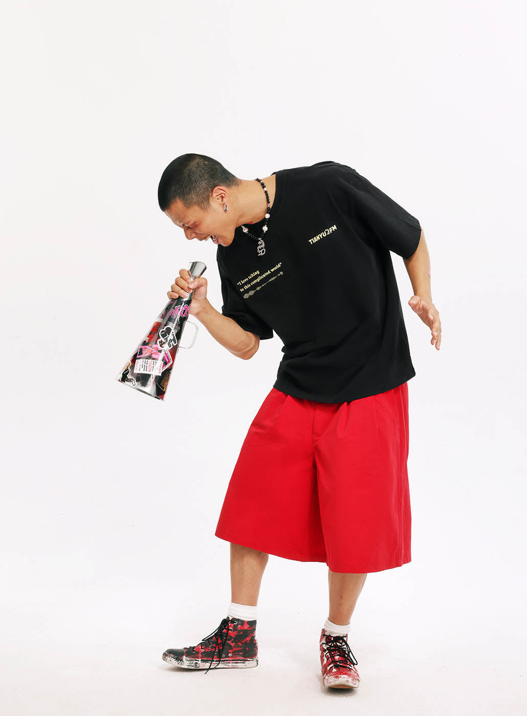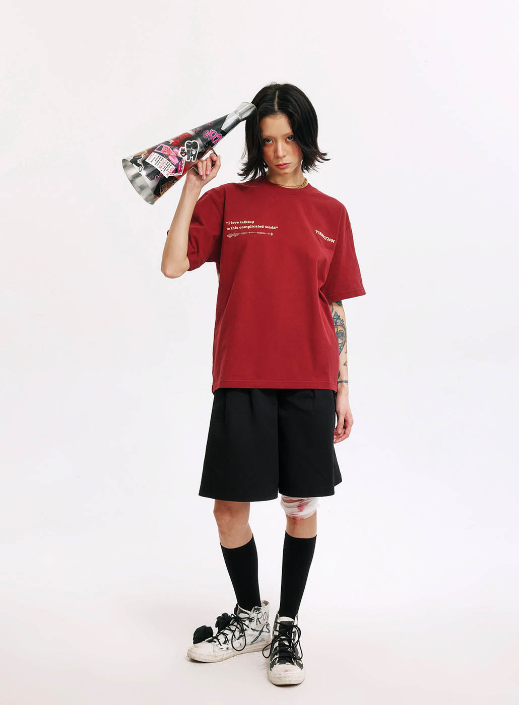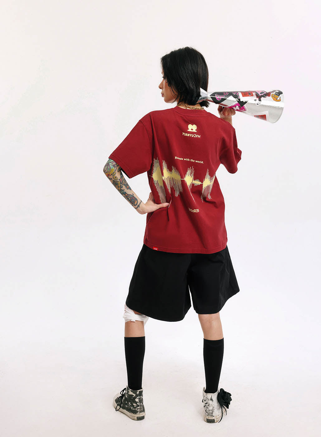 This is our first merchandise, co-designed by Tianyu and Tianyu, and produced under the supervision of TenGuSan. The colors are inspired by the TIANYU2FM logo's color scheme. The red enhances whiteness, and black is slimming! We've centered our design around the podcast's defining feature—sound—and depicted it on both the front and back of the shirt. The phrases "I love talking to this complicated world" and "resonate with the world" not only reflect our content creation experiences but also our insights and aspirations.