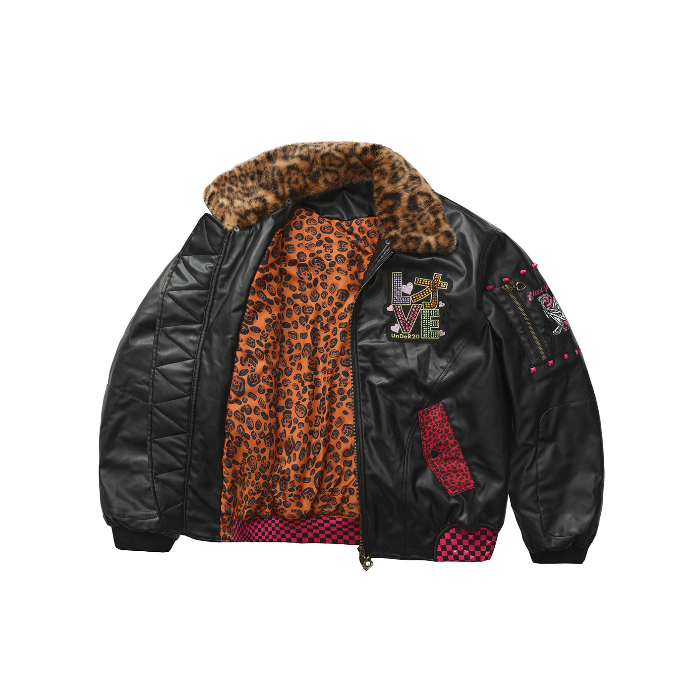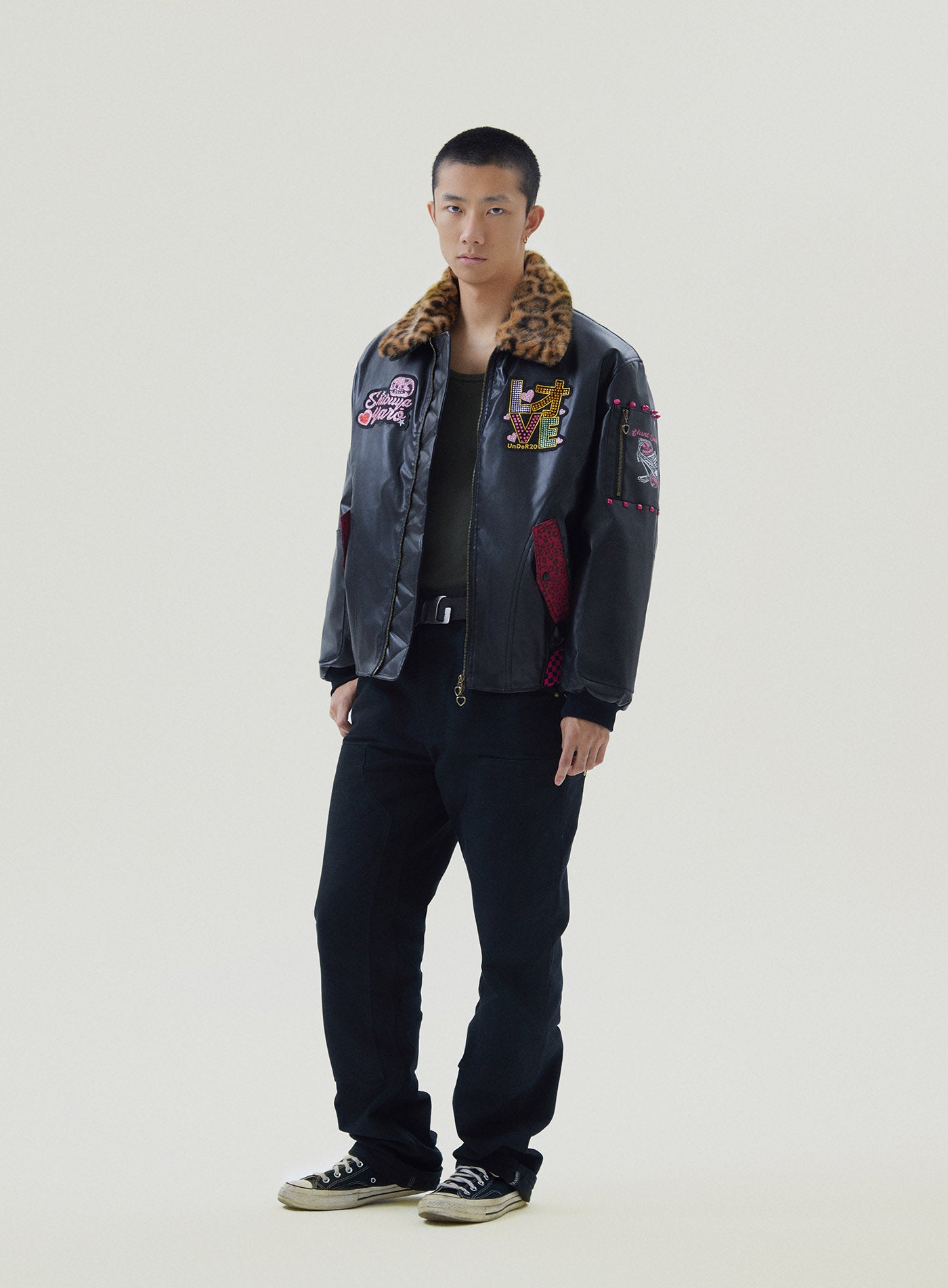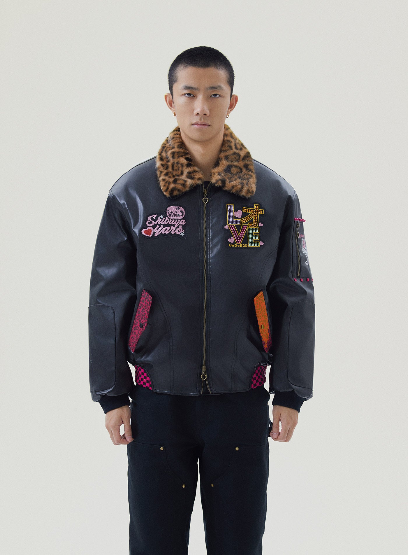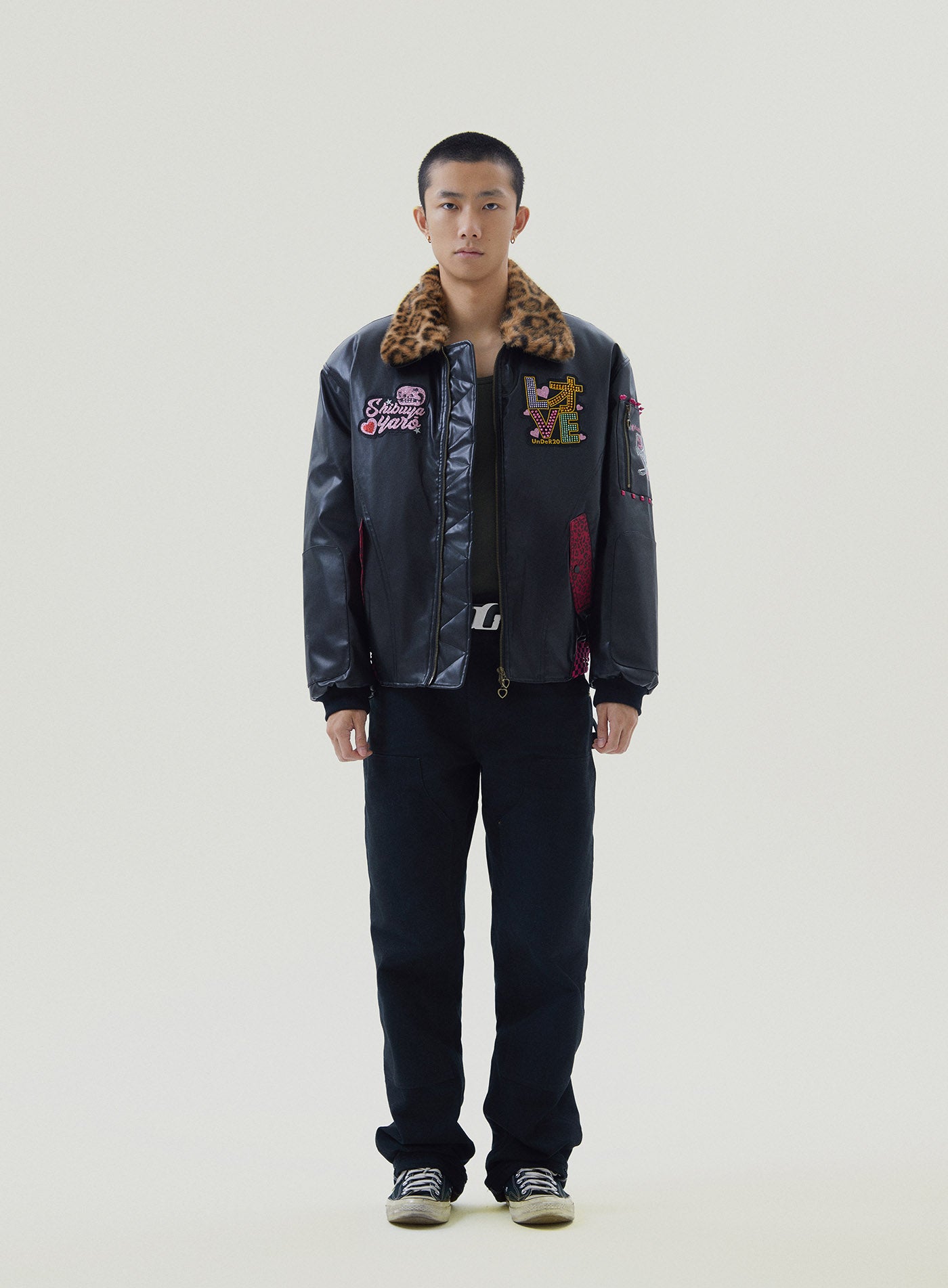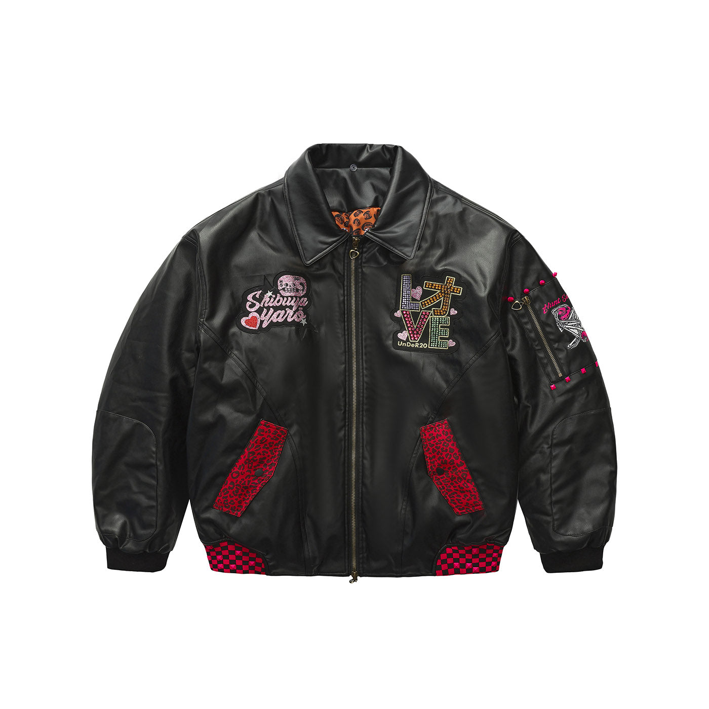 A reworked B-15 bomber injected with full-throttle Shibuya attitude. Black leather meets leopard faux fur (collar + lining) for that peak Tokyo Y2K heat. Glitter and rhinestones blast out “LOVE” and “Shibuya Yaro” on the chest — dramatic, extra, unapologetic. Checkerboard ribbing, pink studs and metal spikes push the punk voltage higher.