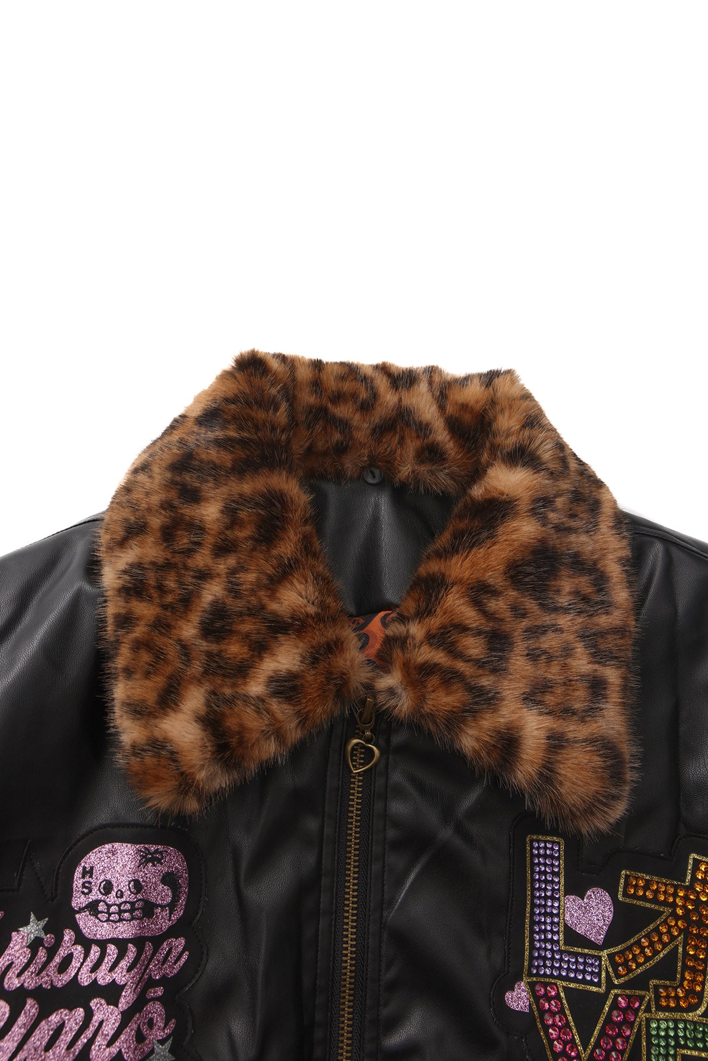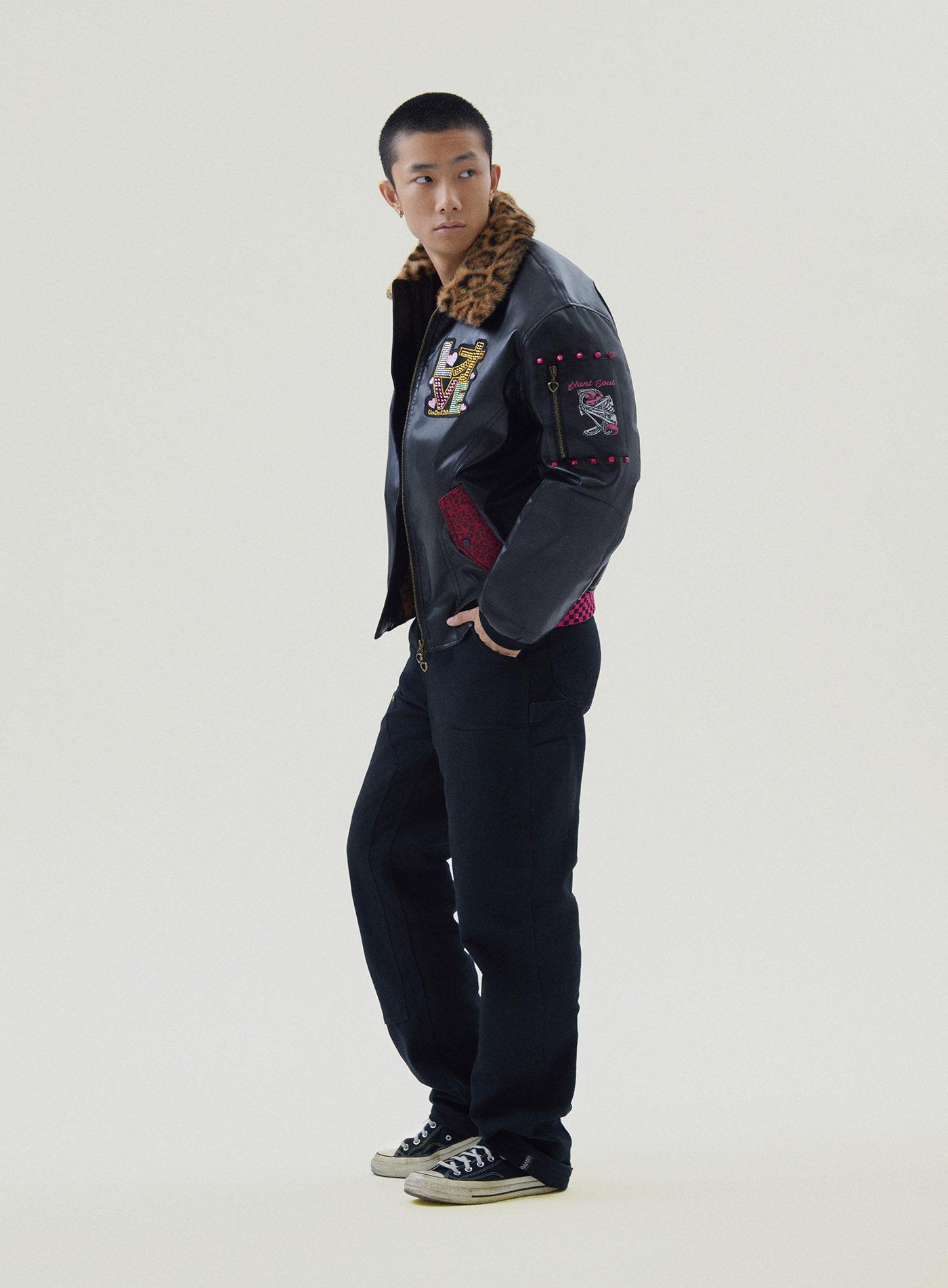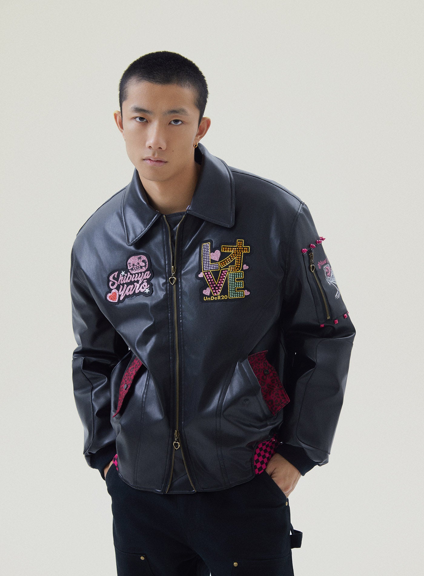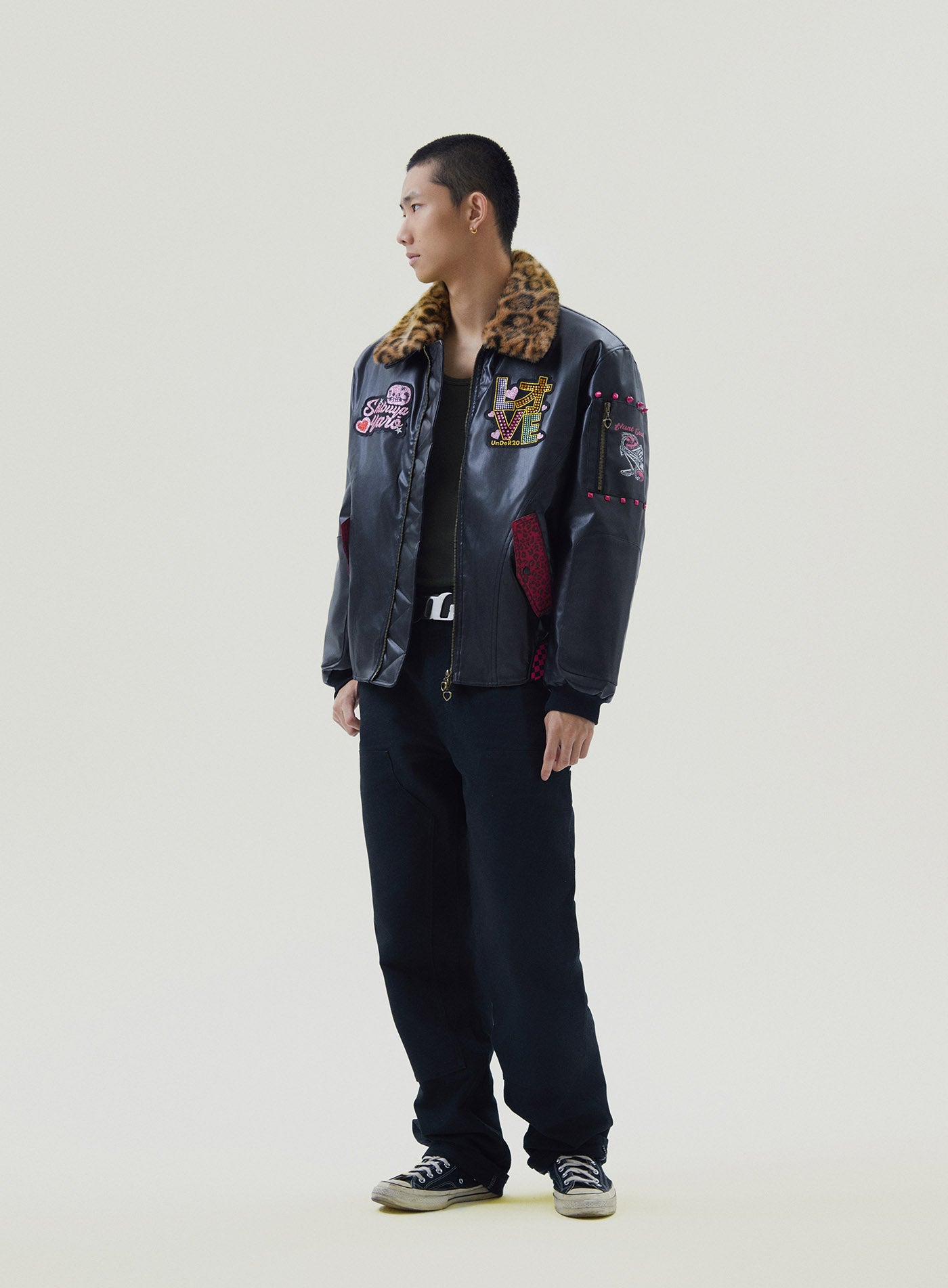A reworked B-15 bomber injected with full-throttle Shibuya attitude. Black leather meets leopard faux fur (collar + lining) for that peak Tokyo Y2K heat. Glitter and rhinestones blast out “LOVE” and “Shibuya Yaro” on the chest — dramatic, extra, unapologetic. Checkerboard ribbing, pink studs and metal spikes push the punk voltage higher.