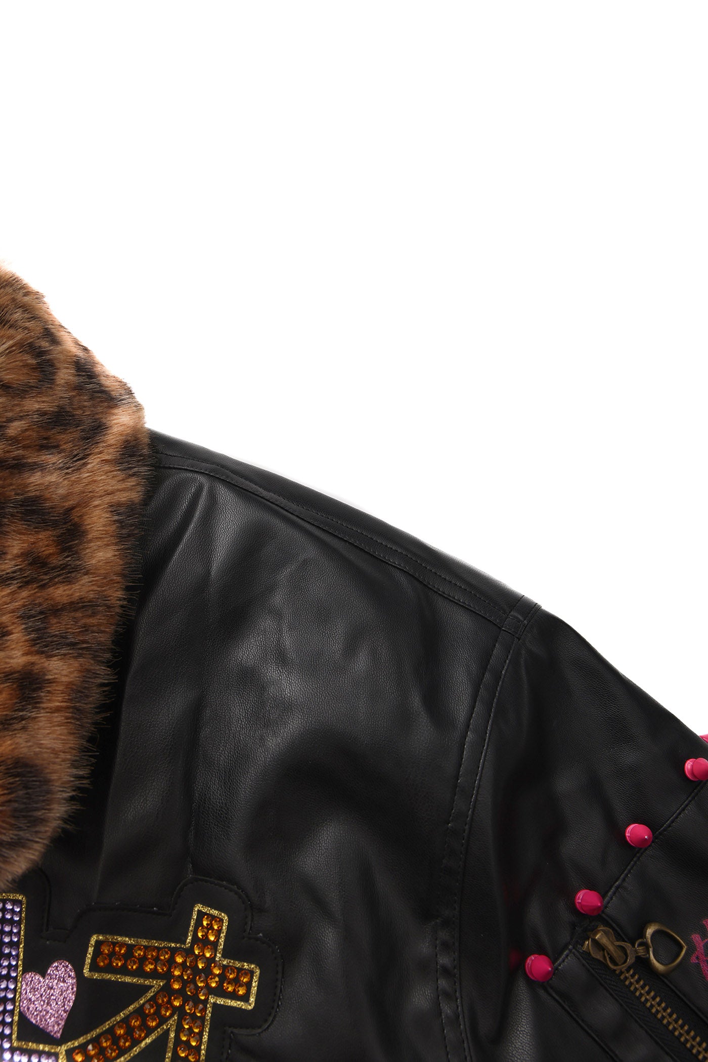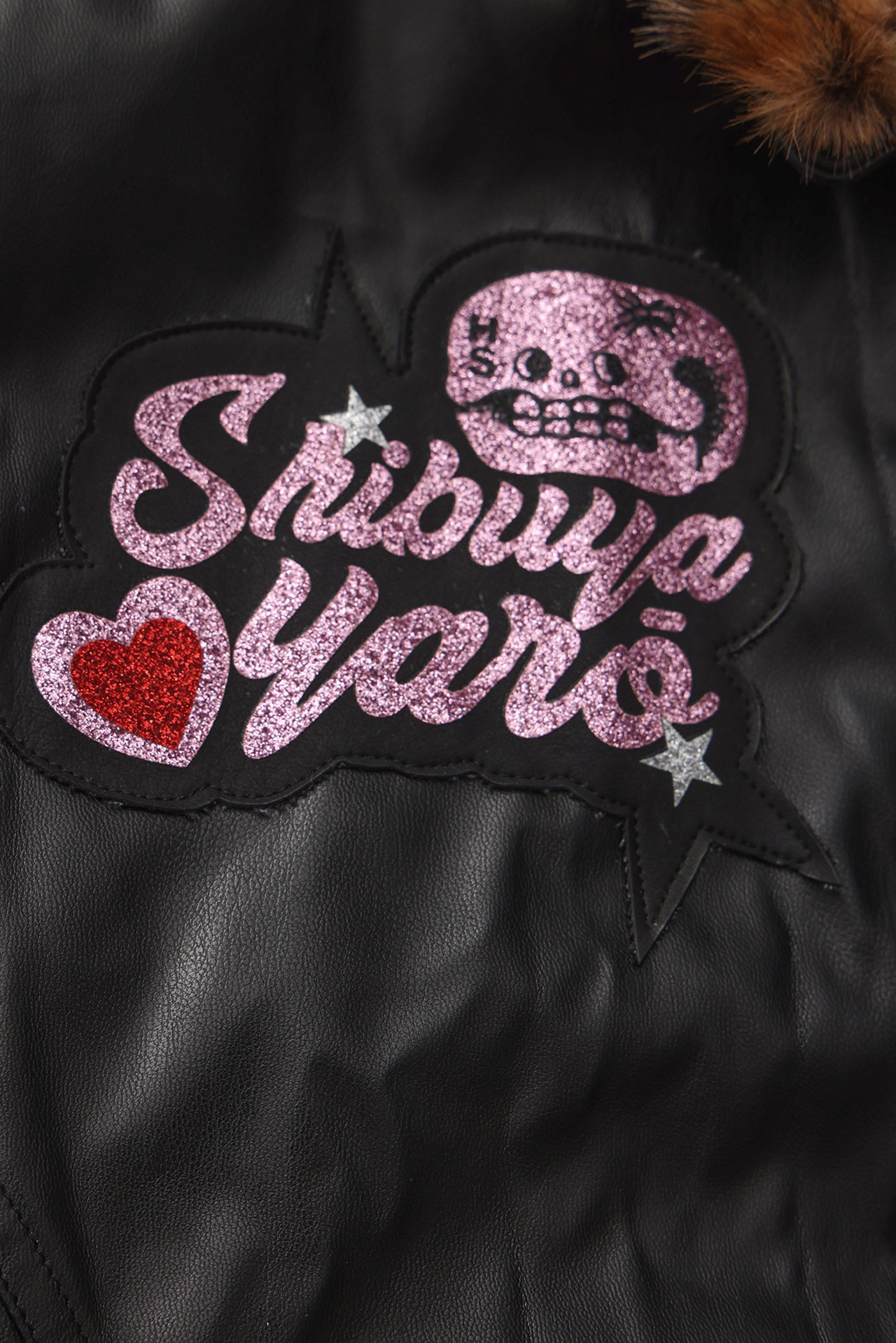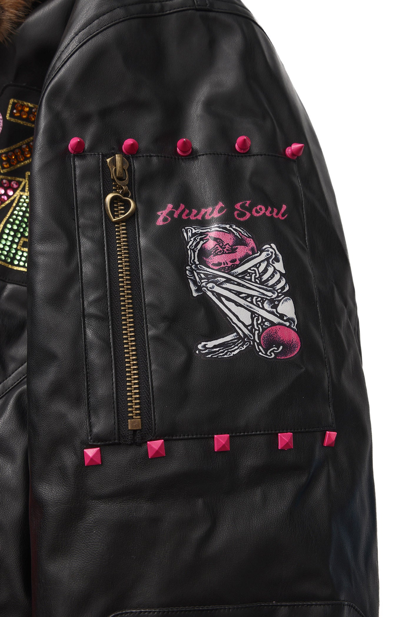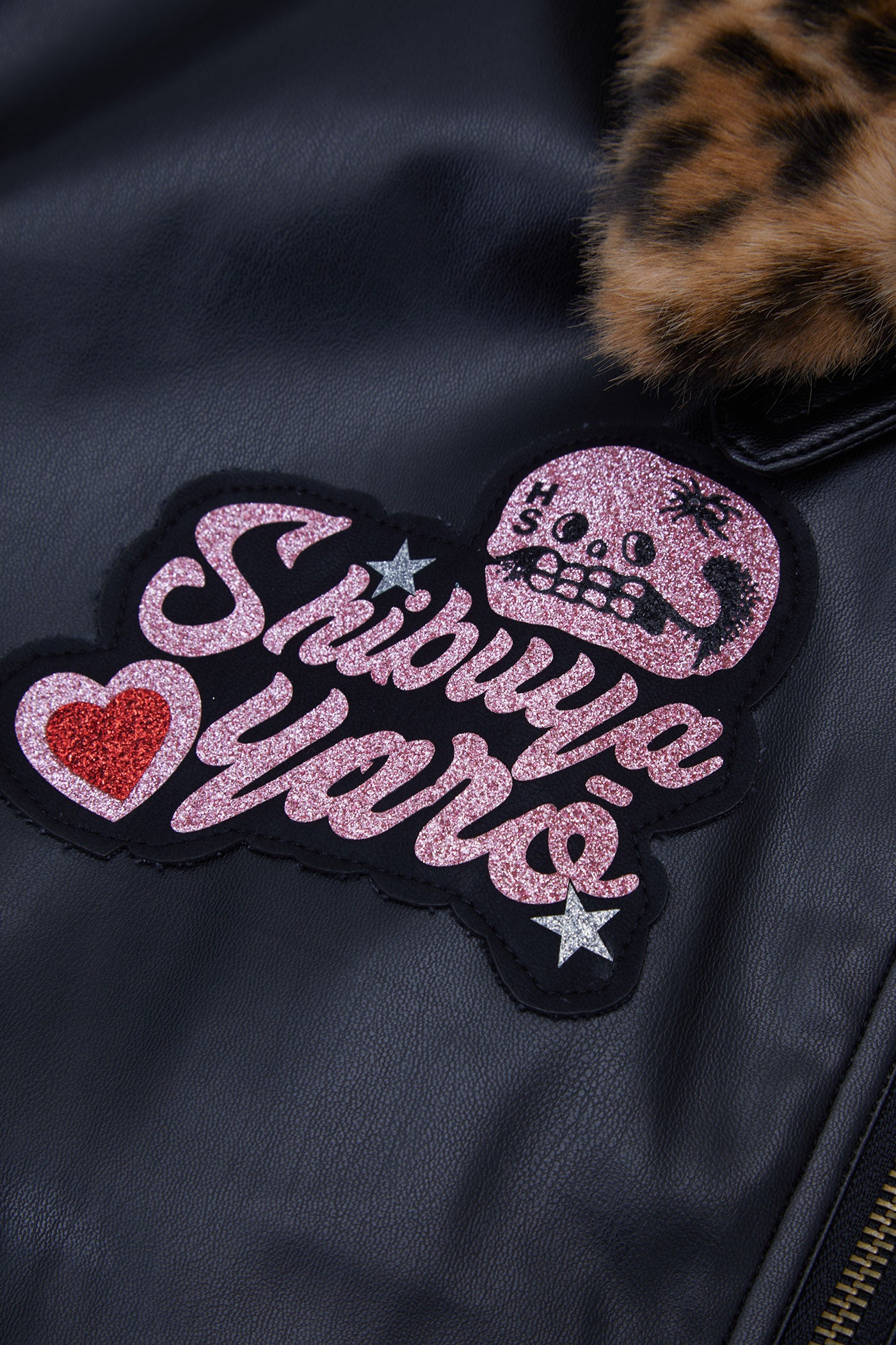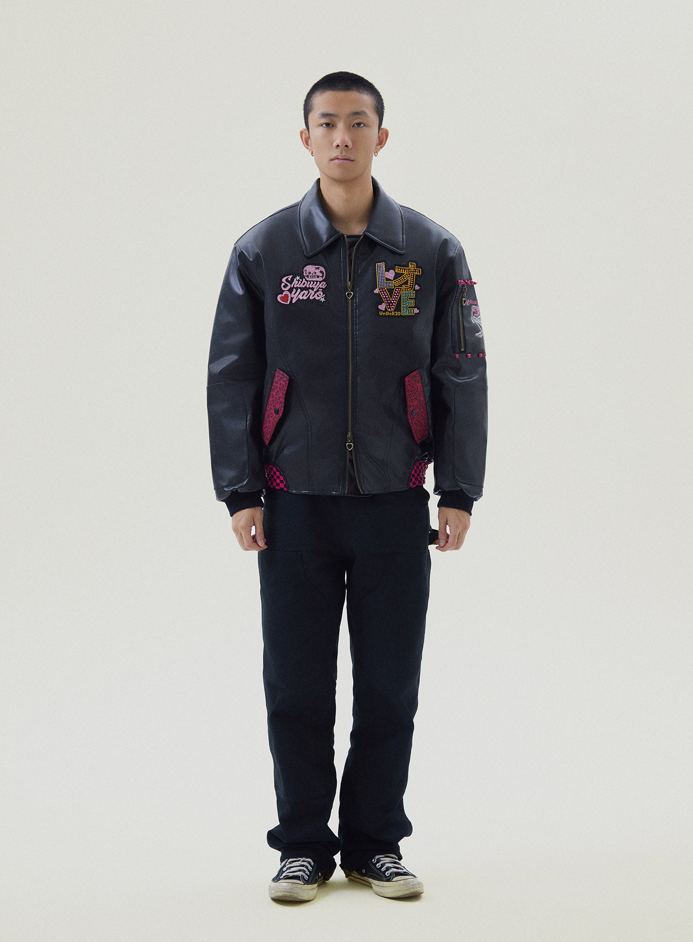 A reworked B-15 bomber injected with full-throttle Shibuya attitude. Black leather meets leopard faux fur (collar + lining) for that peak Tokyo Y2K heat. Glitter and rhinestones blast out “LOVE” and “Shibuya Yaro” on the chest — dramatic, extra, unapologetic. Checkerboard ribbing, pink studs and metal spikes push the punk voltage higher.