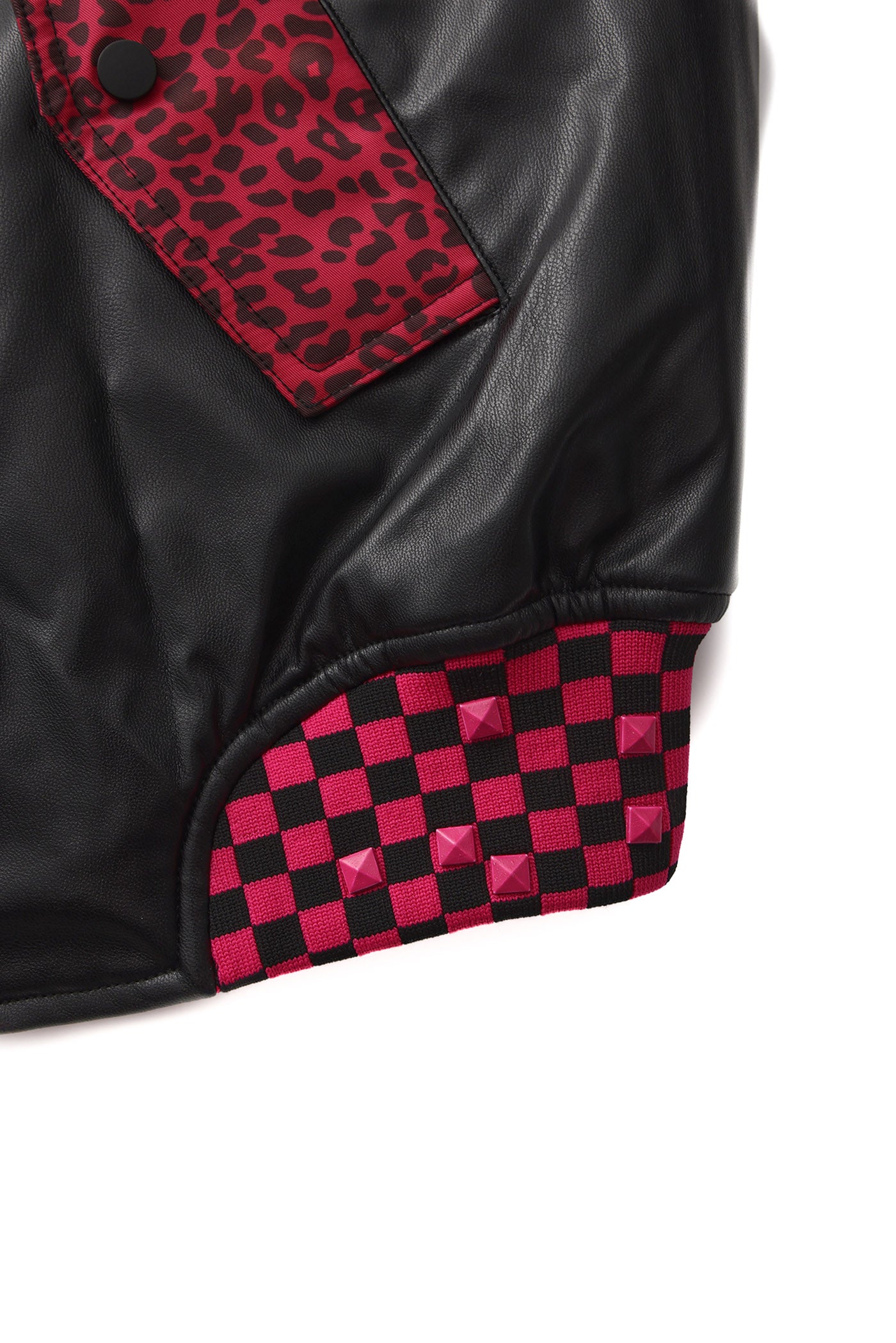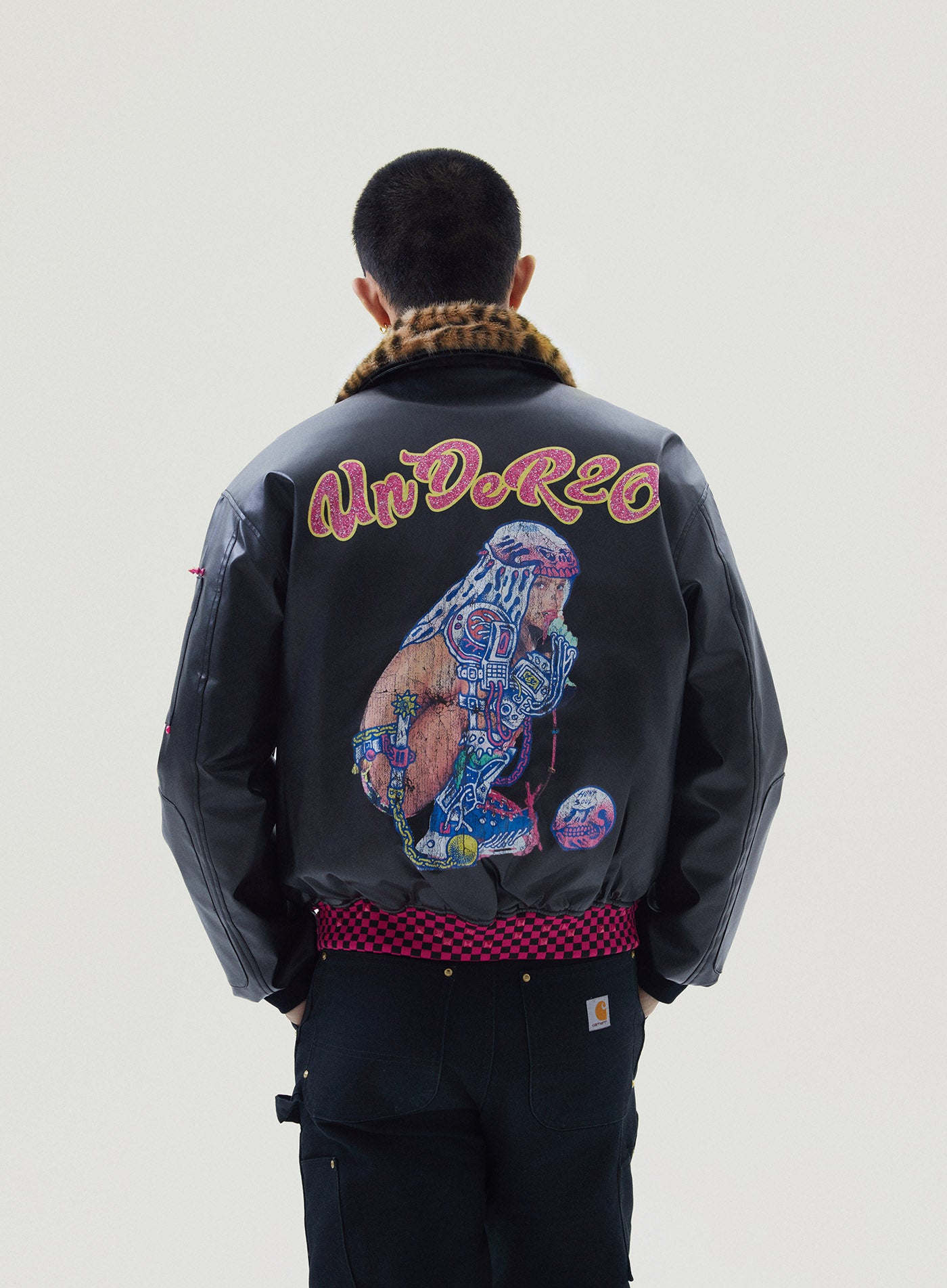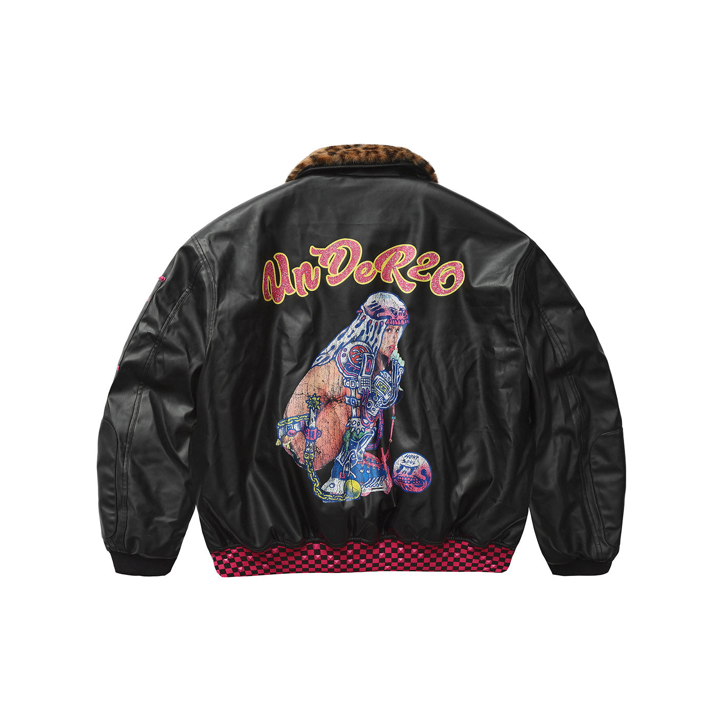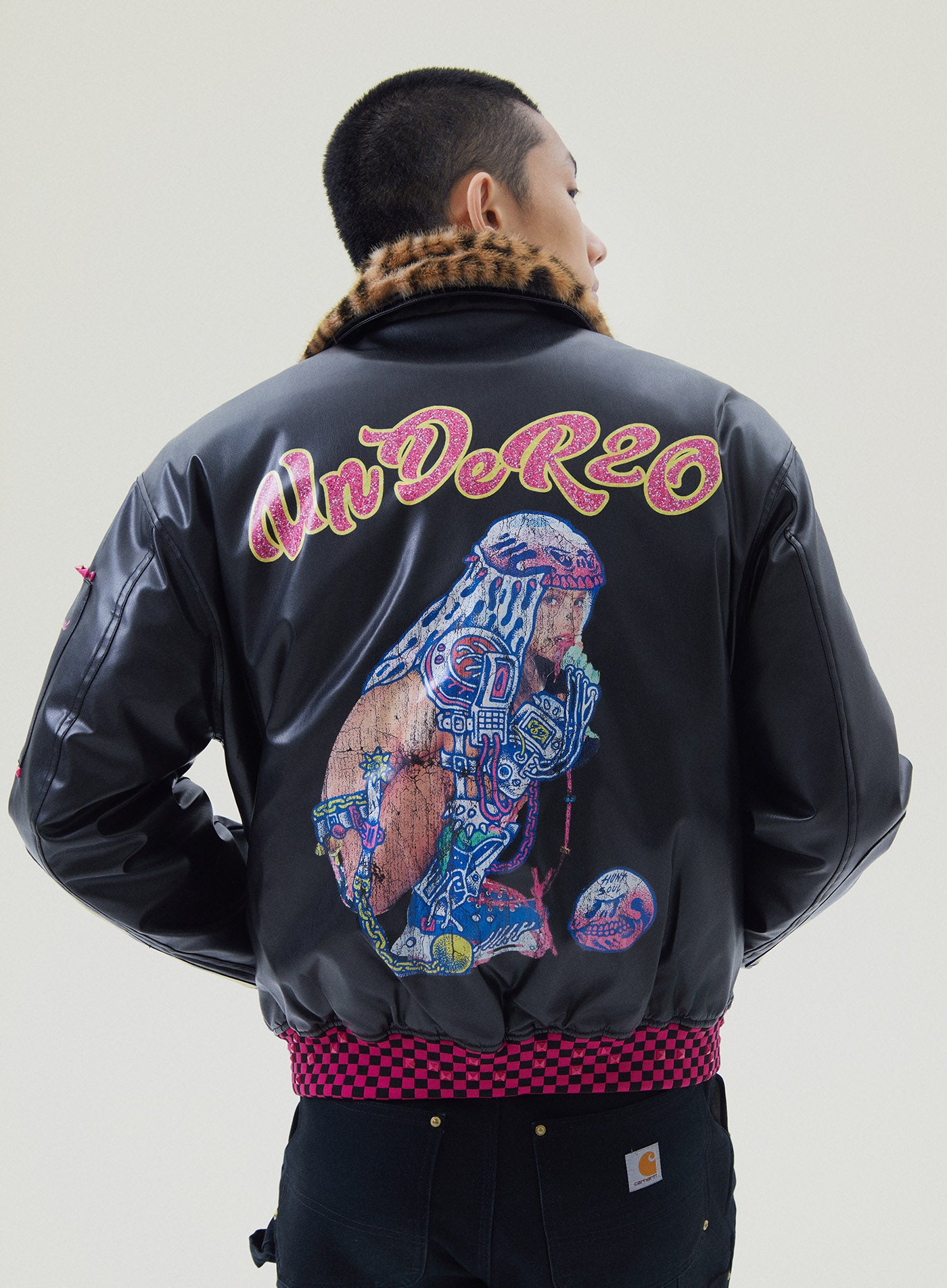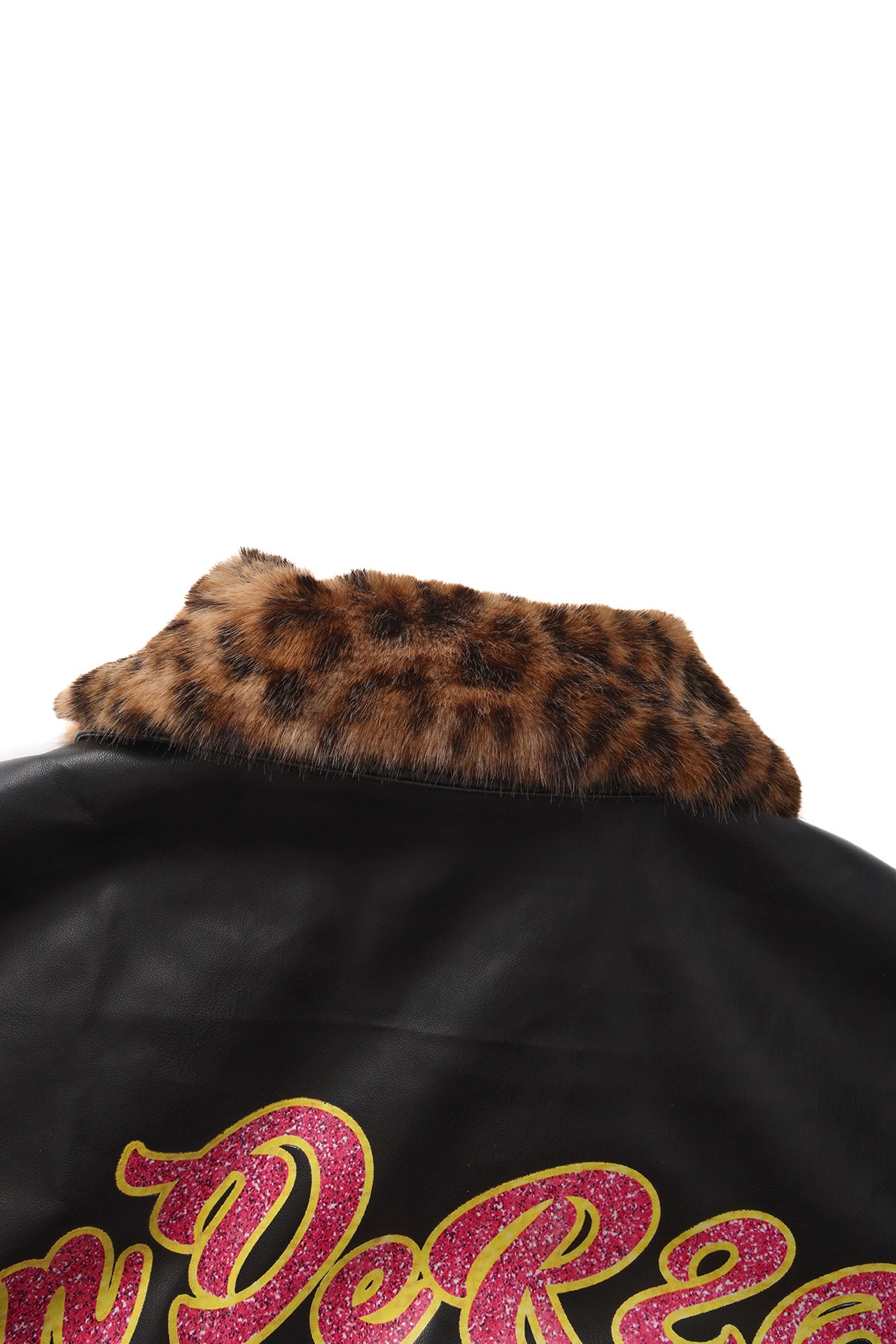 A reworked B-15 bomber injected with full-throttle Shibuya attitude. Black leather meets leopard faux fur (collar + lining) for that peak Tokyo Y2K heat. Glitter and rhinestones blast out “LOVE” and “Shibuya Yaro” on the chest — dramatic, extra, unapologetic. Checkerboard ribbing, pink studs and metal spikes push the punk voltage higher.
