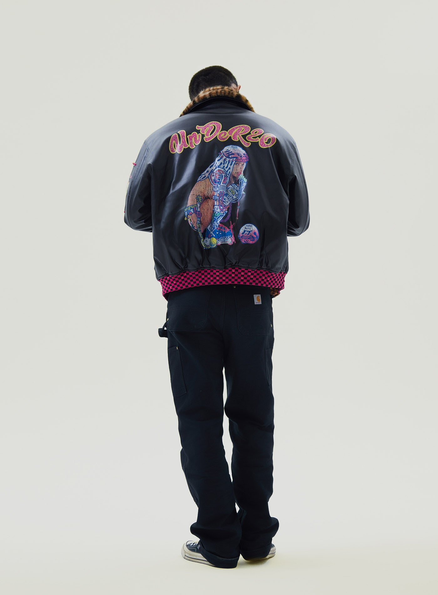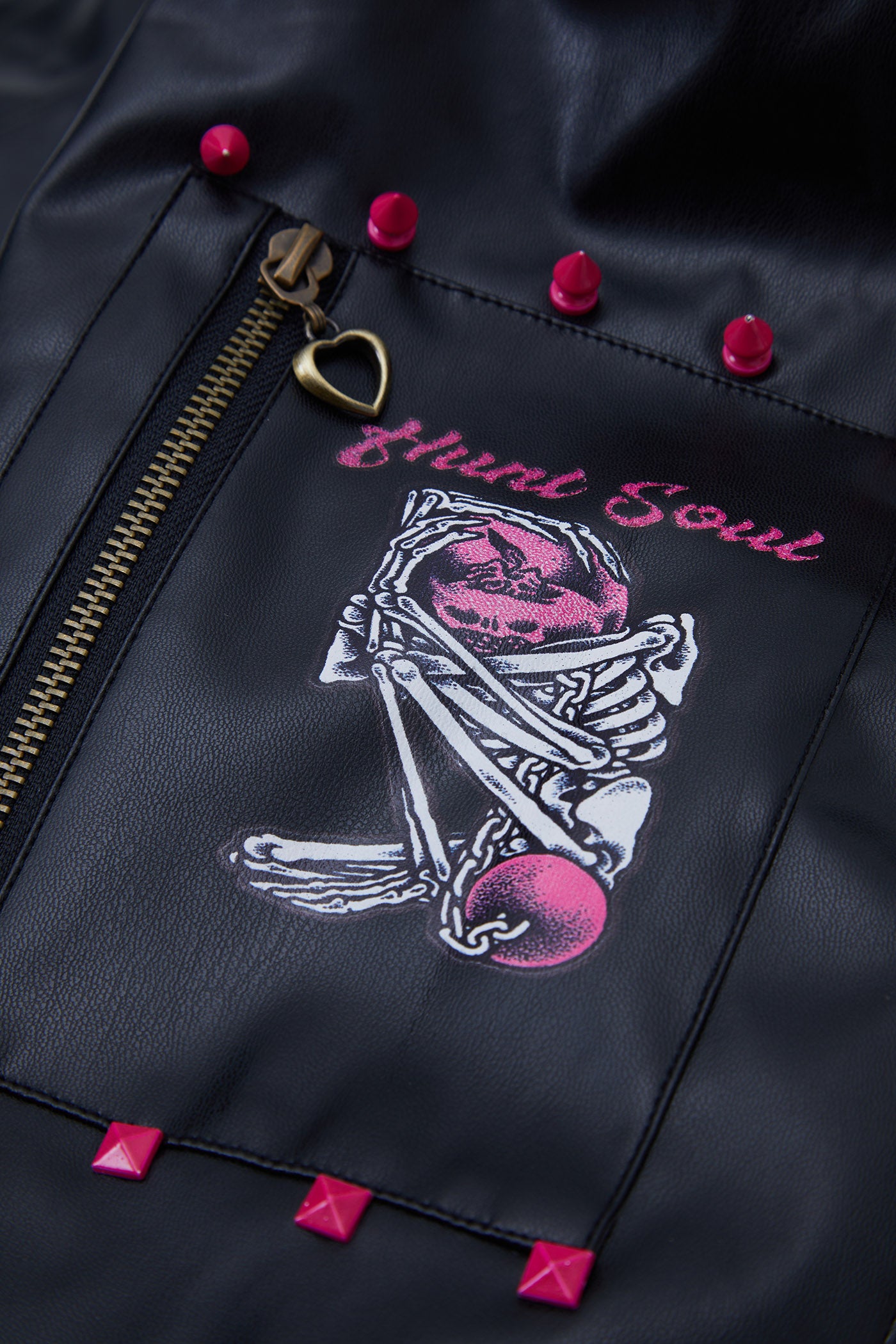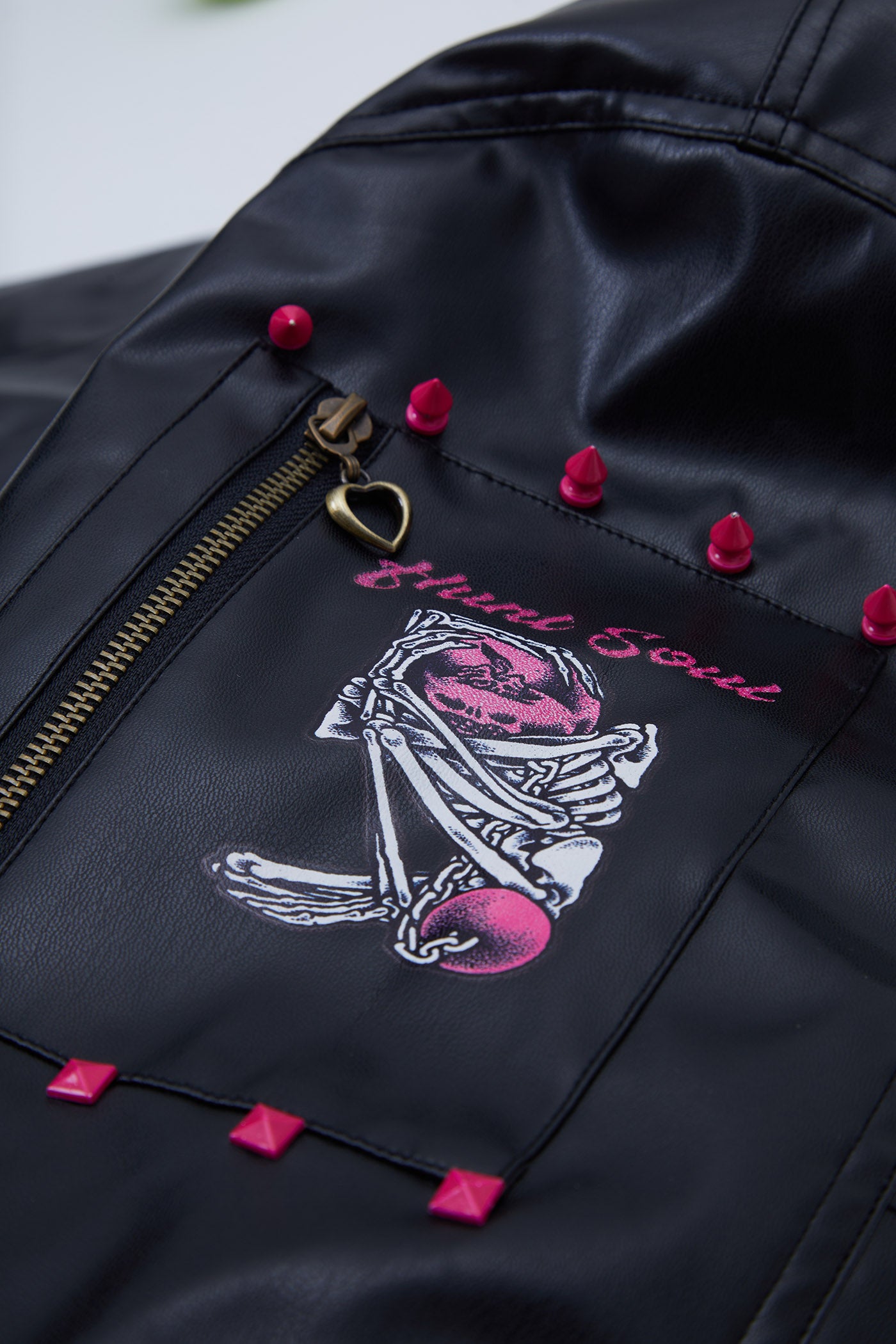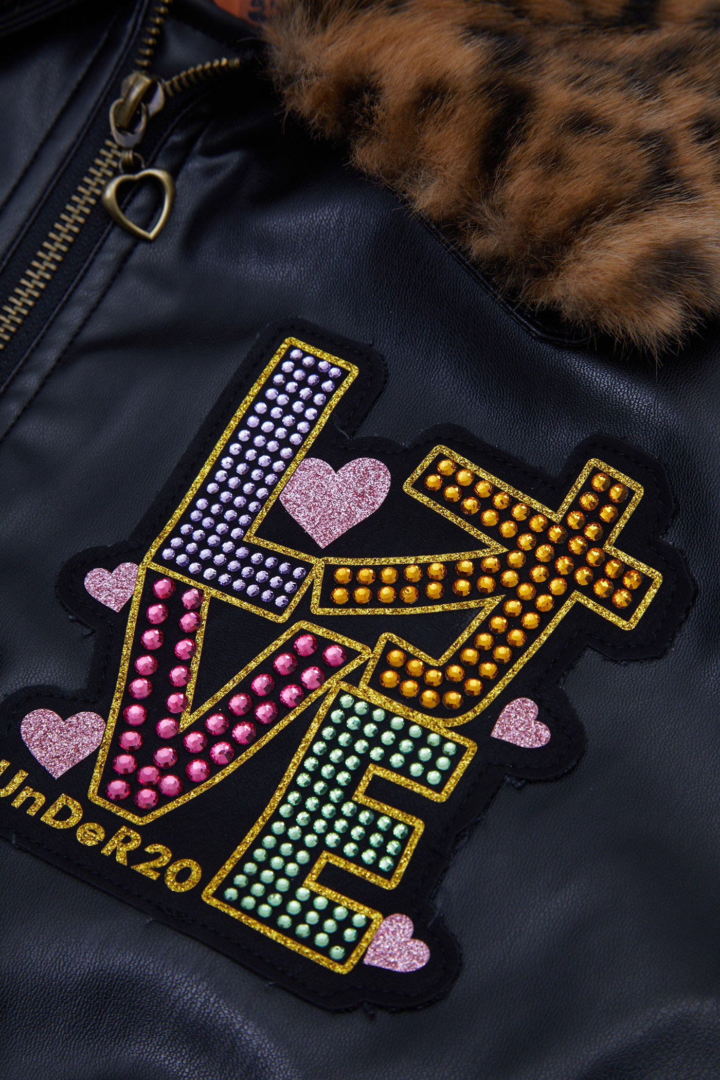 A reworked B-15 bomber injected with full-throttle Shibuya attitude. Black leather meets leopard faux fur (collar + lining) for that peak Tokyo Y2K heat. Glitter and rhinestones blast out “LOVE” and “Shibuya Yaro” on the chest — dramatic, extra, unapologetic. Checkerboard ribbing, pink studs and metal spikes push the punk voltage higher.
