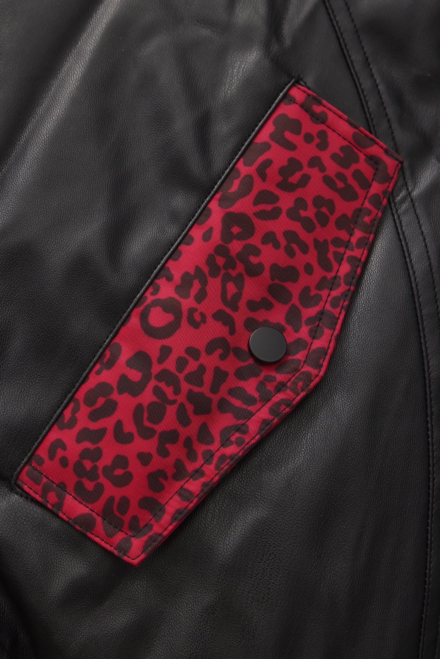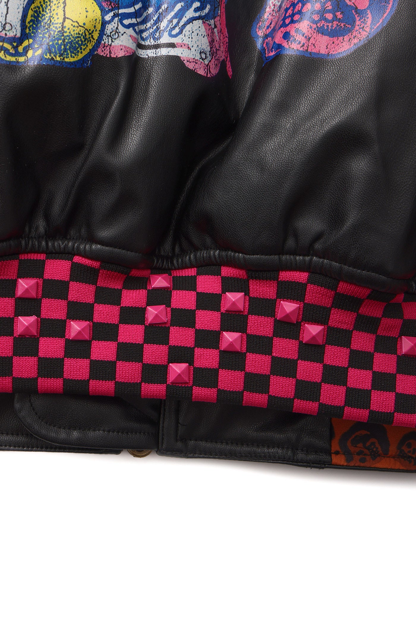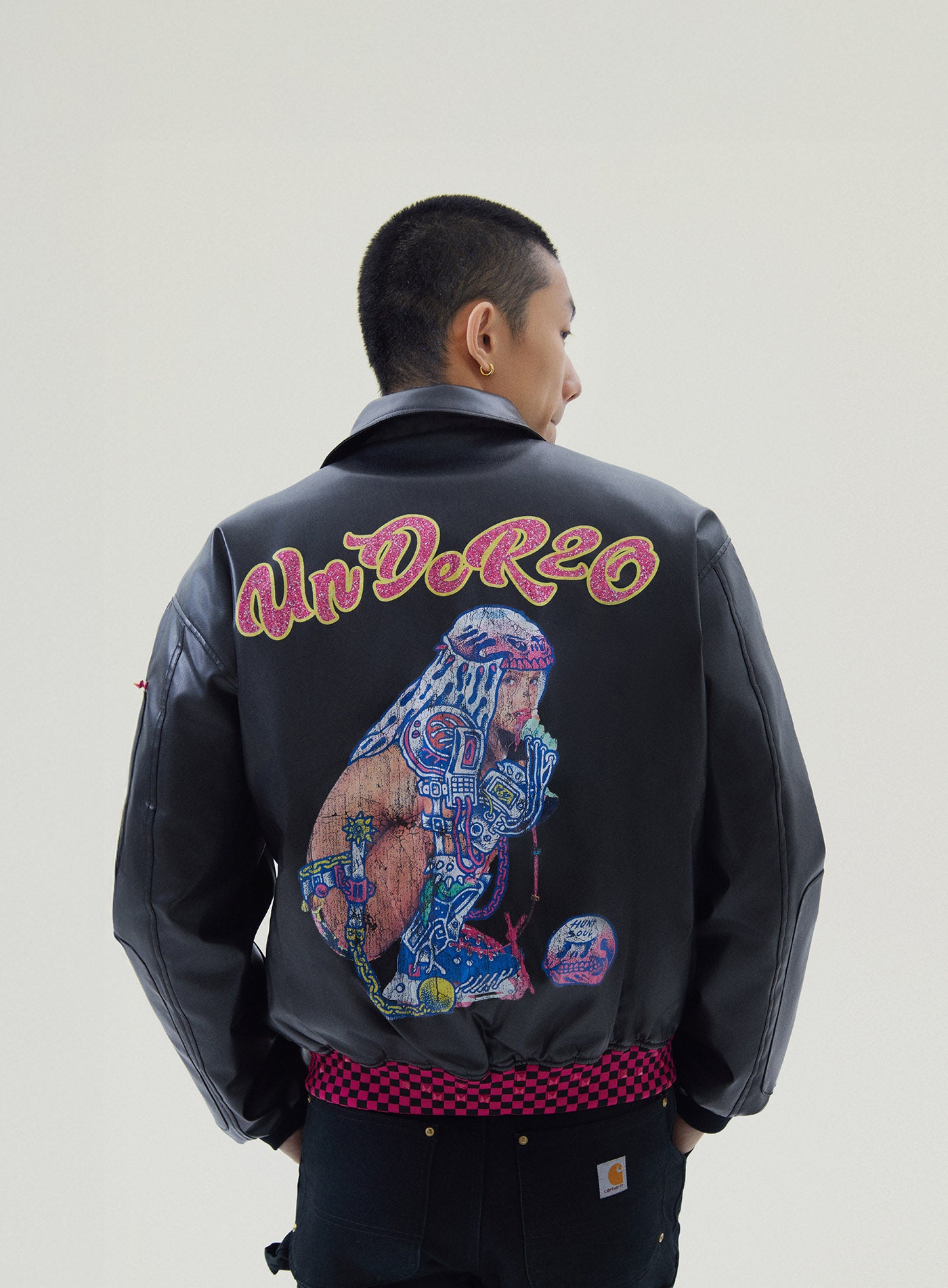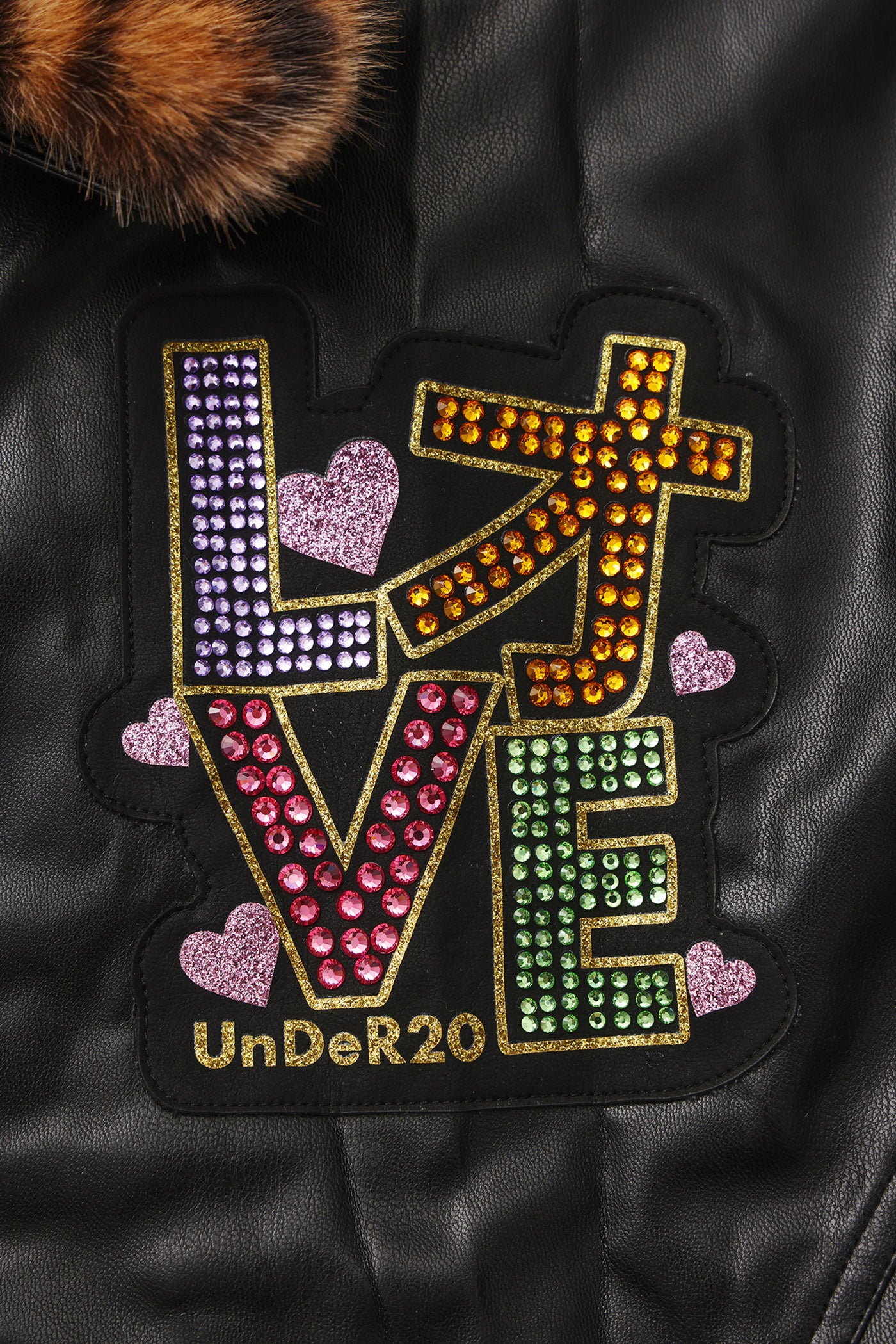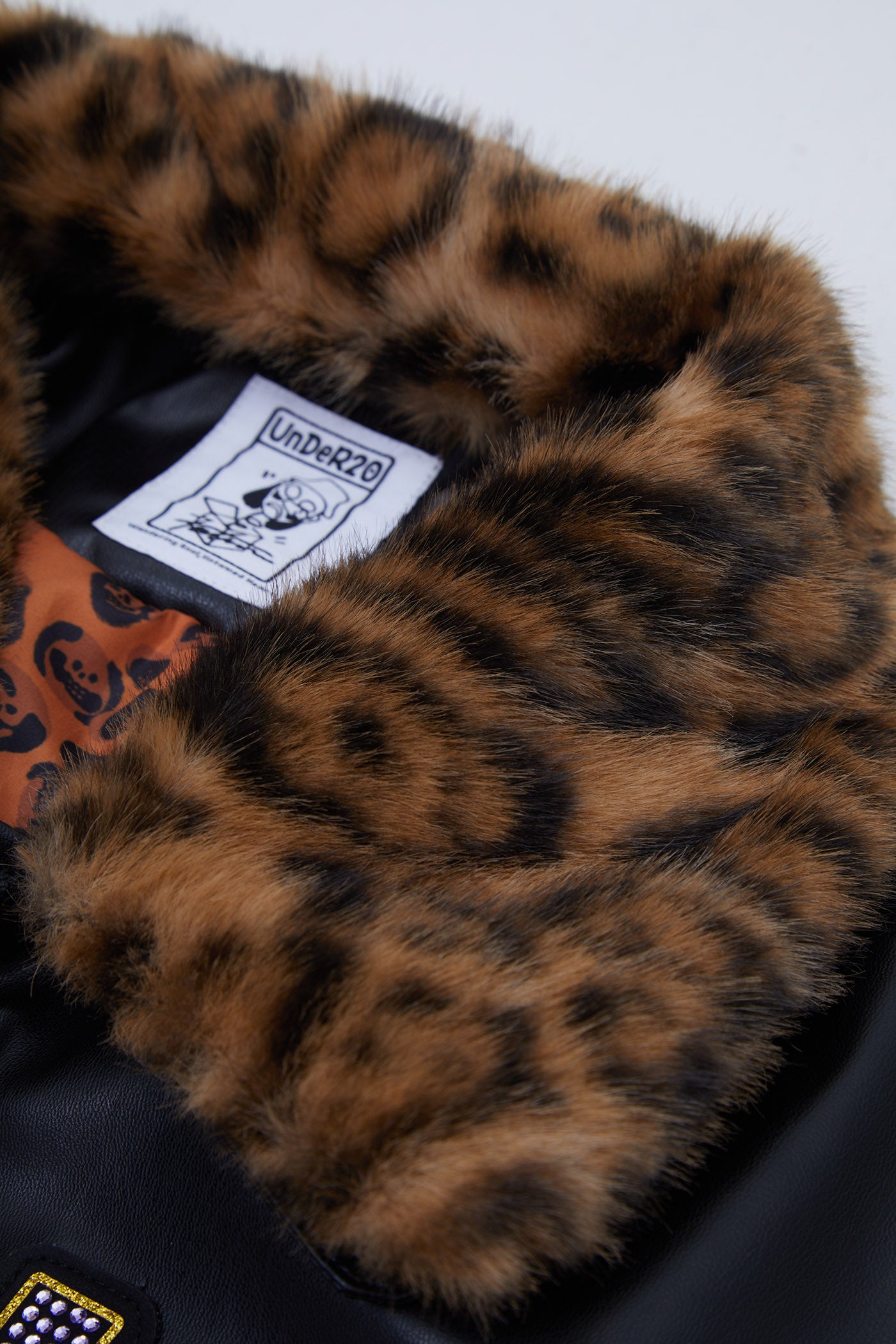 A reworked B-15 bomber injected with full-throttle Shibuya attitude. Black leather meets leopard faux fur (collar + lining) for that peak Tokyo Y2K heat. Glitter and rhinestones blast out “LOVE” and “Shibuya Yaro” on the chest — dramatic, extra, unapologetic. Checkerboard ribbing, pink studs and metal spikes push the punk voltage higher.